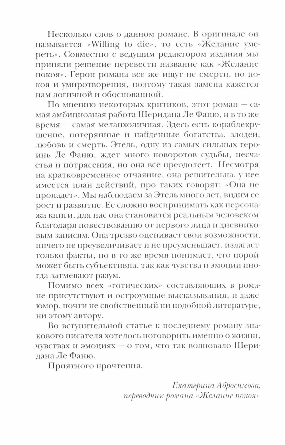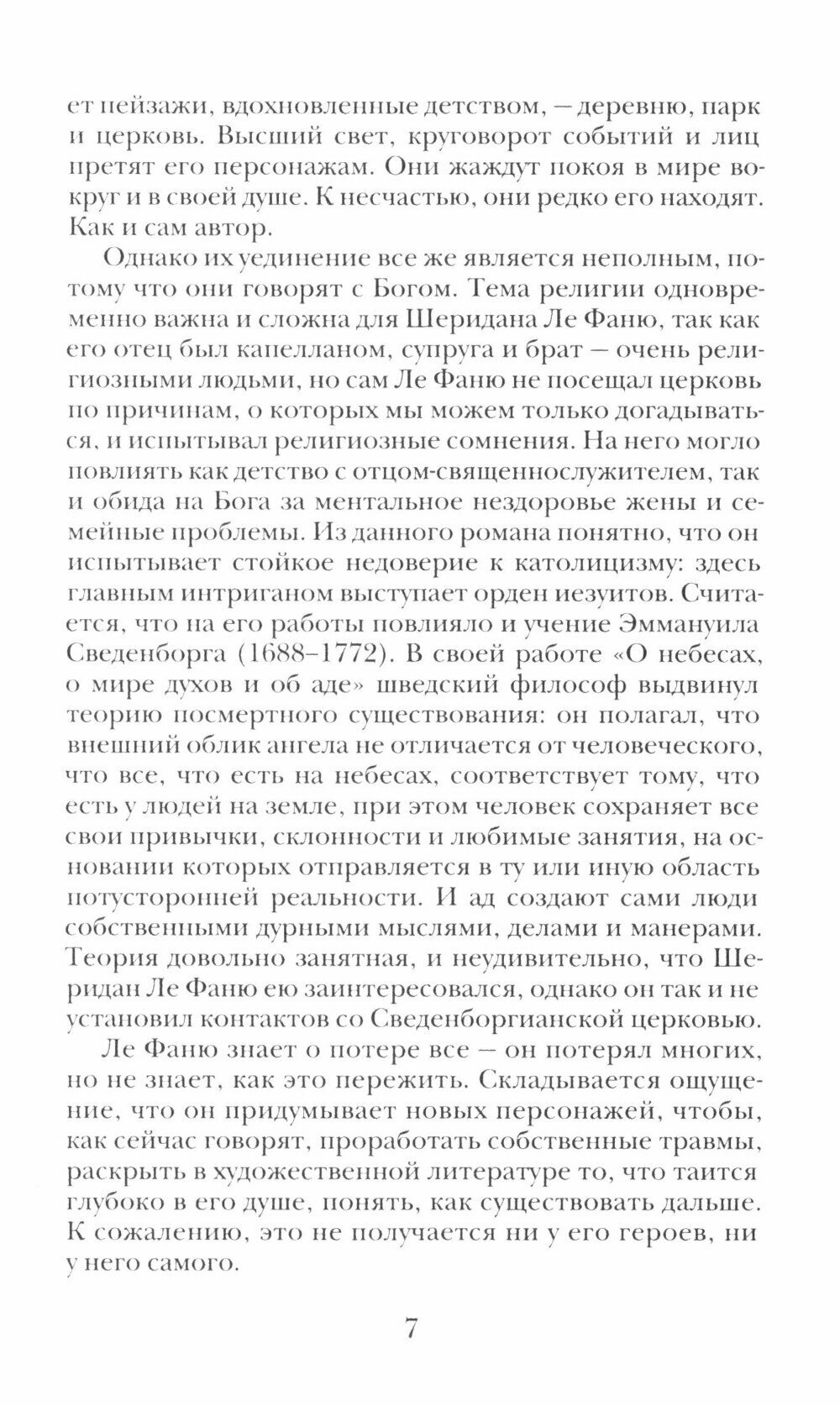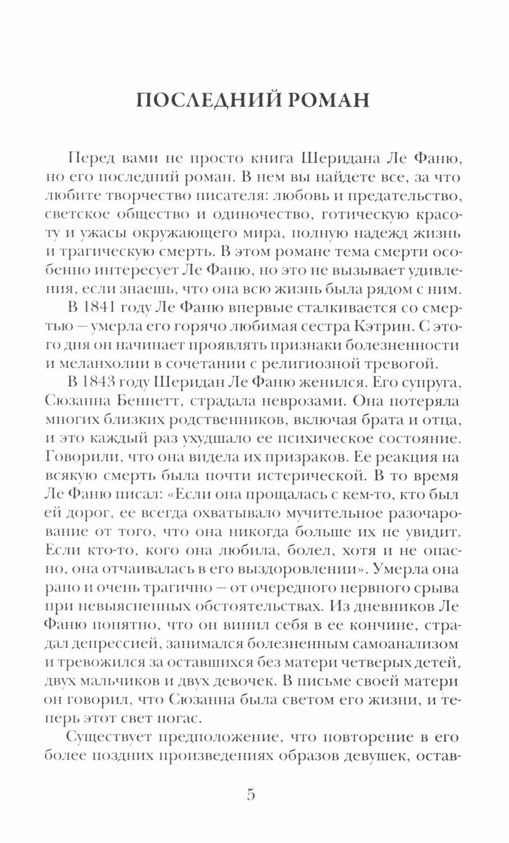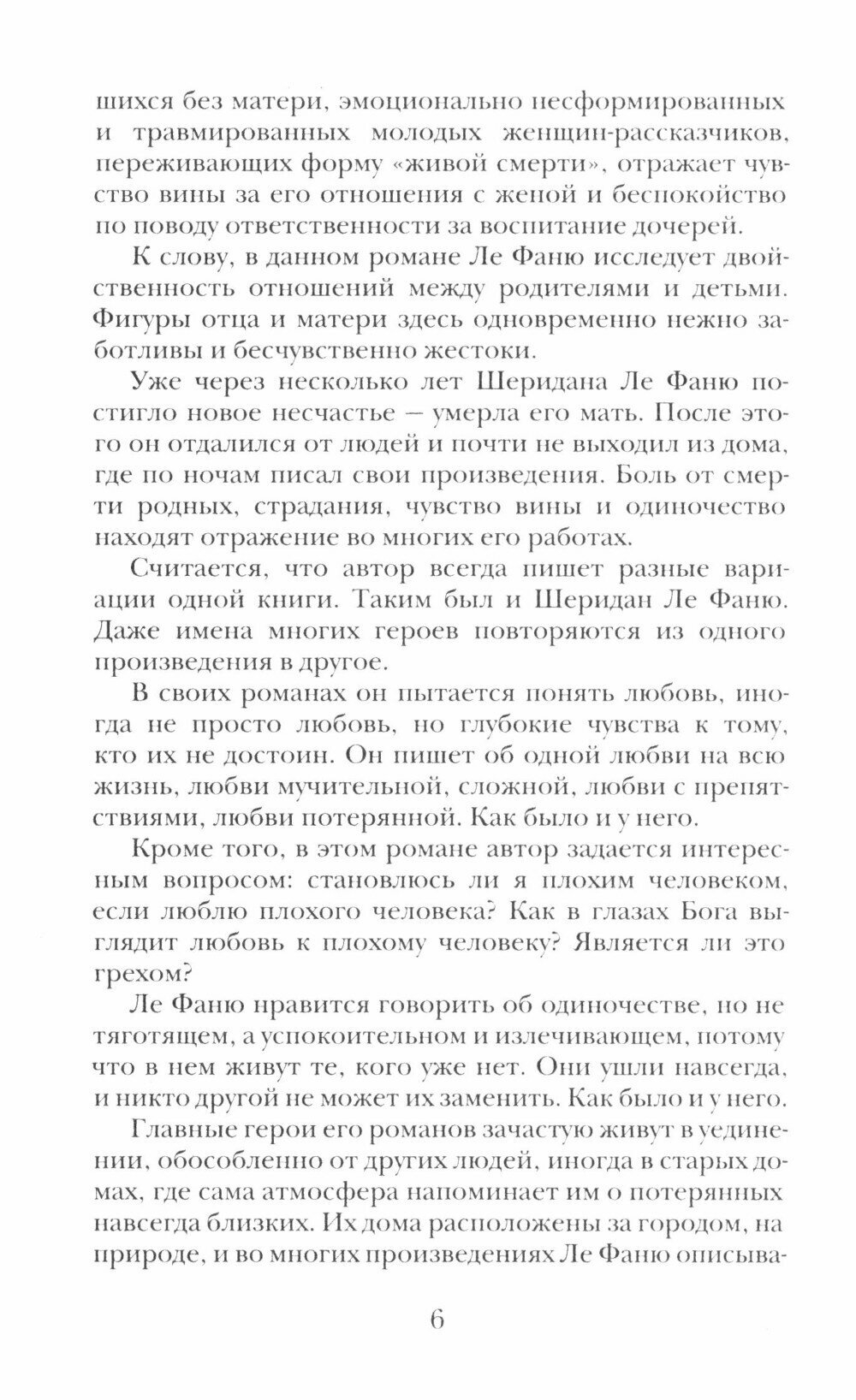 Почему зачастую человек столь разительно отличается от благородного создания, каким мог бы стать или был когда-то? Может ли мужчина, который когда-то был идолом, полностью исчезнуть из этого таинственного ковчега – женского сердца? На эти и другие вопросы пытается найти ответ Ле Фаню, писатель, знавший об одиночестве, вероятно, лучше всех своих современников.