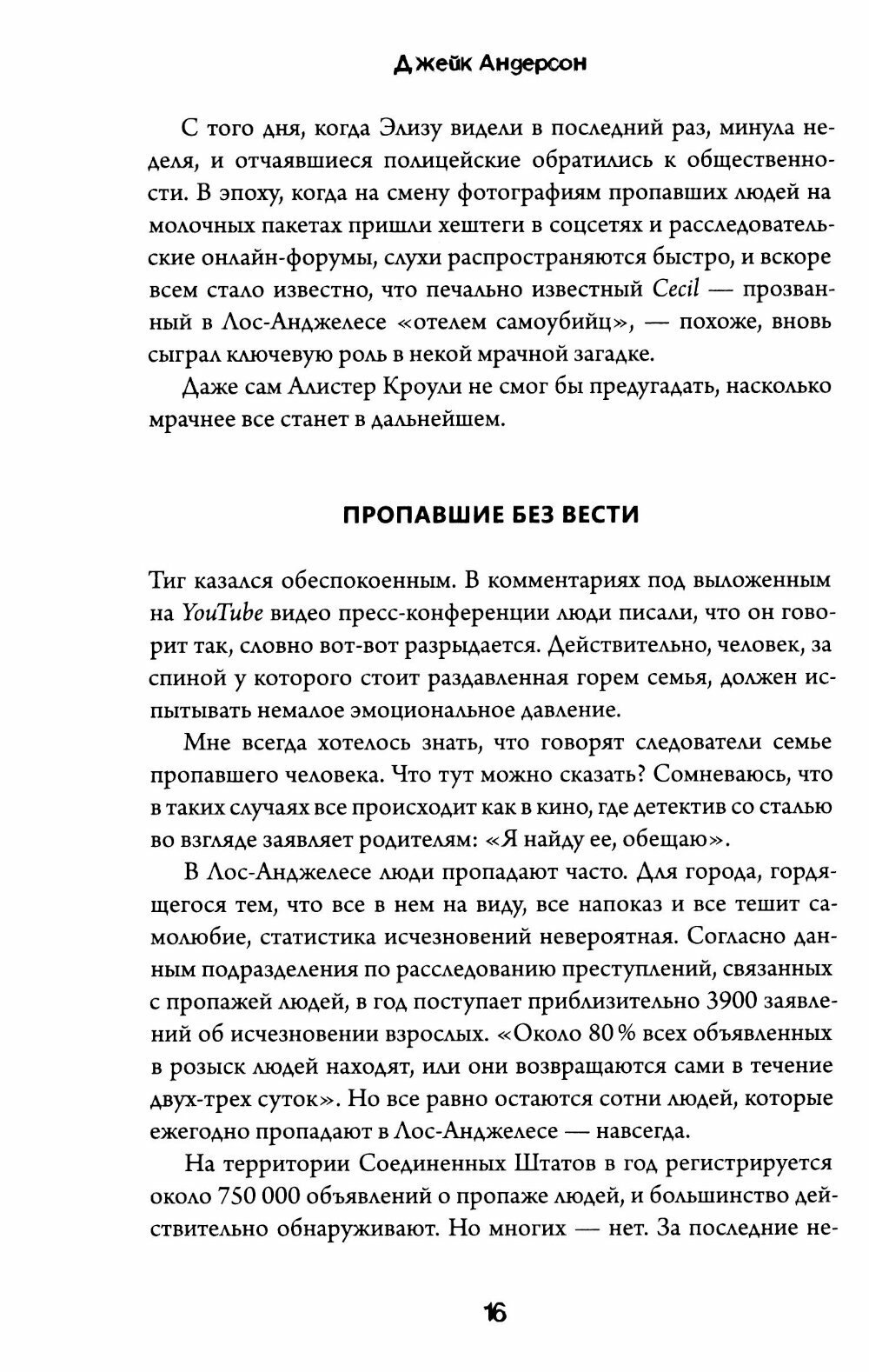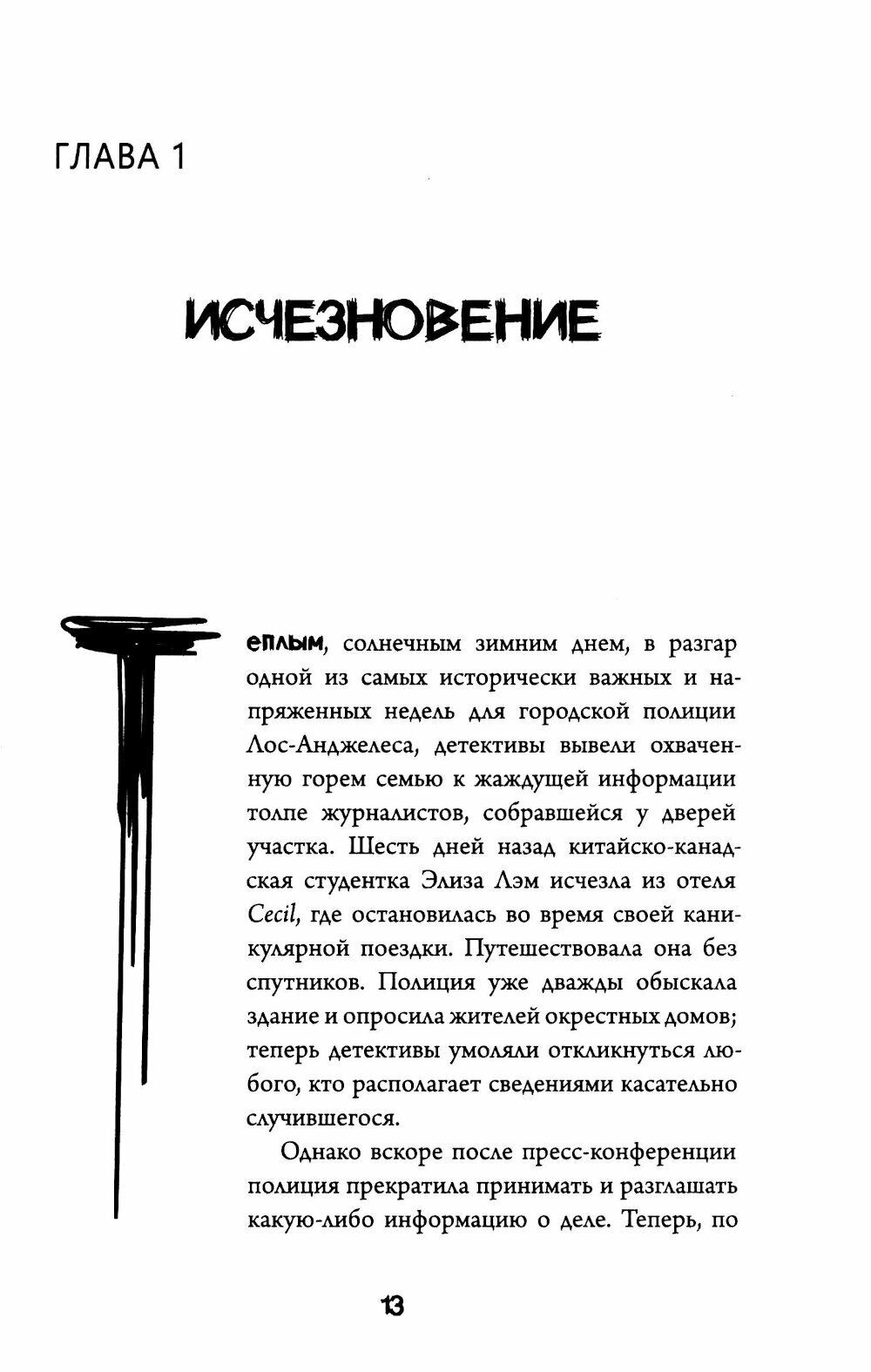 Увлекательное расследование свободного журналиста Джейка Андерсона посвящено загадочному исчезновению и смерти студентки Элизы Лэм, страдавшей биполярным расстройством. Случай произошел в 2013 году в отеле с дурной репутацией Cecil. Полицейское расследование окончилось ничем, и с тех пор множество людей по всему миру пытались раскрыть это дело самостоятельно.