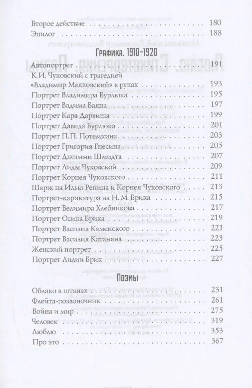 В книгу включена ранняя лирика Маяковского, трагедия "Владимир Маяковский", поэмы о любви "Облако в штанах", "Флейта-позвоночник", "Люблю", "Про это", а также "Война и мир", "Человек" и 20 портретов коллег, друзей, любимых поэта, выполненных Владимиром Маяковским. Среди них – женский портрет неизвестной, предположительно Марии Денисовой, скорее всего, также руки Владимира Маяковского.