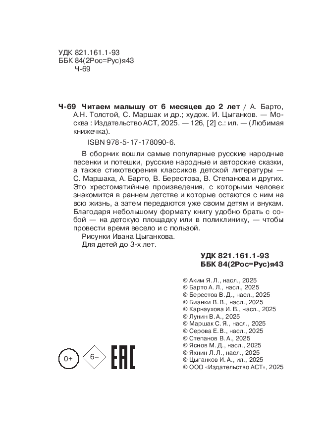 В сборник вошли самые популярные русские народные песенки и потешки, русские народные и авторские сказки, а также стихотворения классиков детской литературы – С. Марашка, А. Барто, В. Берестова, В. Степанова и других. Это хрестоматийные произведения, с которыми человек знакомится в раннем детстве и которые остаются с ним на всю жизнь, а затем передаются уже своим детям и внукам. Благодаря небольшому формату книгу удобно брать с собой – в поликлинику, на детскую площадку или в поликлинику, – чтобы провести время весело и с пользой.
