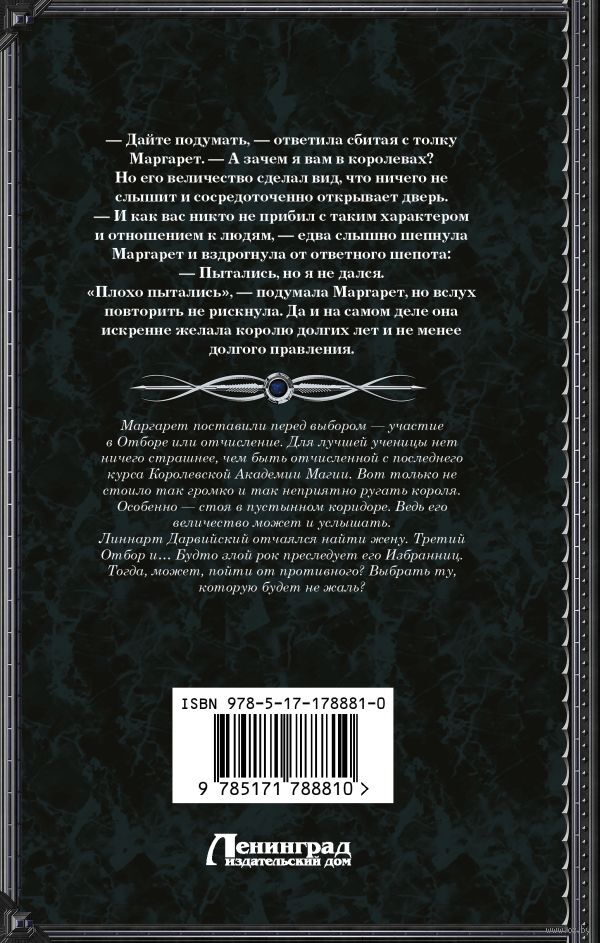 Маргарет поставили перед выбором – участие в Отборе или отчисление. Для лучшей ученицы нет ничего страшнее, чем быть отчисленной с последнего курса Королевской Академии Магии. Вот только не стоило так громко и так неприятно ругать короля. Особенно – стоя в пустынном коридоре. Ведь его величество может и услышать. Линнарт Дарвийский отчаялся найти жену. Третий Отбор и… Будто злой рок преследует его Избранниц. Тогда, может, пойти от противного? Выбрать ту, которую будет не жаль?