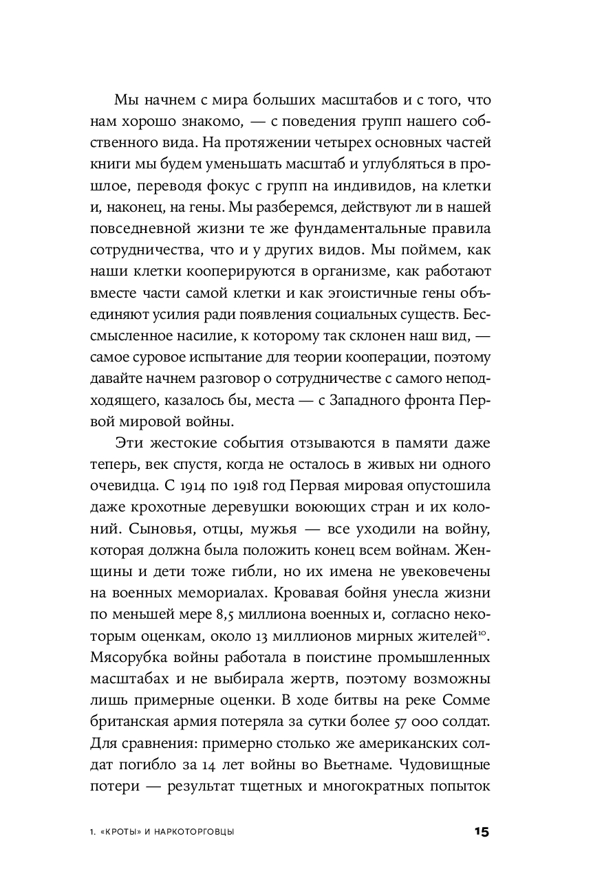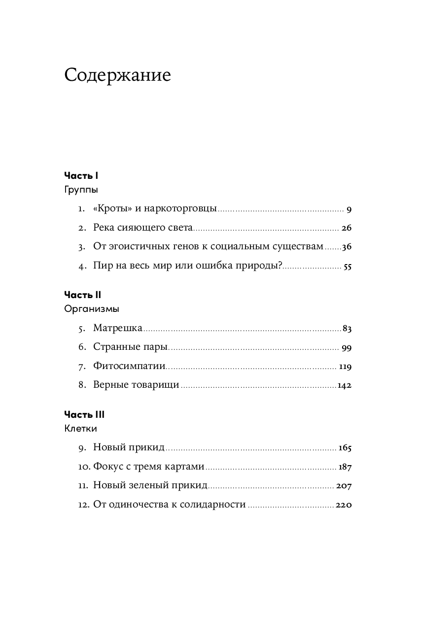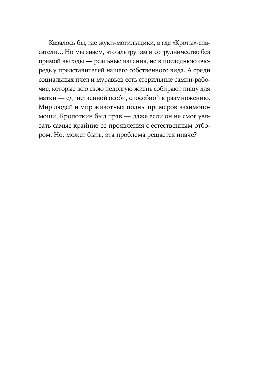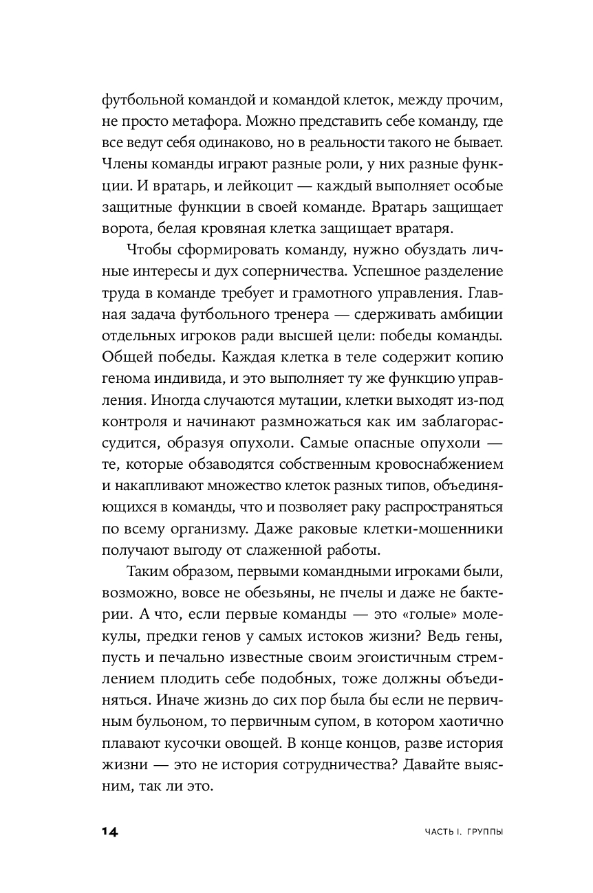 На таких неожиданных примерах, как поведение крыс и ворон, строение земляных червей и лишайников, кипение клеточного бульона и даже взаимодействие среди пиратов и благотворительных организаций, автор показывает, что, так же как гены и клетки, каждое существо стремится к сотрудничеству – впрочем, в собственных интересах. И противоречия тут нет: ведь именно объединение с кем-то другим с целью выгоды и предотвращения опасности дало начало жизни и способствовало процессу эволюции. В склонности людей к взаимопомощи есть глубокий смысл. Во всех нас зашит некий биологический закон, побуждающий нас сотрудничать. А вот бессмысленное насилие, к которому иногда так склонен наш вид, – самое суровое испытание для выживания человека как вида.