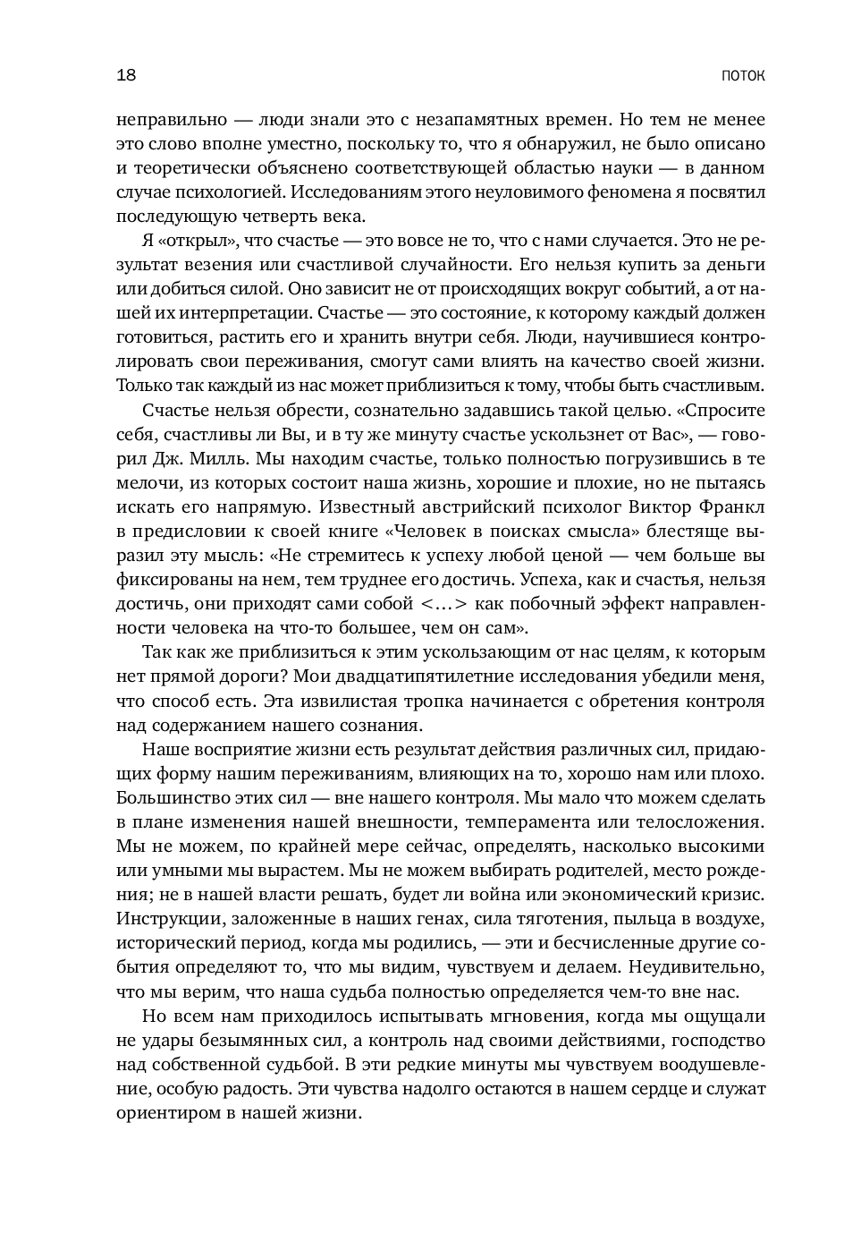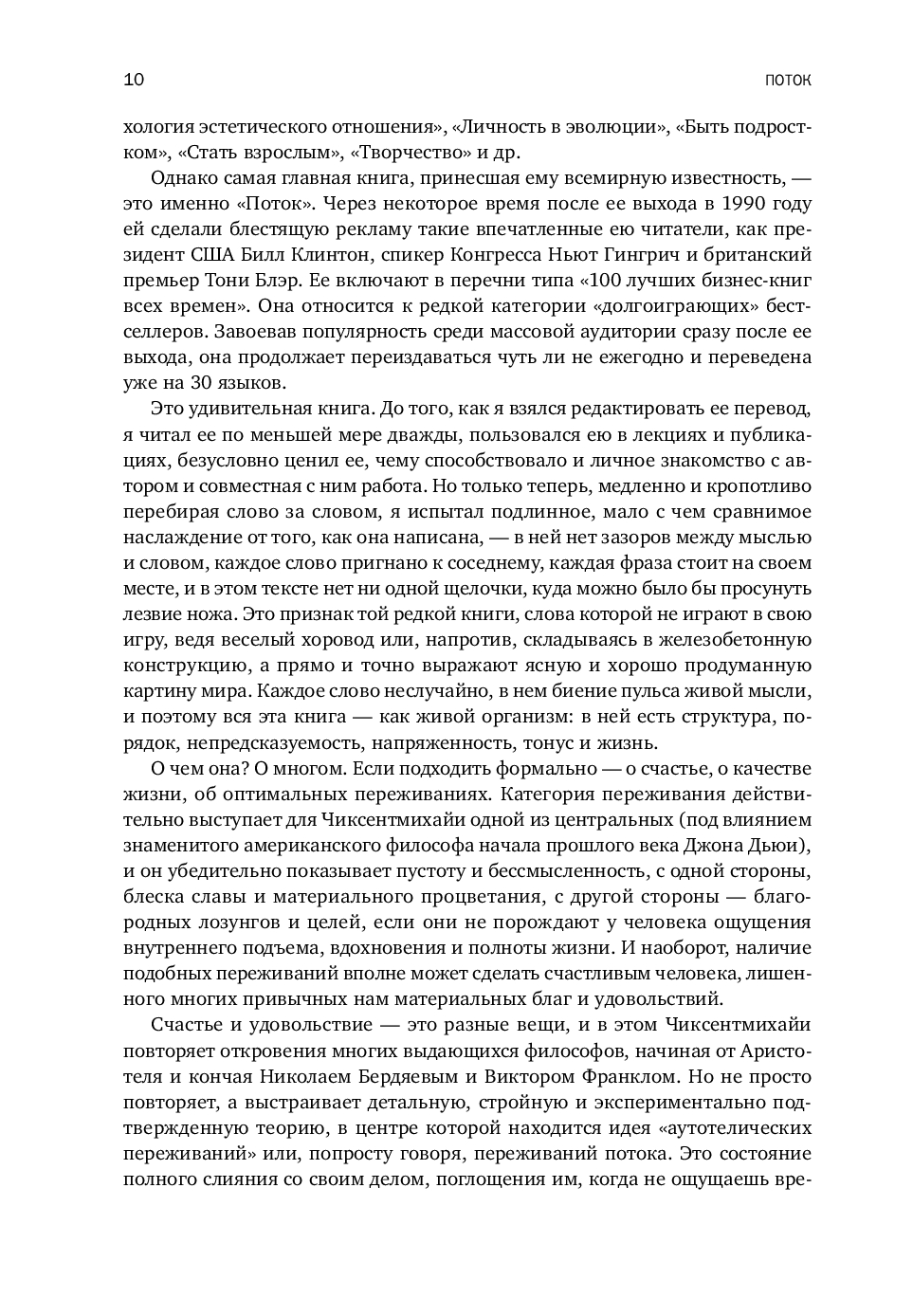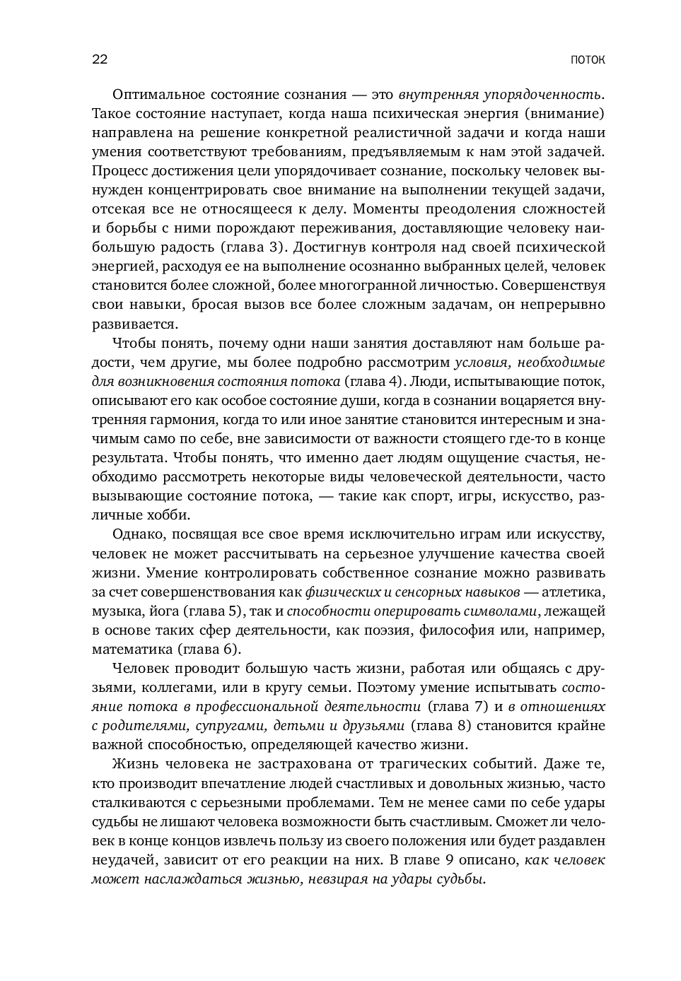 Автор выстраивает детальную, стройную и экспериментально подтвержденную теорию, в центре которой находится идея потока. Это состояние полного слияния со своим делом, поглощения им, когда не ощущаешь времени, самого себя, когда вместо усталости возникает постоянный прилив энергии.