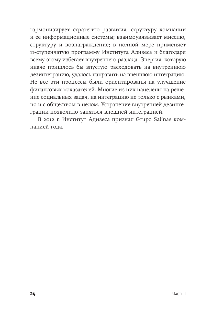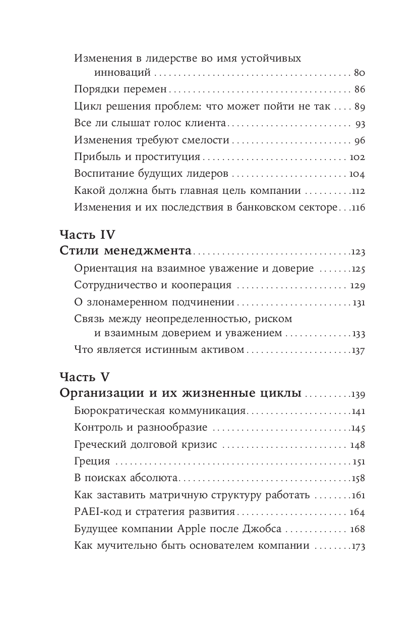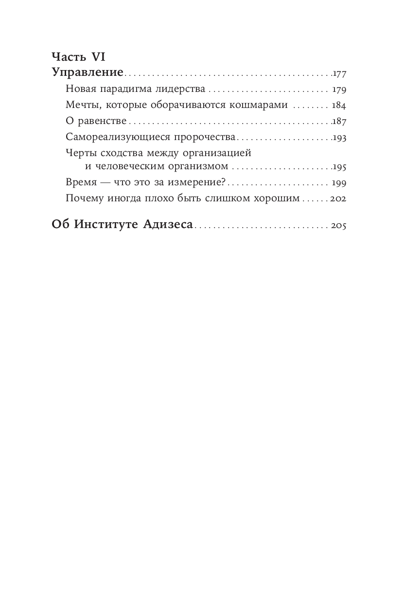 Эта книга – сборник наблюдений доктора Ицхака Адизеса за более чем 50-летний опыт консультирования крупнейших организаций. Они касаются самых важных аспектов менеджмента: принятия решений, образования в области управления, жизненных циклов организаций, стилей менеджмента. Также он разбирает наиболее распространенные проблемы лидерства и затрагивает вопросы коммуникации и контроля.