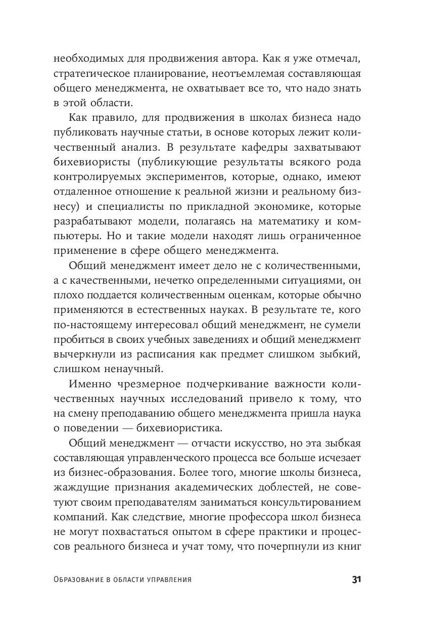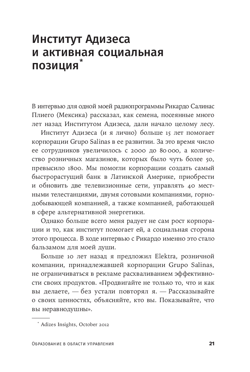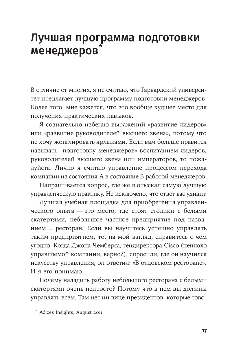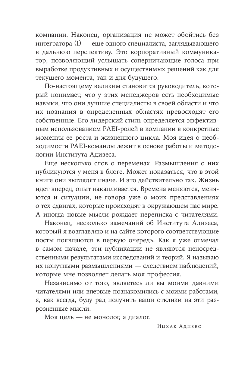 Эта книга – сборник наблюдений доктора Ицхака Адизеса за более чем 50-летний опыт консультирования крупнейших организаций. Они касаются самых важных аспектов менеджмента: принятия решений, образования в области управления, жизненных циклов организаций, стилей менеджмента. Также он разбирает наиболее распространенные проблемы лидерства и затрагивает вопросы коммуникации и контроля.