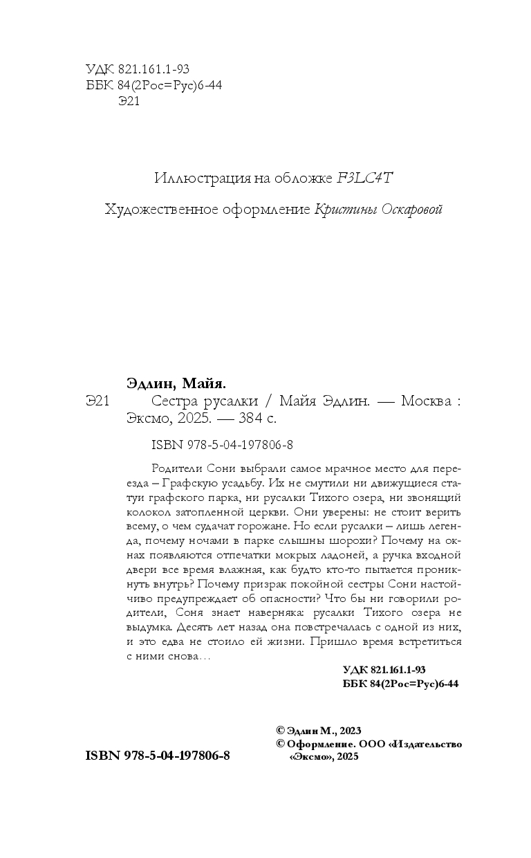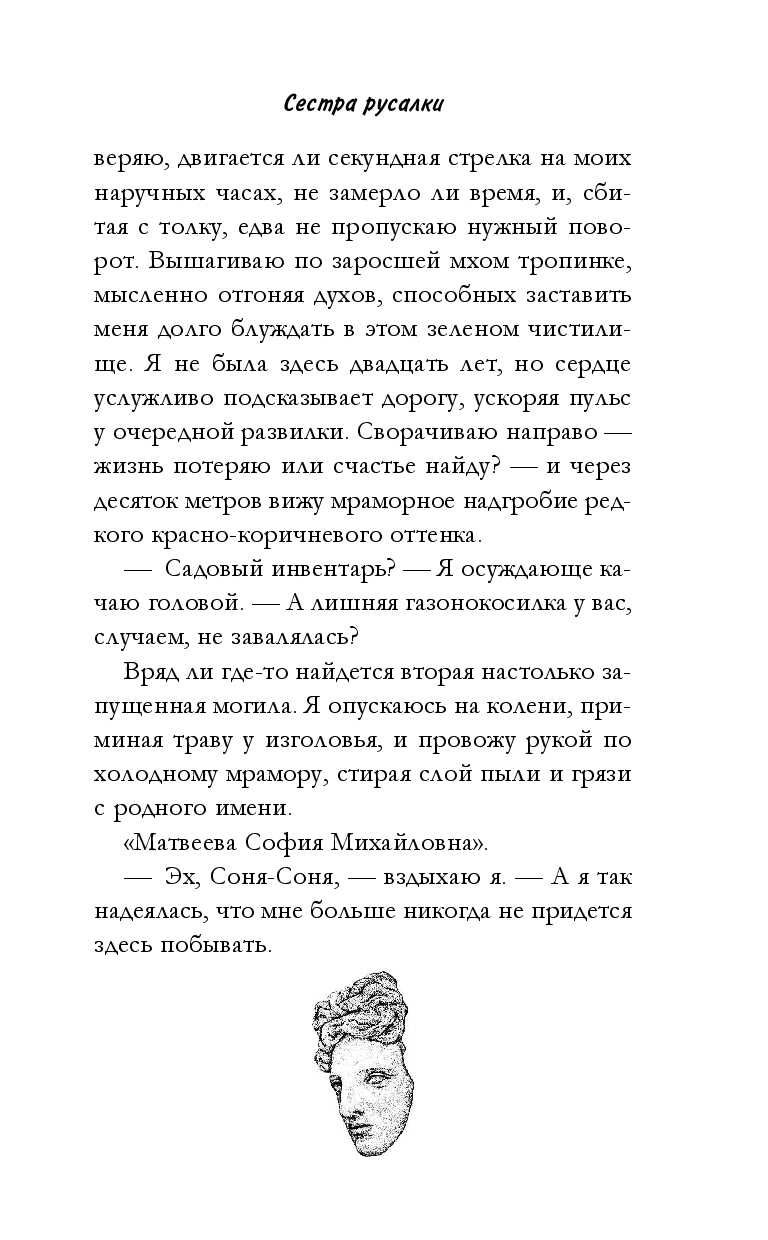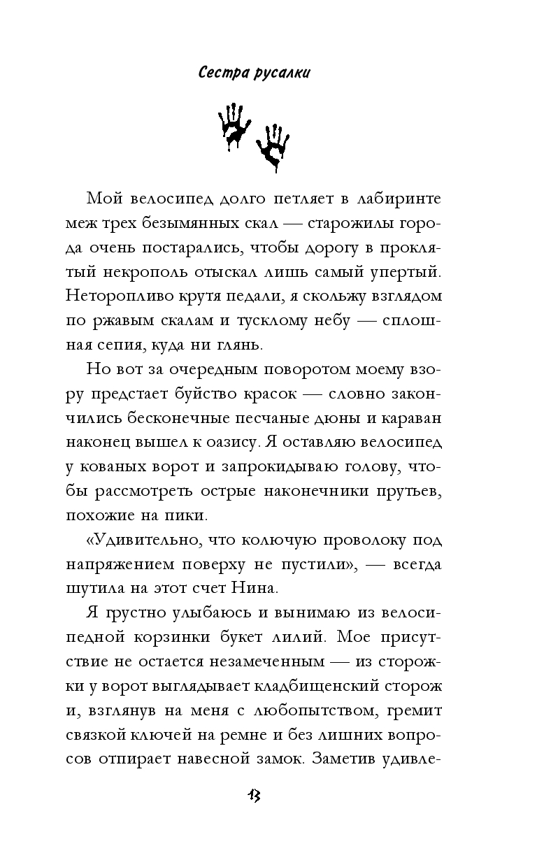 Родители Сони выбрали самое мрачное место для переезда – Графскую усадьбу. Их не смутили ни движущиеся статуи графского парка, ни русалки Тихого озера, ни звонящий колокол затопленной церкви. Они уверены, не стоит верить всему, о чем судачат горожане. Но если русалки – лишь легенда, почему ночами в парке слышны шорохи? Почему на окнах появляются отпечатки мокрых ладоней, а ручка входной двери все время влажная, как будто кто-то пытается проникнуть внутрь? Почему призрак покойной сестры Сони настойчиво предупреждает об опасности? Что бы ни говорили родители, Соня знает наверняка: русалки Тихого озера не выдумка. Десять лет назад она повстречалась с одной из них, и это едва не стоило ей жизни. Пришло время встретиться с ними снова…