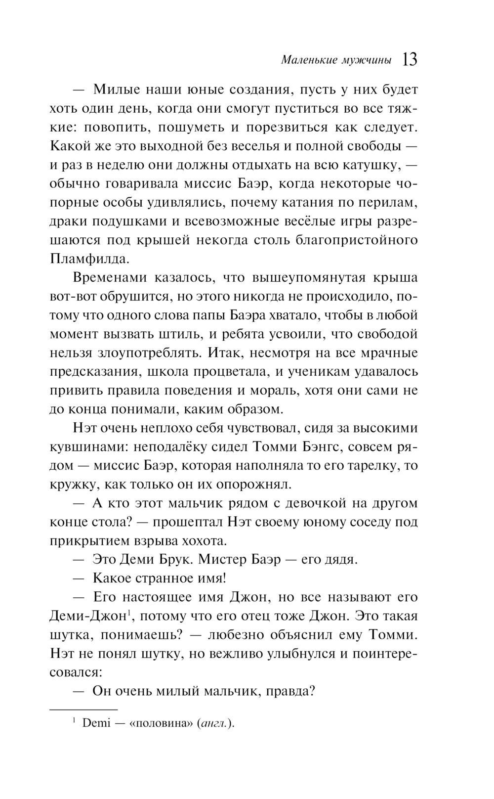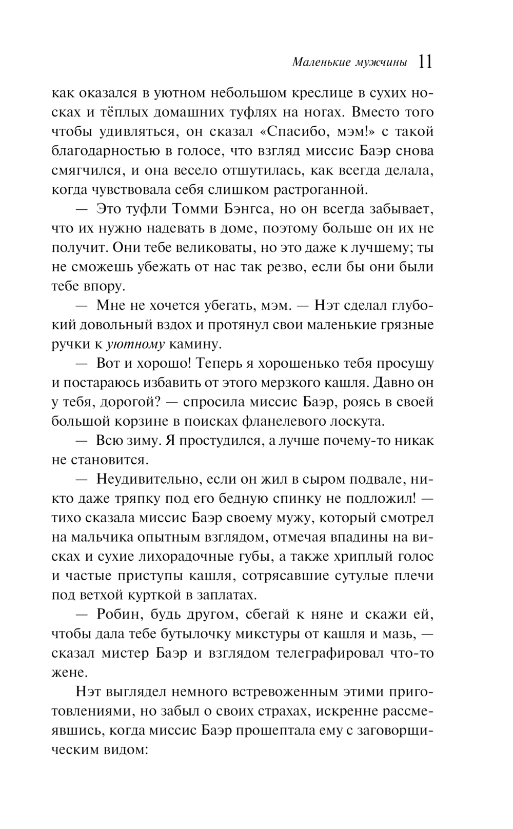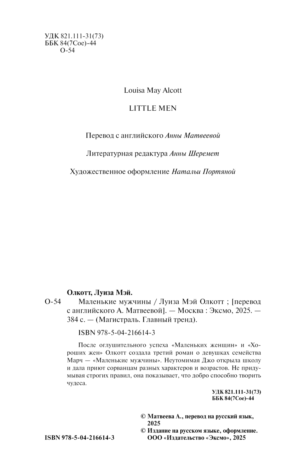 После оглушительного успеха "Маленьких женщин" и "Хороших жен", Олкотт создала третий роман о девушках семейства Марч – "Маленькие мужчины". Неутомимая Джо открыла школу и дала приют сорванцам разных характеров и возрастов. Не придумывая строгих правил, она показывает, что добро способно творить чудеса.