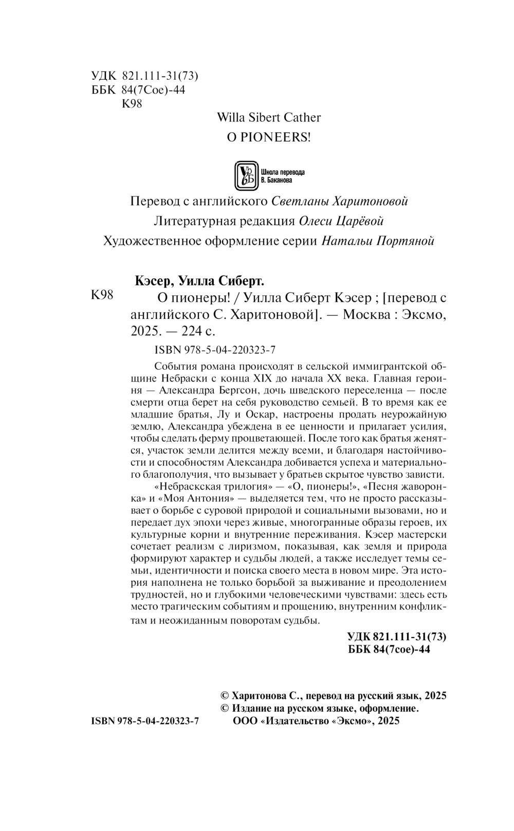 "Небраскская трилогия" – "О, пионеры!", "Песня жаворонка" и "Моя Антония" – выделяется тем, что не просто рассказывает о борьбе с суровой природой и социальными вызовами, но и передаёт дух эпохи через живые, многогранные образы героев, их культурные корни и внутренние переживания. Кэсер мастерски сочетает реализм с лиризмом, показывая, как земля и природа формируют характер и судьбы людей, а также исследует темы семьи, идентичности и поиска своего места в новом мире. Эта история наполнена не только борьбой за выживание и преодолением трудностей, но и глубокими человеческими чувствами: здесь есть место трагическим событиям и прощению, внутренним конфликтам и неожиданным поворотам судьбы.