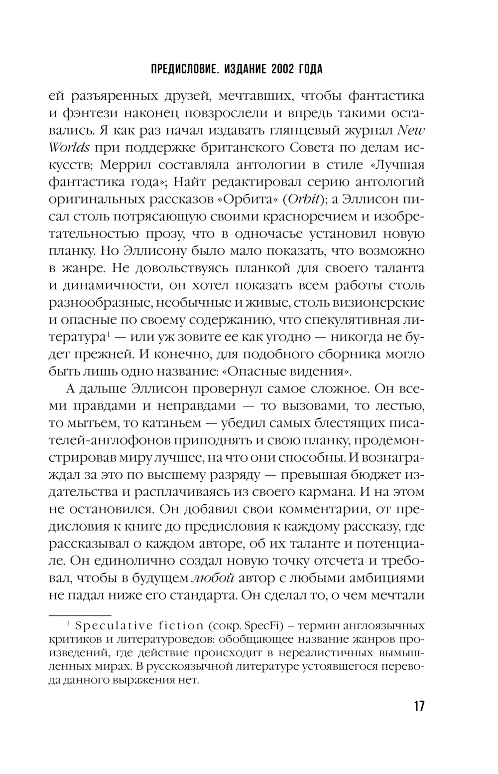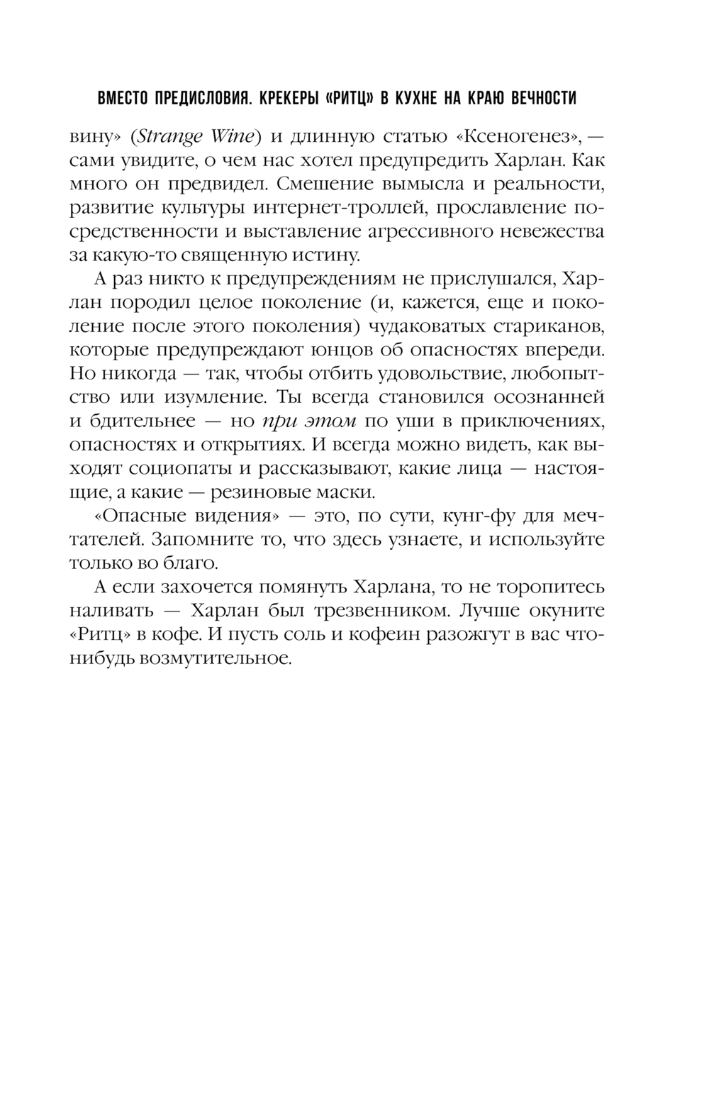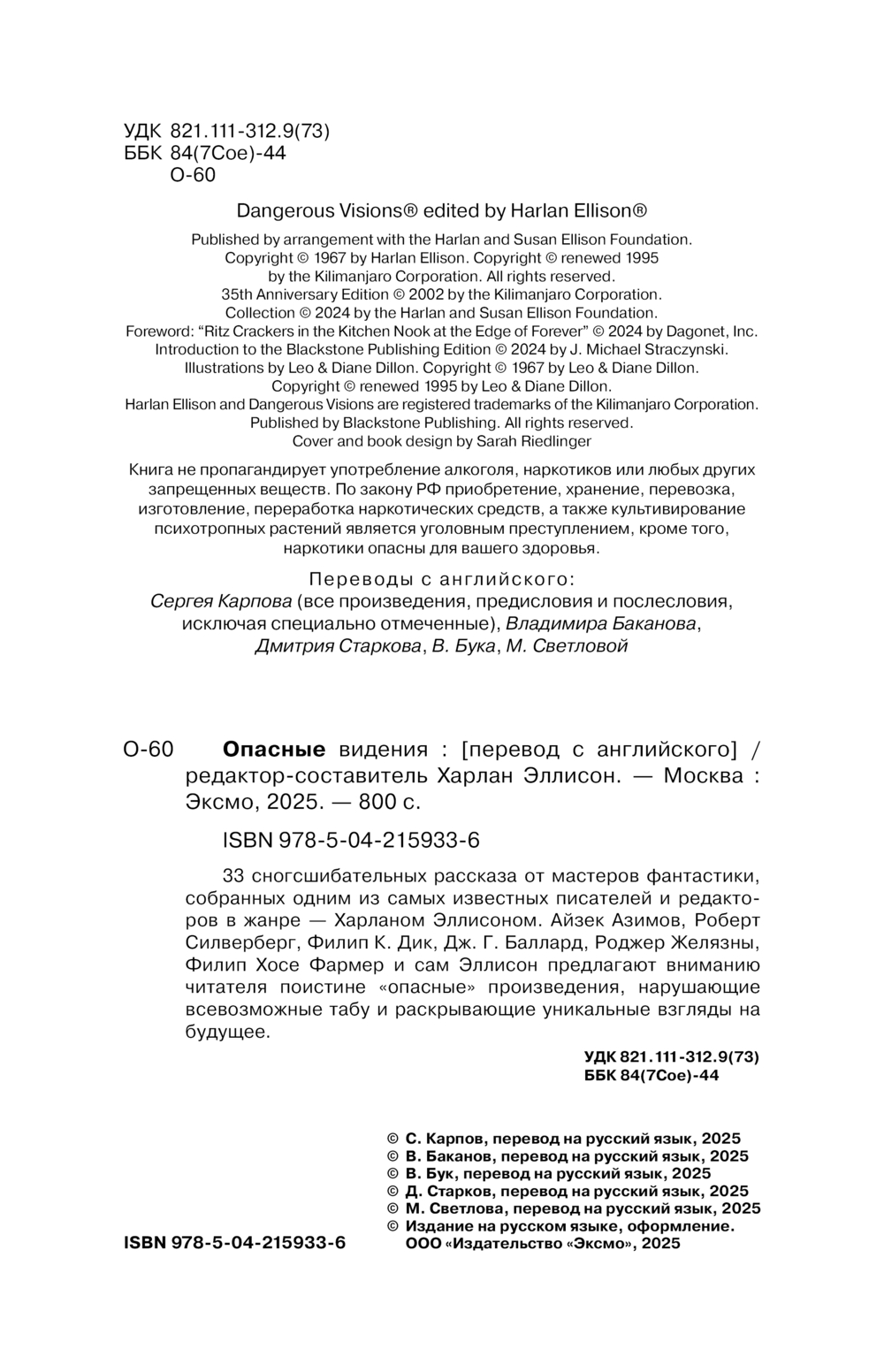 Антологии редко творят историю, но "Опасные видения" – великое и удивительное исключение. В далеком 1967 году, во время студенческих волнений, бесславной войны во Вьетнаме и психоделической революции, писатель и редактор Харлан Эллисон совершил настоящую культурологическую провокацию. Он попросил ведущих фантастов своего времени написать для составляемого им сборника по рассказу, который бы выражал истинное, "опасное" видение будущего и поэтому принципиально не мог быть опубликован в то время. А перечень авторов действительно впечатлял: Айзек Азимов, Филип К. Дик, Роджер Желязны, Пол Андерсон, Роберт Силверберг, Филип Хосе Фармер и другие. Неудивительно, что прекрасные, уникальные, шокирующие и меняющие восприятие произведения, впервые опубликованные под этой обложкой, в дальнейшем частенько становились номинантами и лауреатами главных жанровых премий "Хьюго" и "Небьюла".