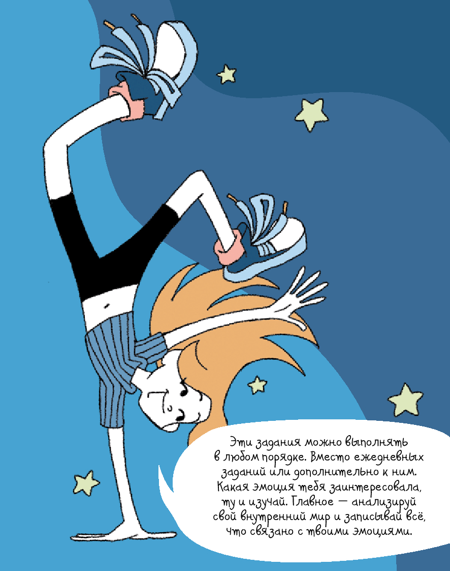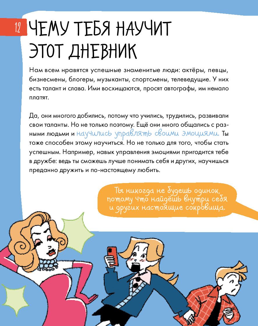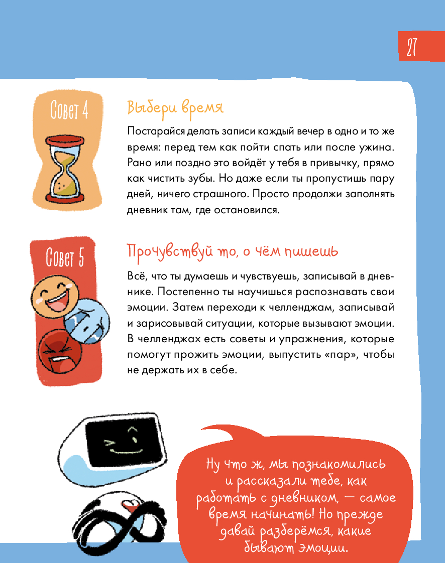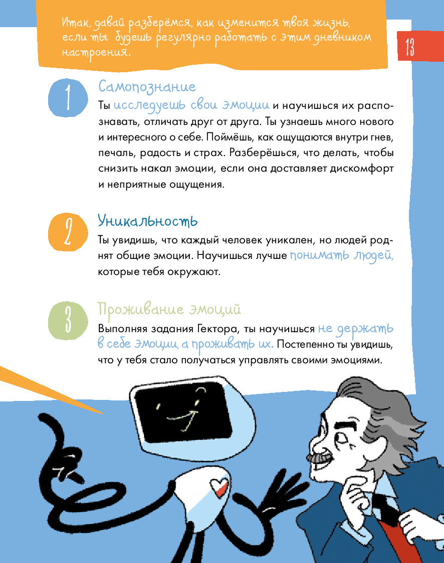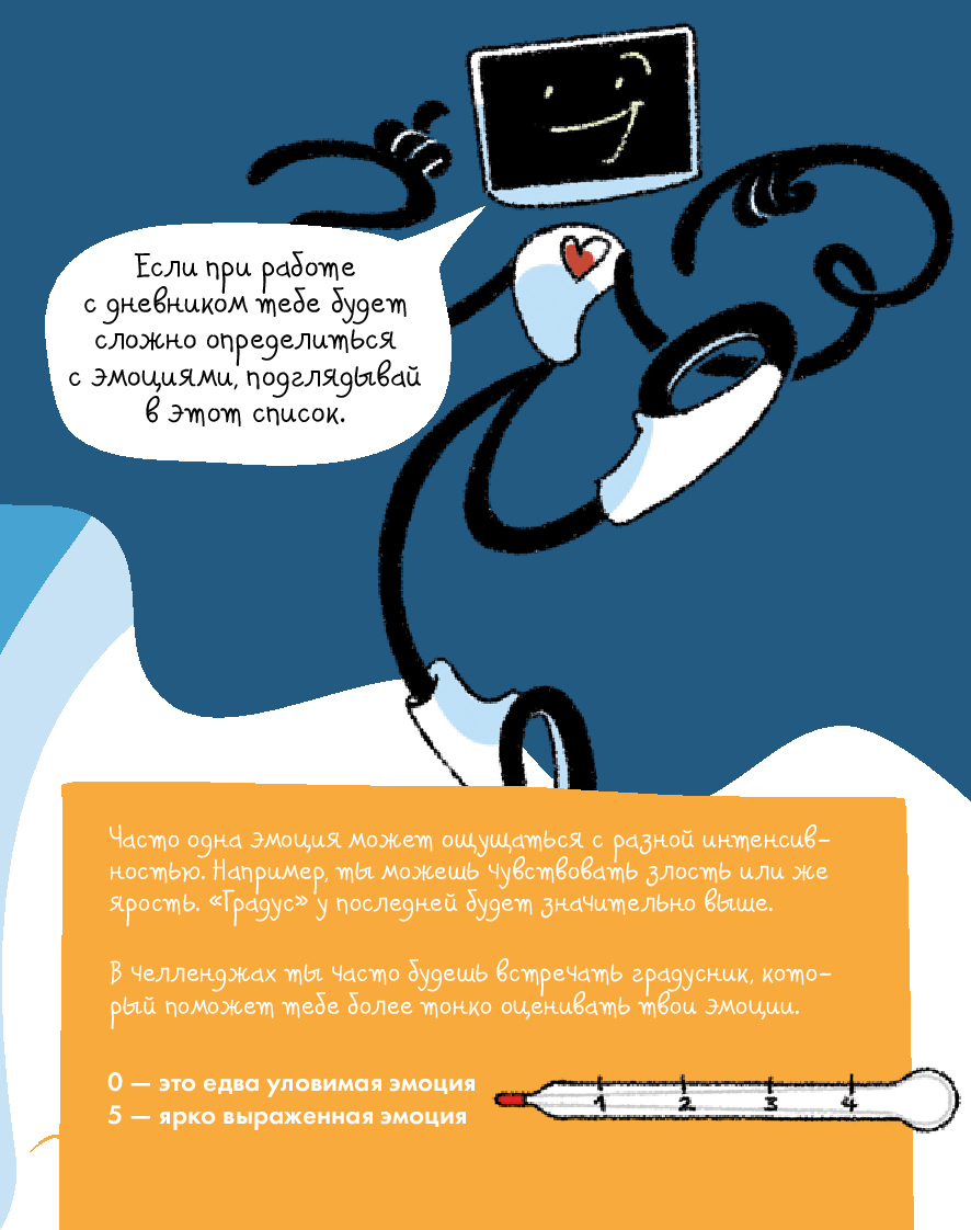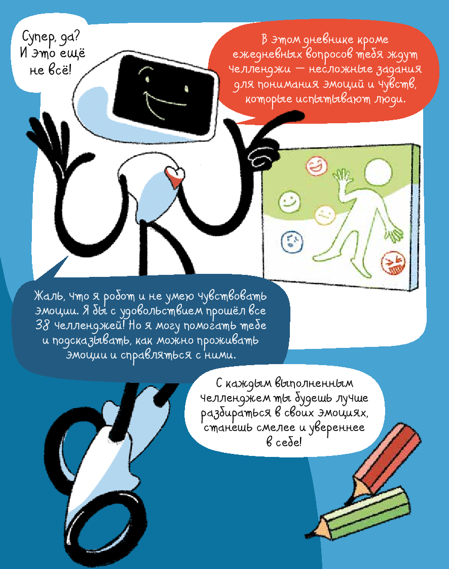 Радость, грусть, страх... – всё это эмоции. От них зависит не только то, как мы себя чувствуем, но и наши взаимоотношения с окружающим миром. Иногда бывает сложно определить, какую эмоцию испытываешь. И это нормально для всех. Этот уникальный интерактивный дневник настроения поможет детям 8–12 лет научиться распознавать, экологично проживать и выражать эмоции, уделять больше внимания своему эмоциональному и физическому состоянию, рефлексировать. Дневник учитывает особенности возрастной психологии детей, поэтому информация подаётся в игровом формате: заполнение дневниковых записей чередуется с увлекательными челленджами, творческими заданиями, интересными фактами и полезной информацией из области психологии. Все это обязательно поможет ребенку стать увереннее в себе и добиться успеха в жизни. Чтобы ребёнку было легче воспринимать материал, его будут сопровождать два героя: пятиклассница Катя и второклассник Вадим.