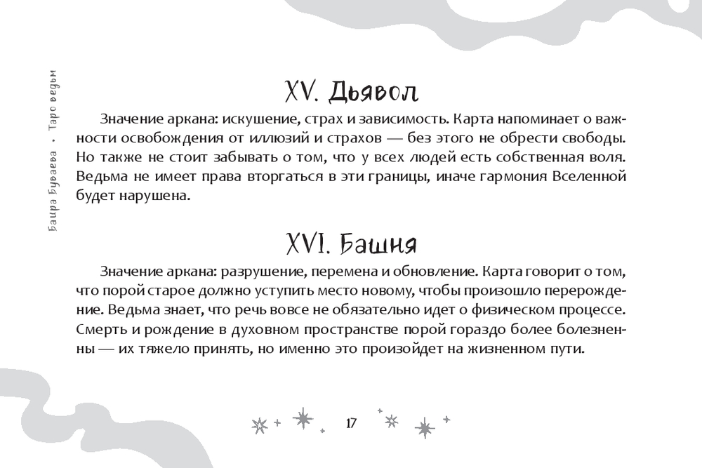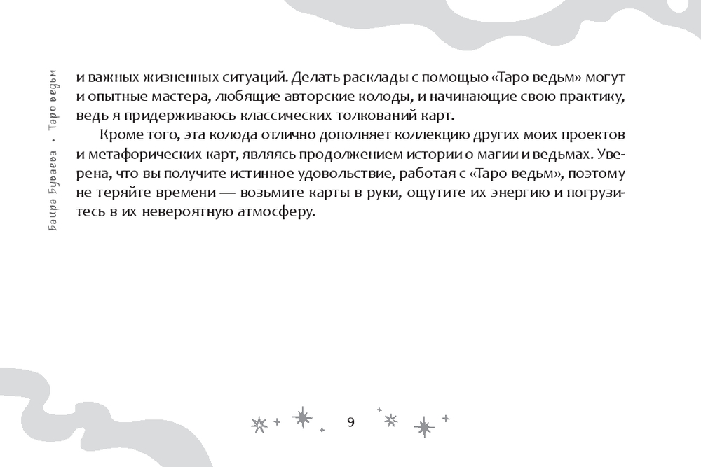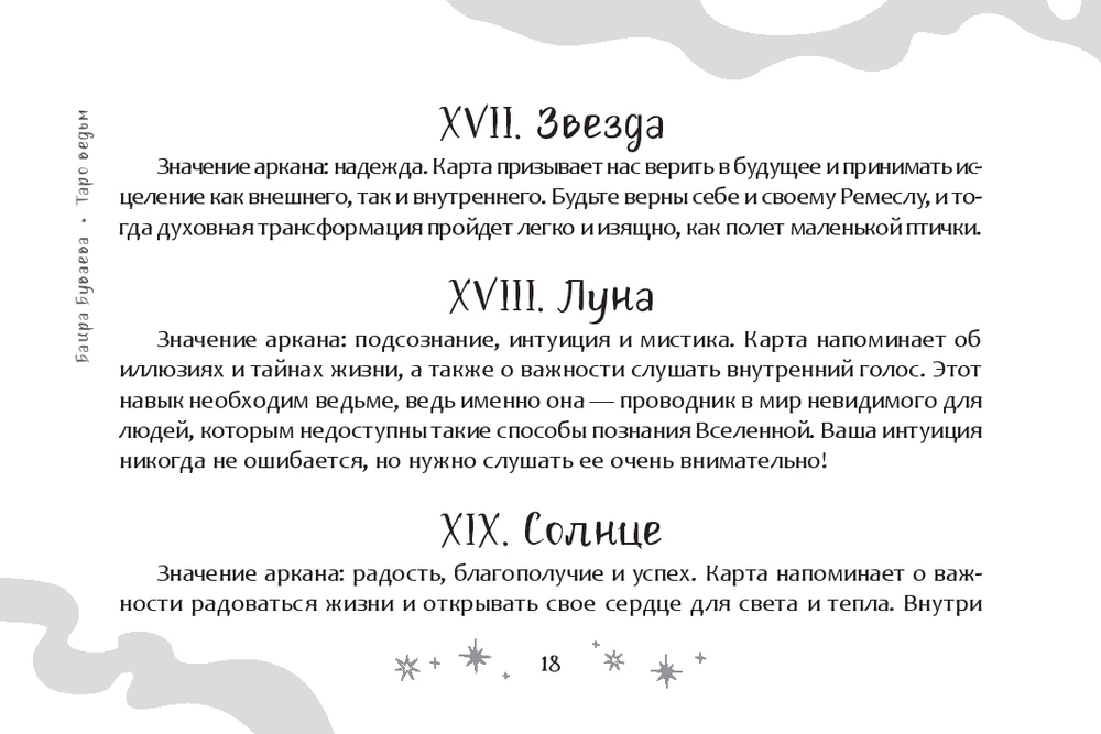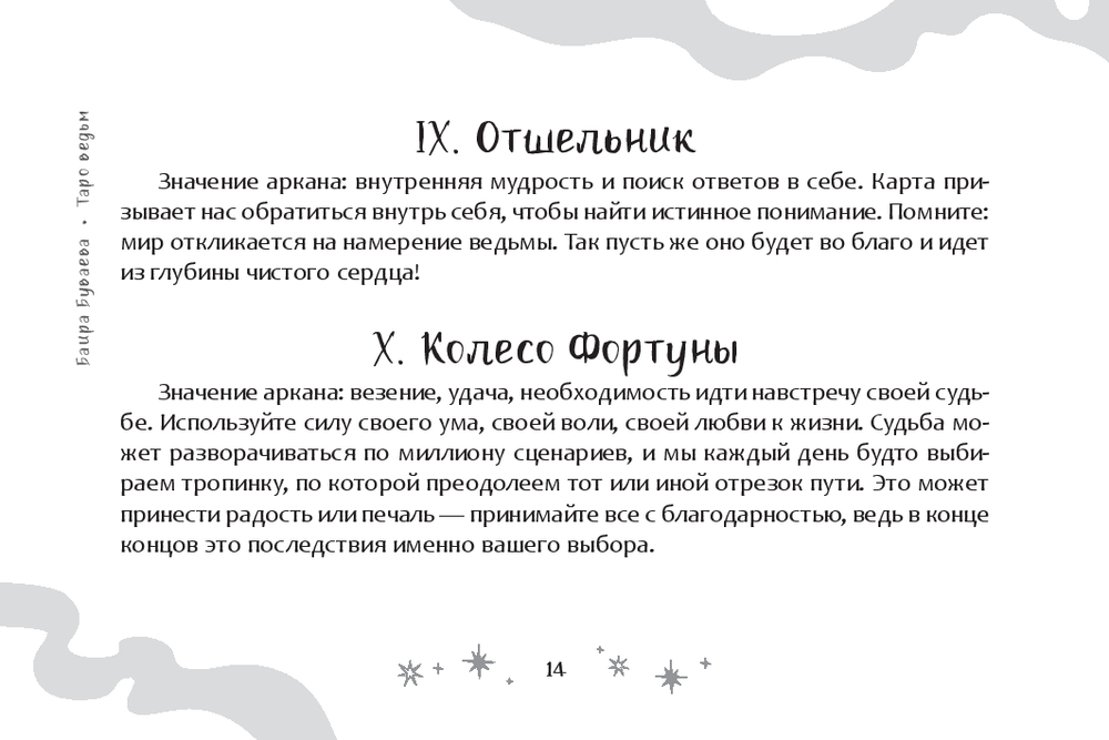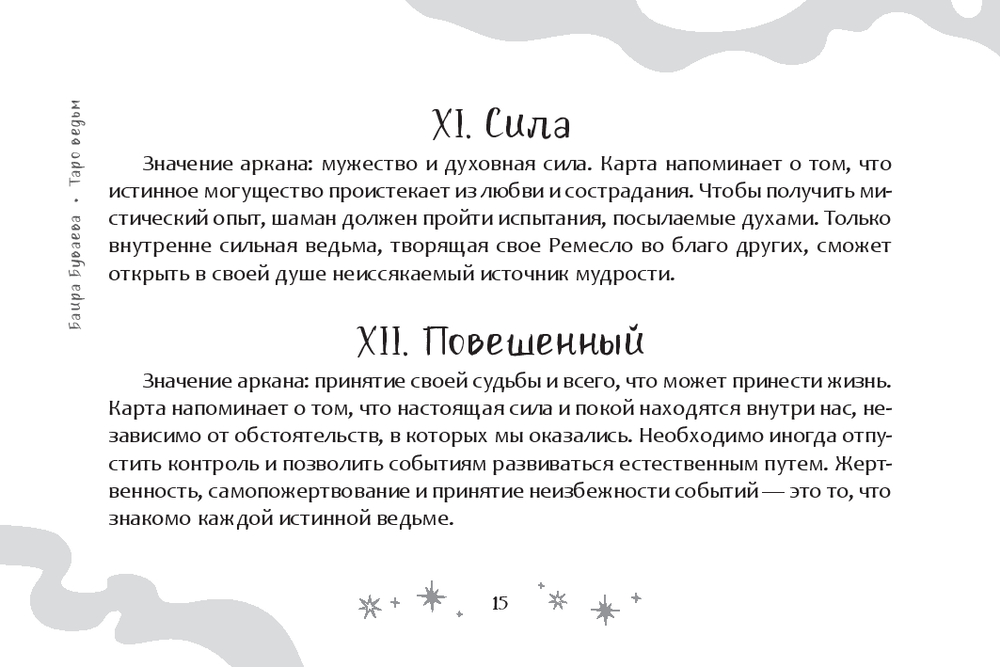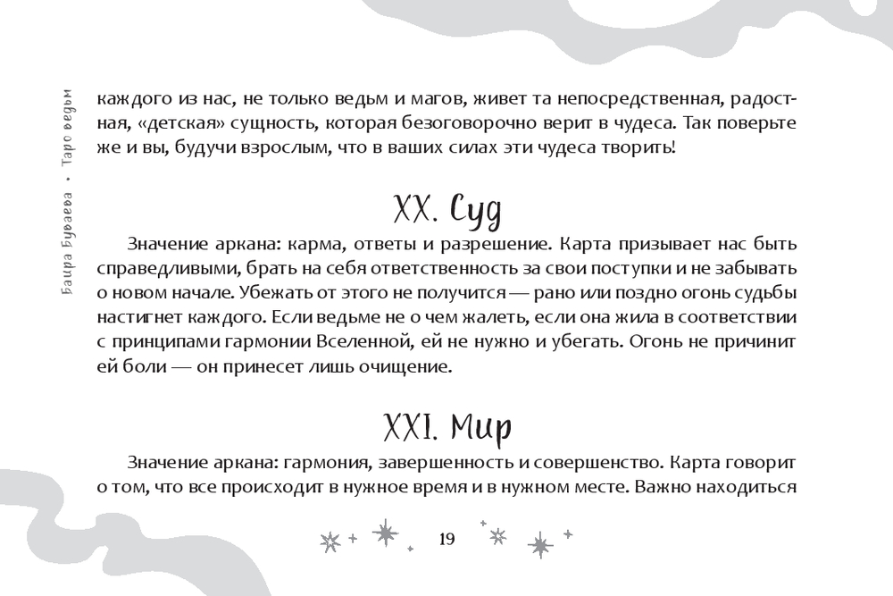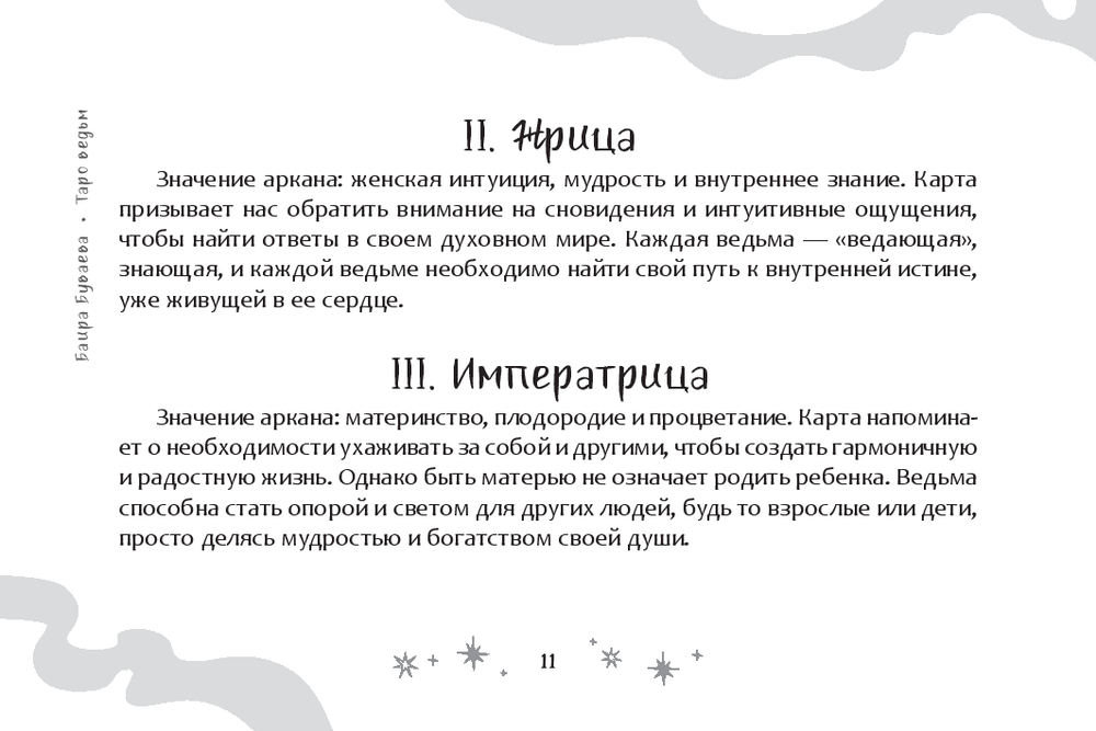 В этом Таро образ ведьмы представлен как архетип мудрости и силы. Ведьма здесь – не страшная фигура из сказки, а человек, идущий своим путем, чутко слышащий голос природных стихий и зов души. Ее путешествие начинается с раннего этапа, времени невинности, и в магическом странствии героиня приходит к зрелости, мастерству и внутренней свободе.