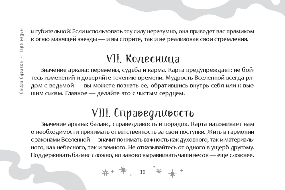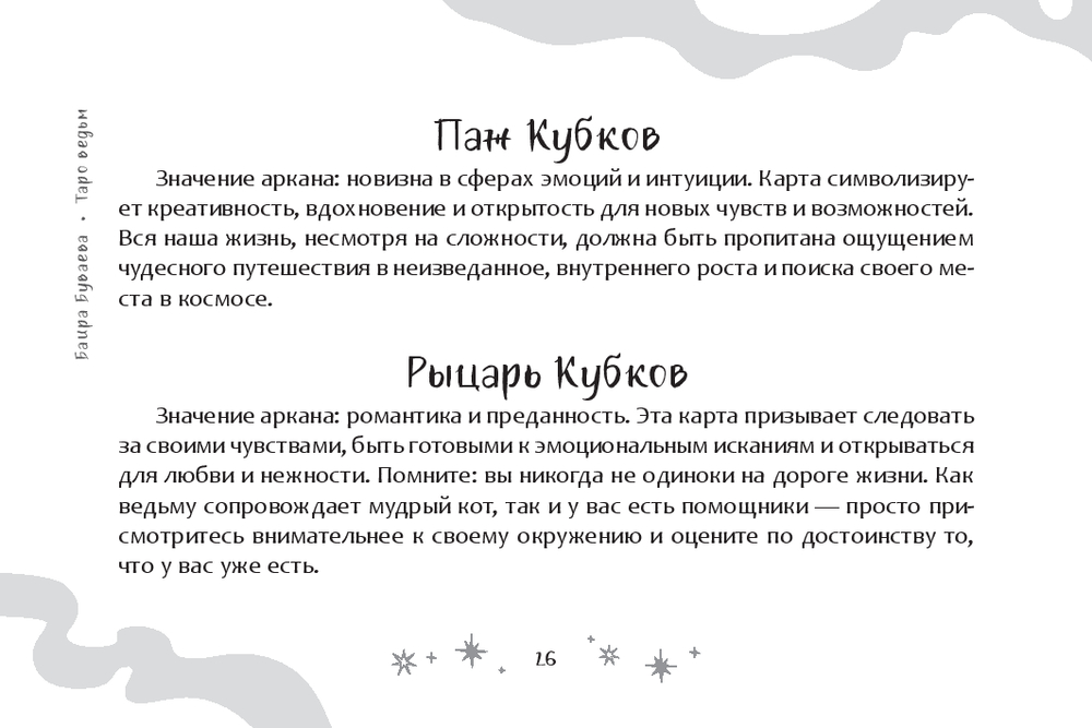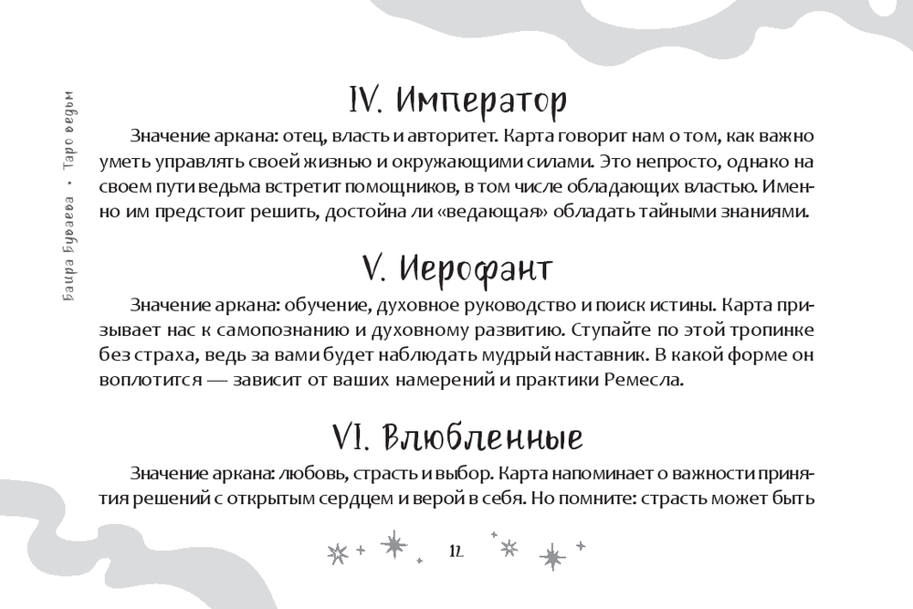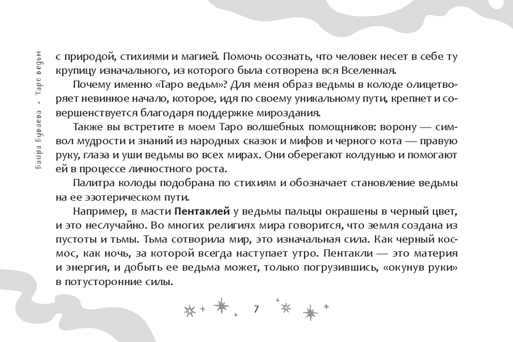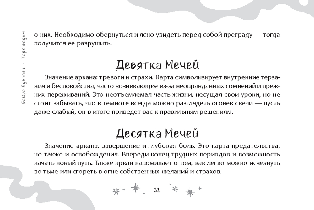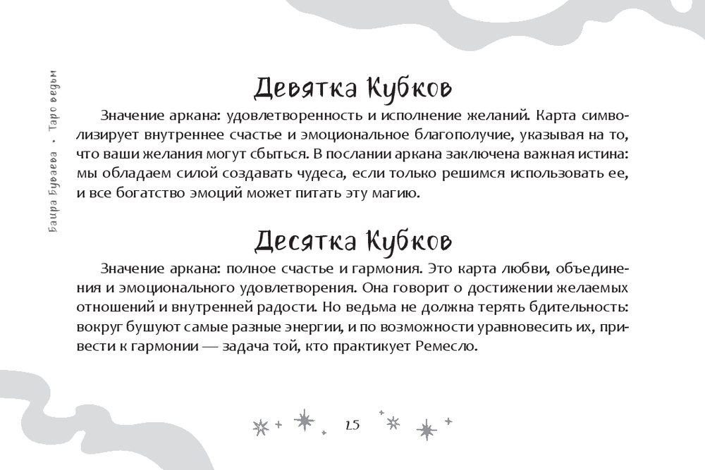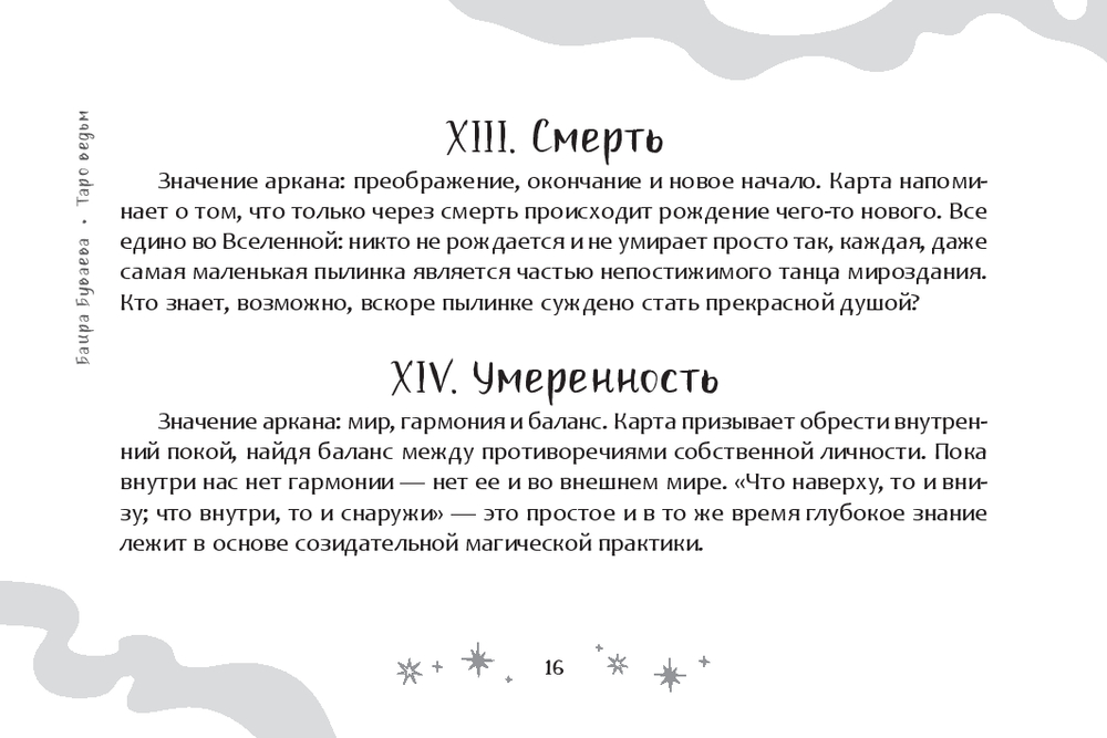 В этом Таро образ ведьмы представлен как архетип мудрости и силы. Ведьма здесь – не страшная фигура из сказки, а человек, идущий своим путем, чутко слышащий голос природных стихий и зов души. Ее путешествие начинается с раннего этапа, времени невинности, и в магическом странствии героиня приходит к зрелости, мастерству и внутренней свободе.