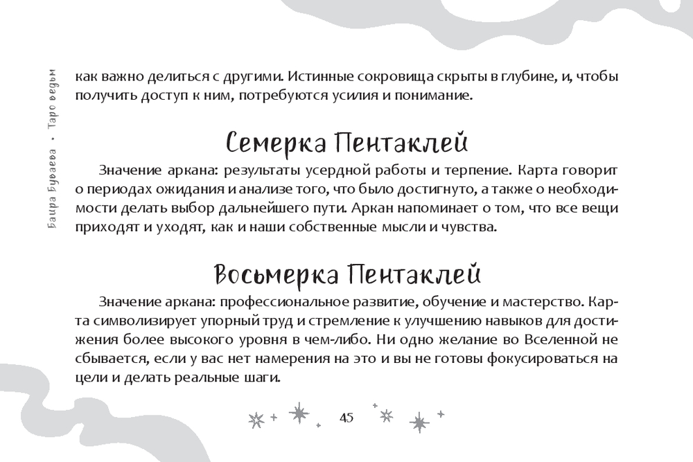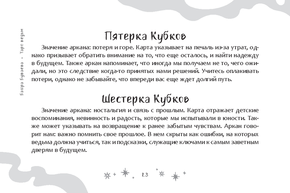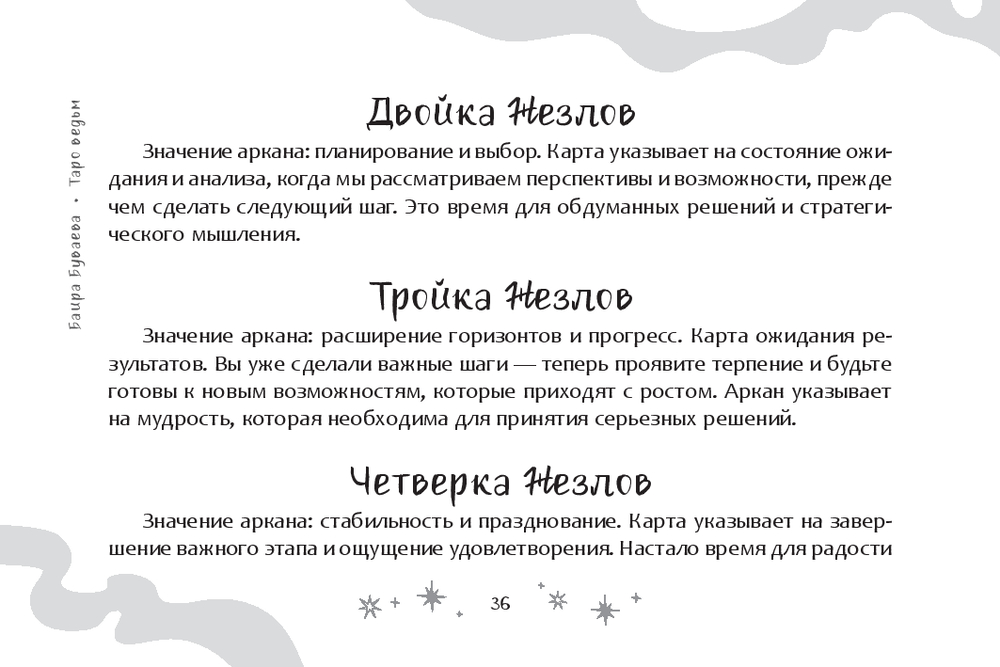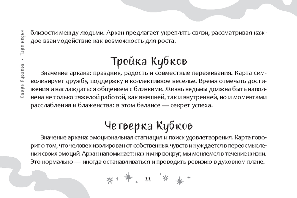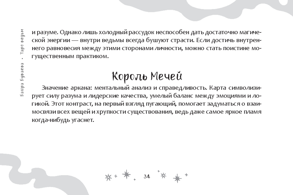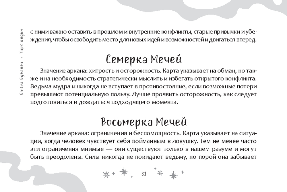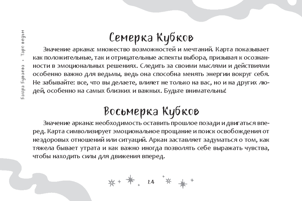 В этом Таро образ ведьмы представлен как архетип мудрости и силы. Ведьма здесь – не страшная фигура из сказки, а человек, идущий своим путем, чутко слышащий голос природных стихий и зов души. Ее путешествие начинается с раннего этапа, времени невинности, и в магическом странствии героиня приходит к зрелости, мастерству и внутренней свободе.