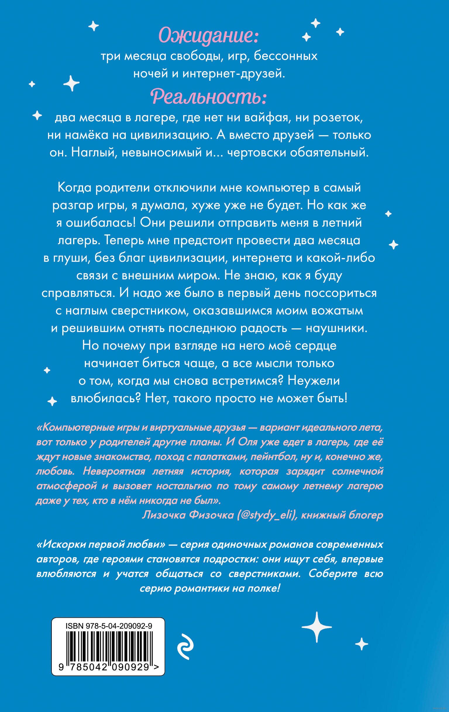 Когда родители отключили мне компьютер в самый разгар игры, я думала, хуже уже не будет. Но как же я ошибалась! Они решили отправить меня в летний лагерь. Теперь мне предстоит провести два месяца в глуши, без благ цивилизации, Интернета и какой-либо связи с внешним миром. Не знаю, как я буду справляться. И надо же было в первый день поссориться с наглым сверстником, оказавшимся моим вожатым и решившим отнять последнюю радость – наушники. Но почему, при взгляде на него моё сердце начинает биться чаще? А все мысли только о том, когда мы снова встретимся? Неужели, влюбилась? Нет, такого просто не может быть!