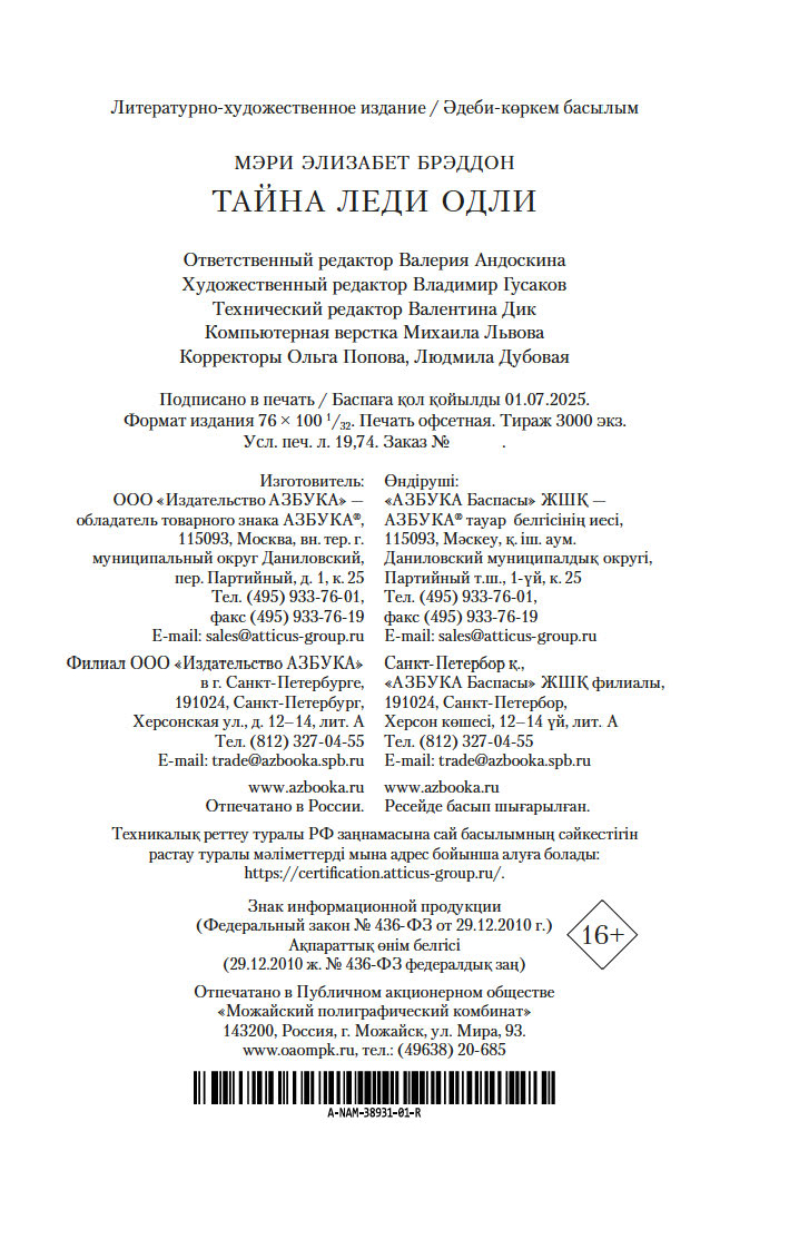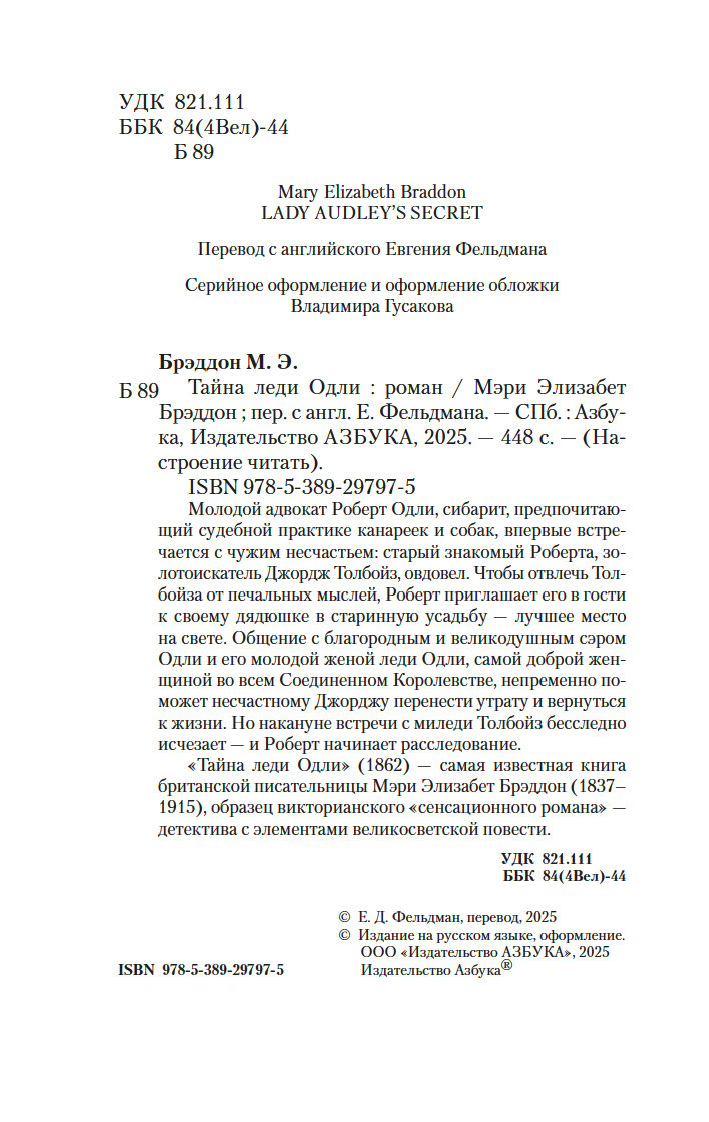 "Тайна леди Одли" (1862) – самая известная книга британской писательницы Мэри Элизабет Брэддон (1837–1915), образец викторианского "сенсационного романа" – детектива с элементами великосветской повести.