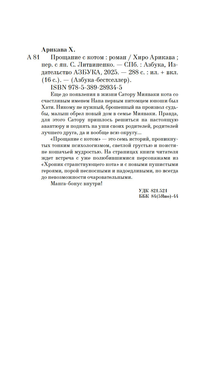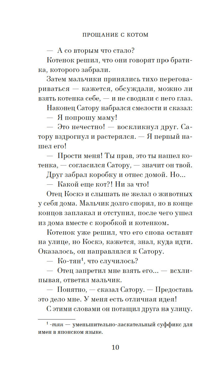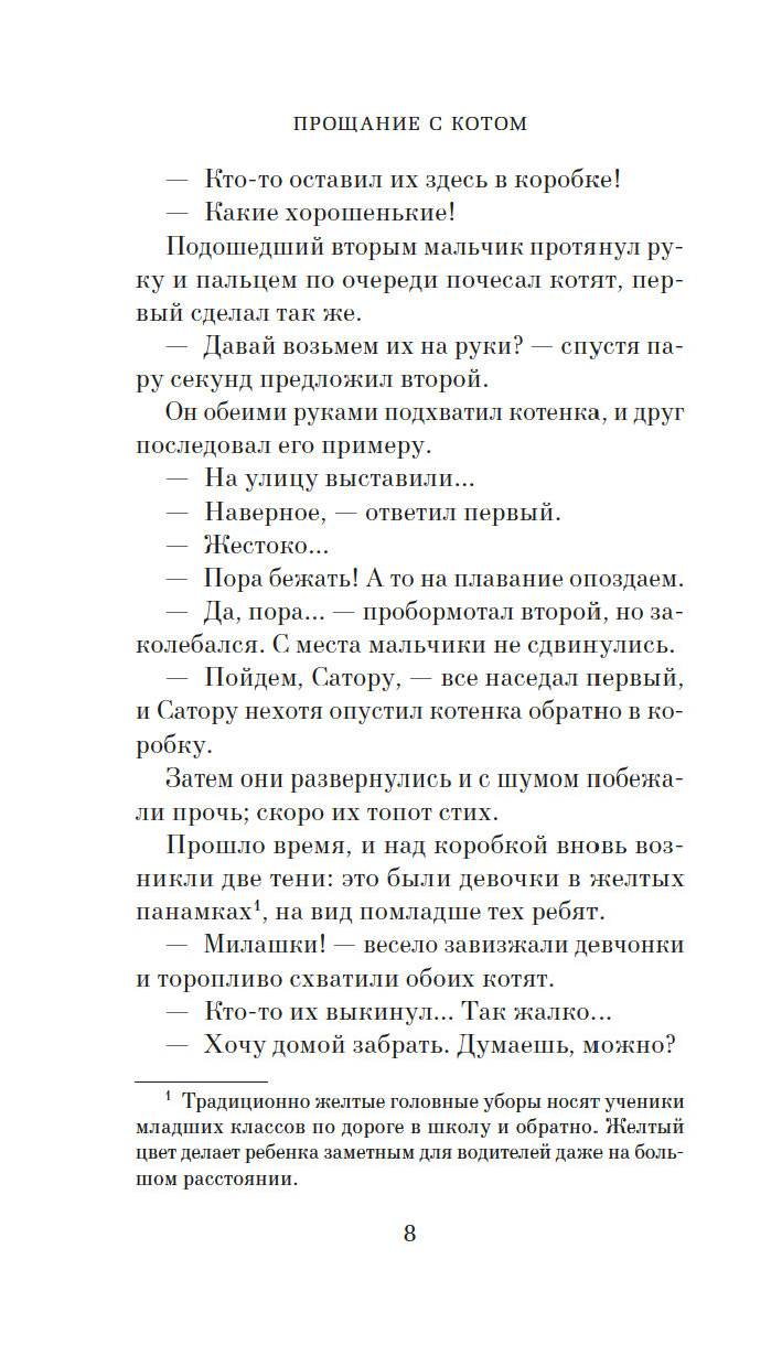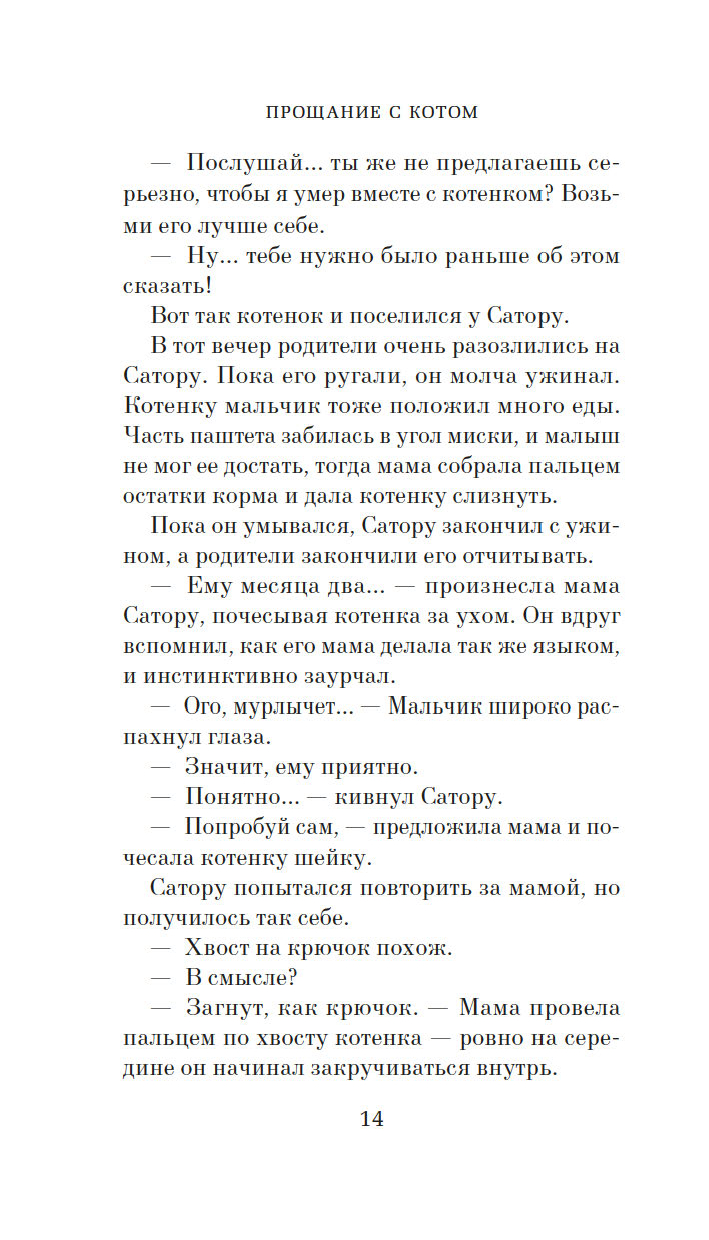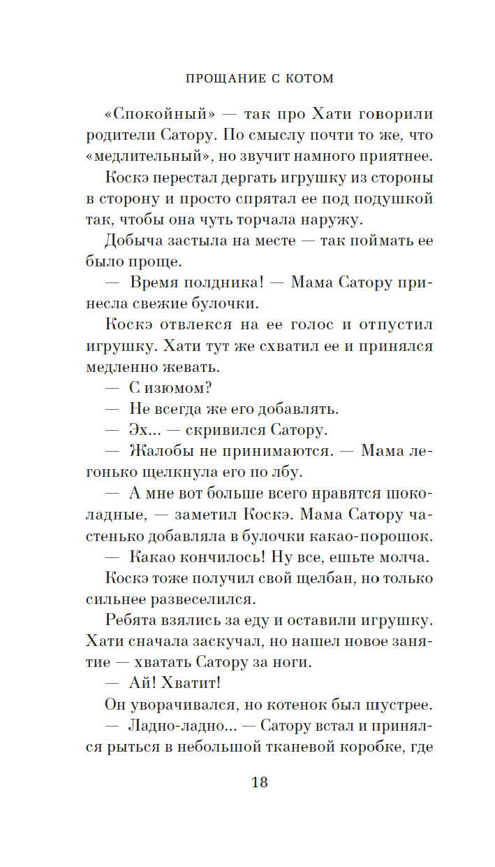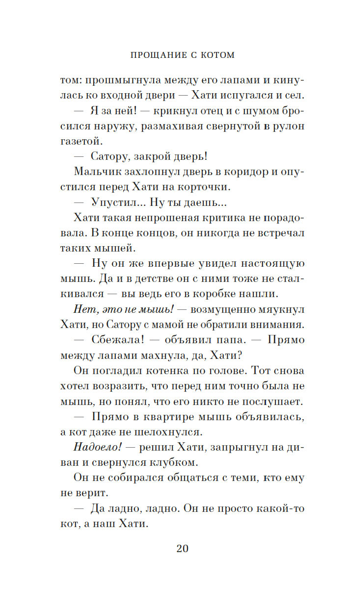 "Прощание с котом" – это семь историй, проникнутых тонким психологизмом, светлой грустью и поистине кошачьей мудростью. На страницах книги читателя ждет встреча как с уже полюбившимися персонажами из "Хроник странствующего кота", так и с новыми пушистыми героями, порой несносными и выводящими из себя, но всегда до невозможности очаровательными.