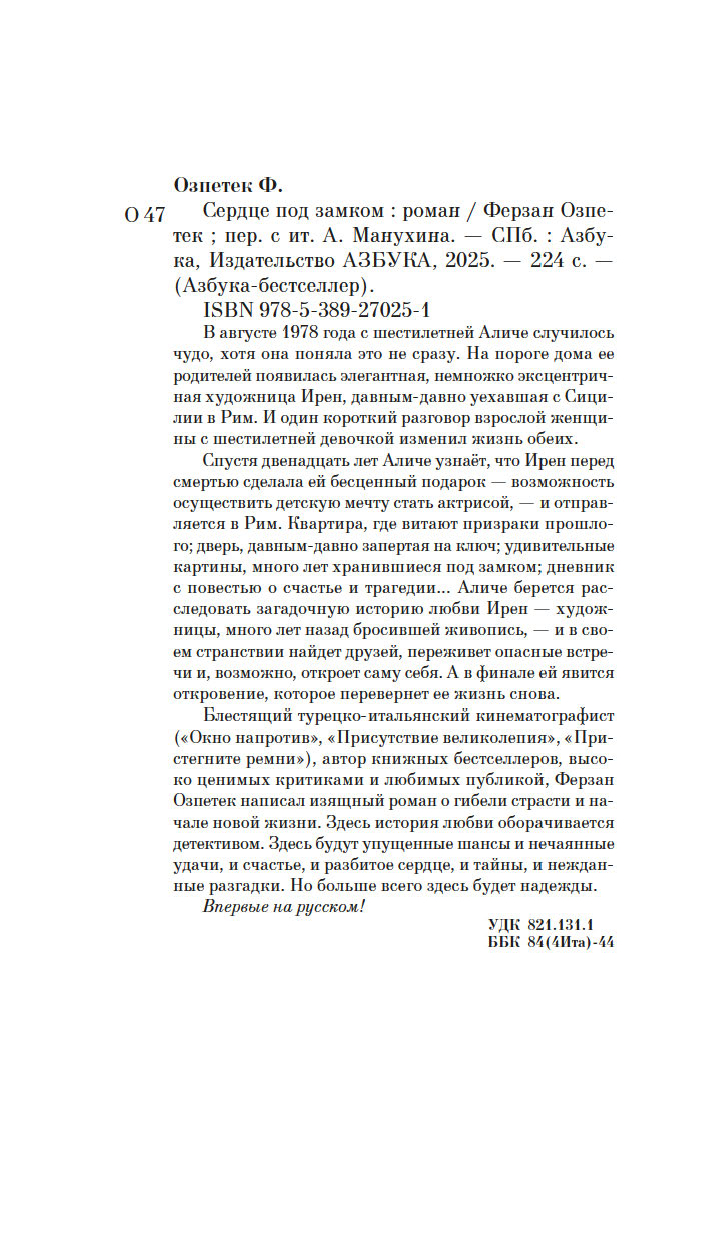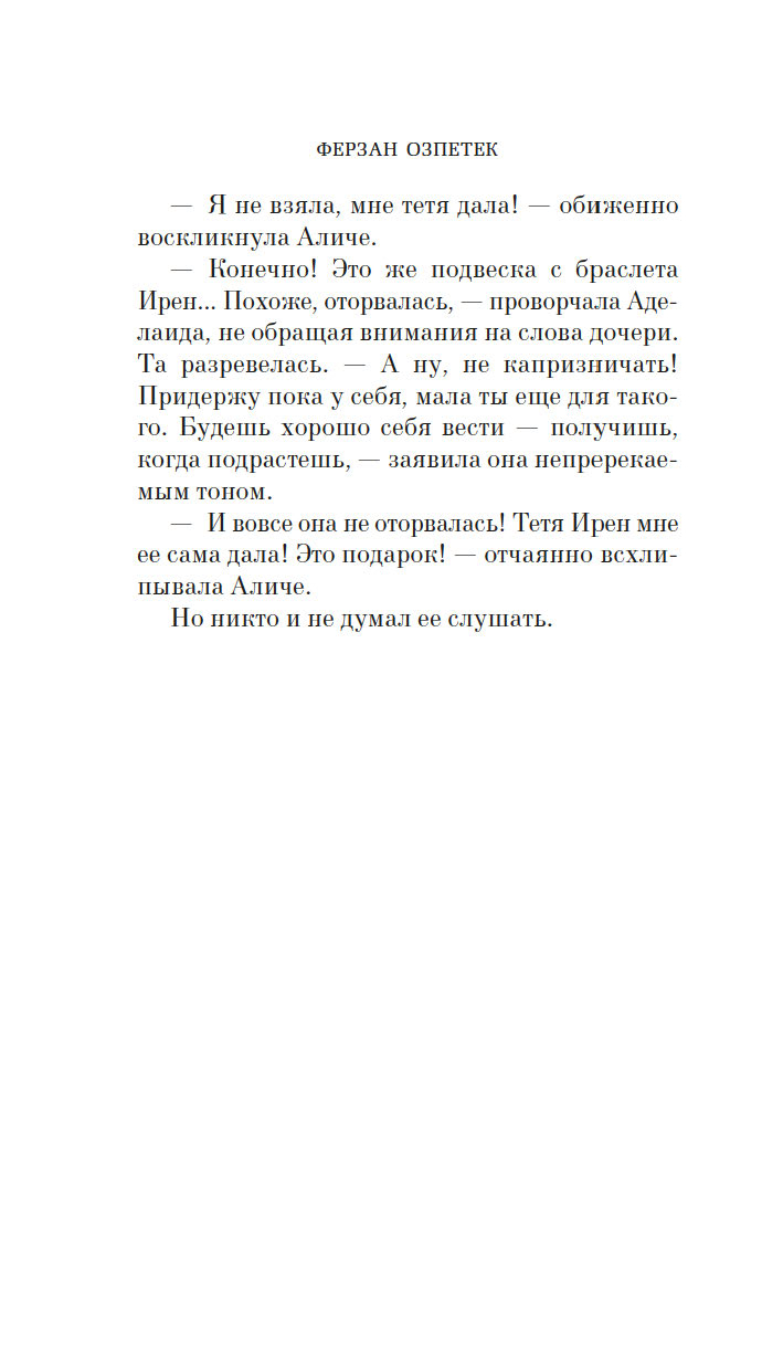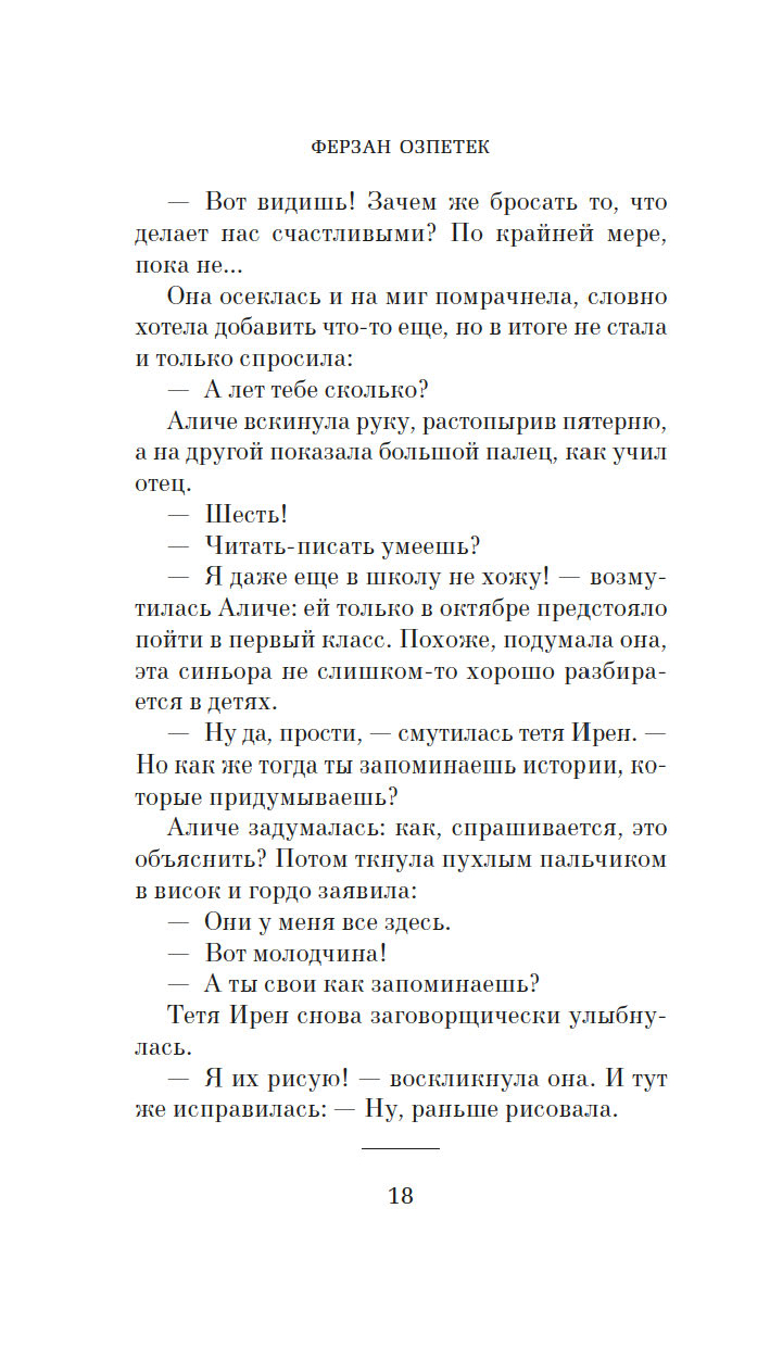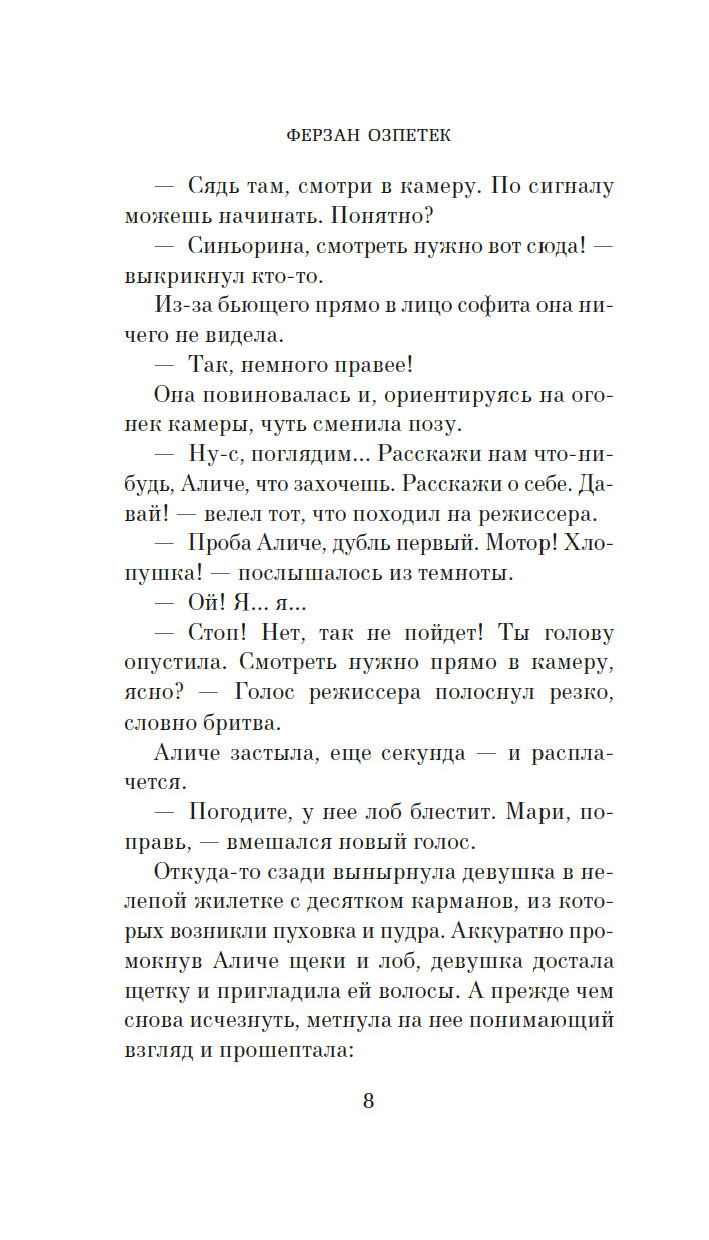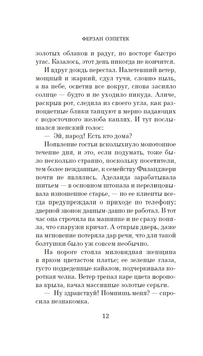 Блестящий турецко-итальянский кинематографист ("Окно напротив", "Присутствие великолепия", "Пристегните ремни"), автор книжных бестселлеров, высоко ценимых критиками и любимых публикой, Ферзан Озпетек написал изящный роман о гибели страсти и начале новой жизни. Здесь история любви оборачивается детективом. Здесь будут упущенные шансы и нечаянные удачи, и счастье, и разбитое сердце, и тайны, и нежданные разгадки. Но больше всего здесь будет надежды.