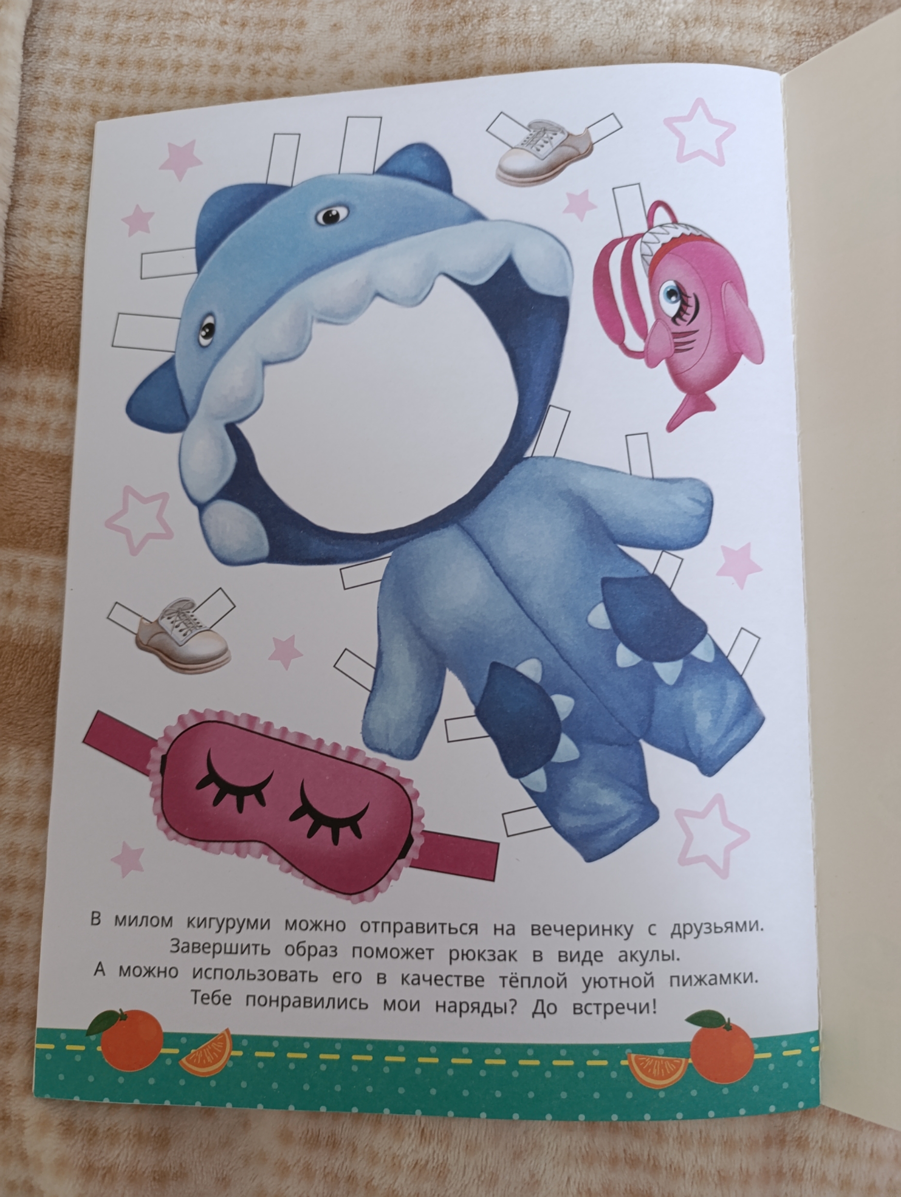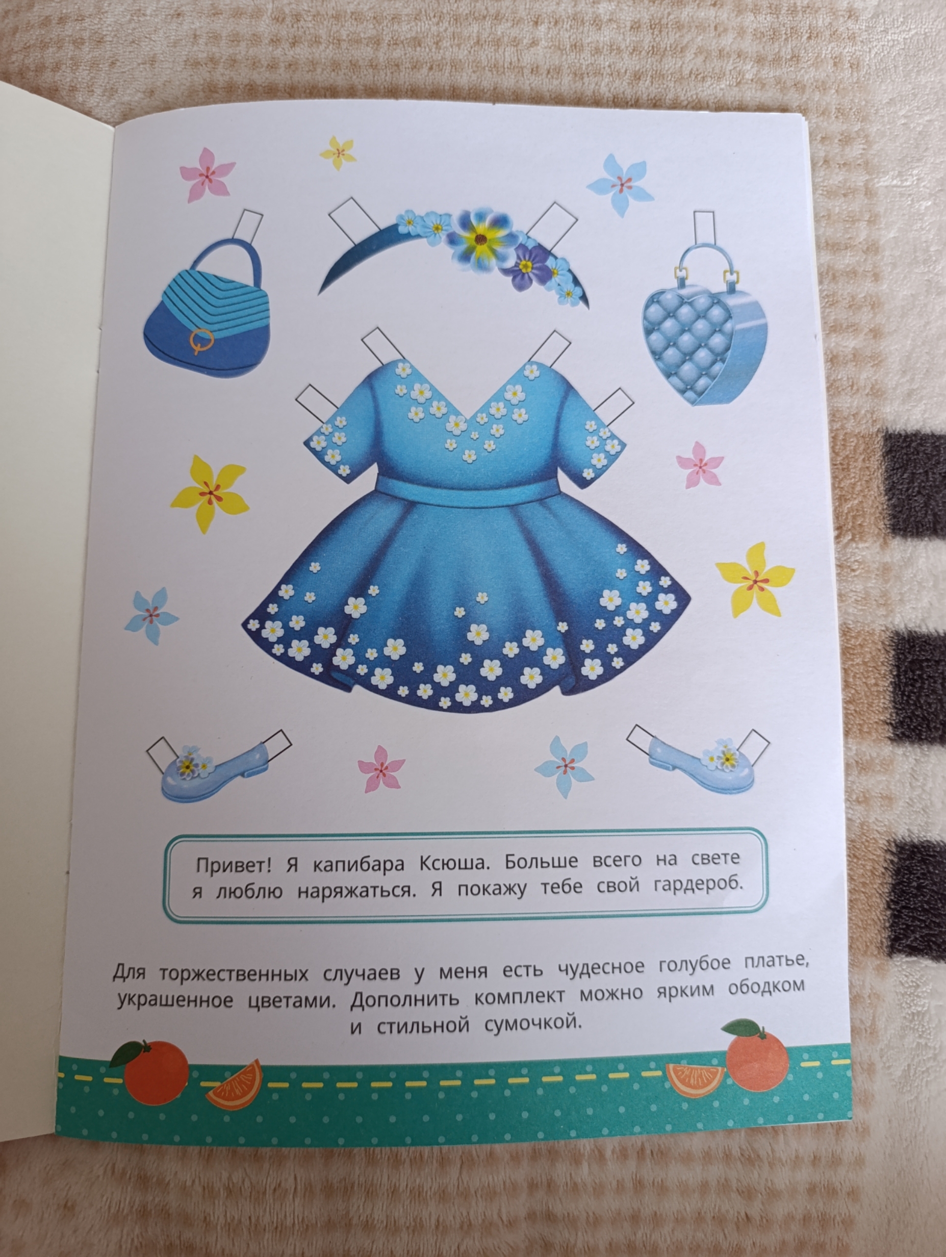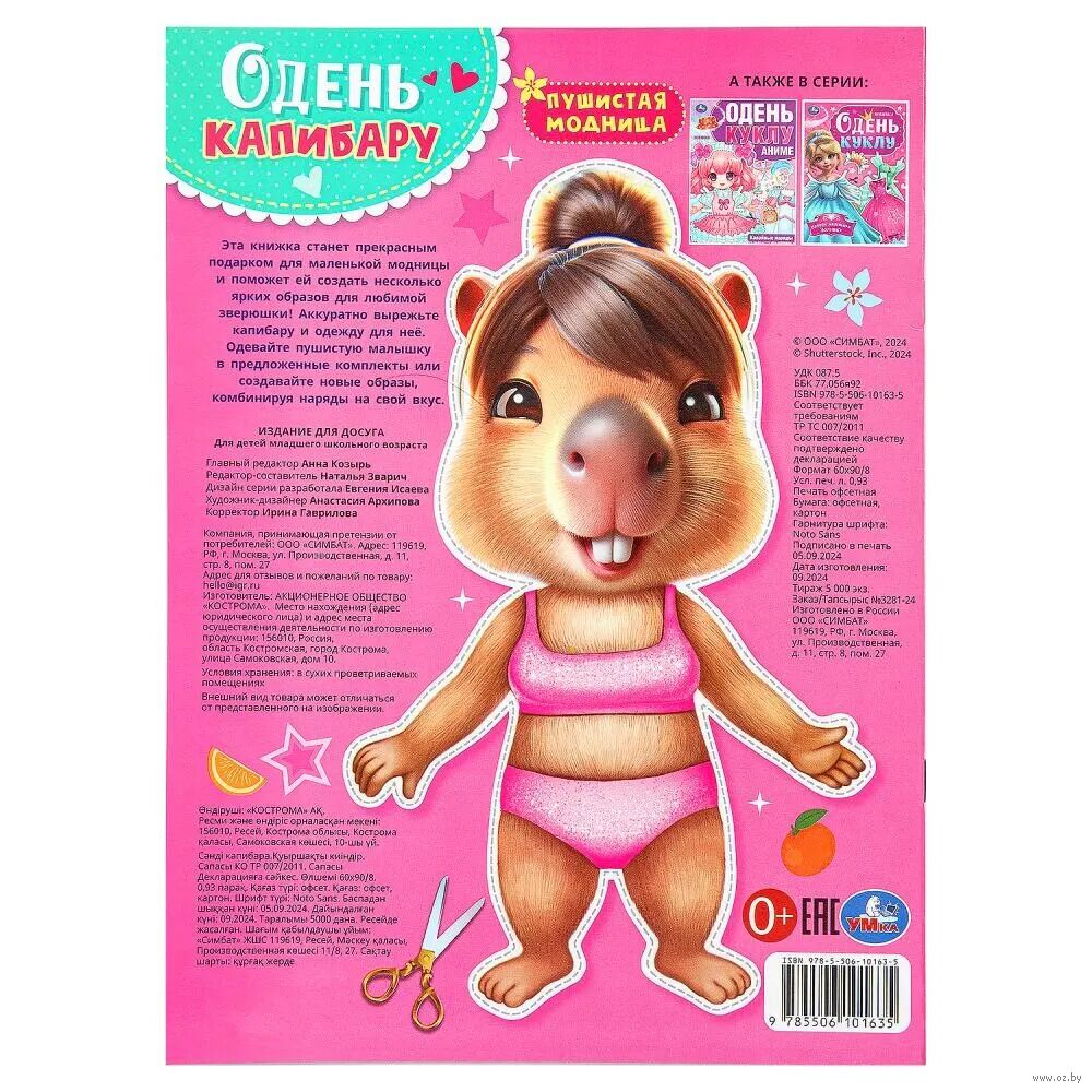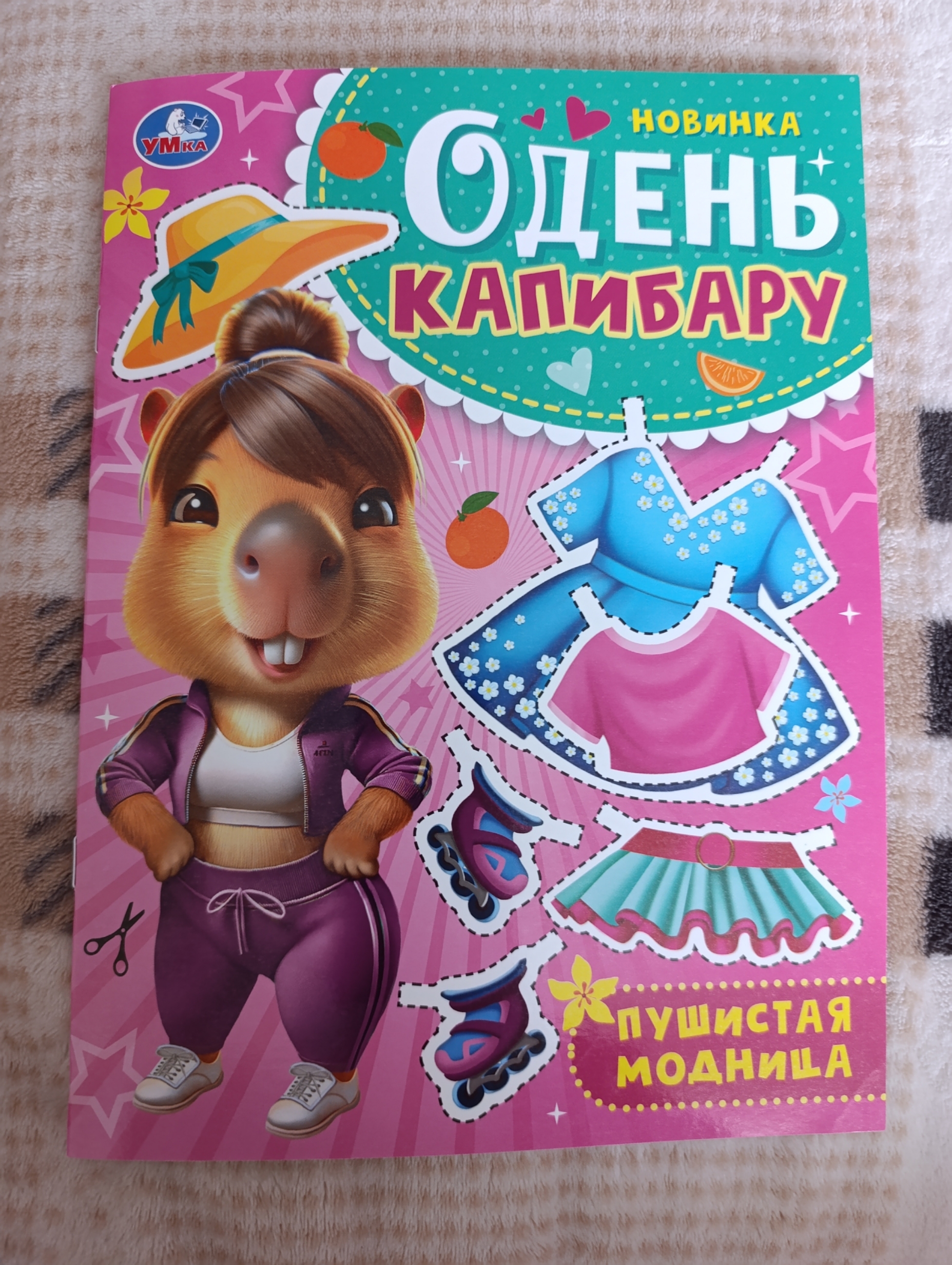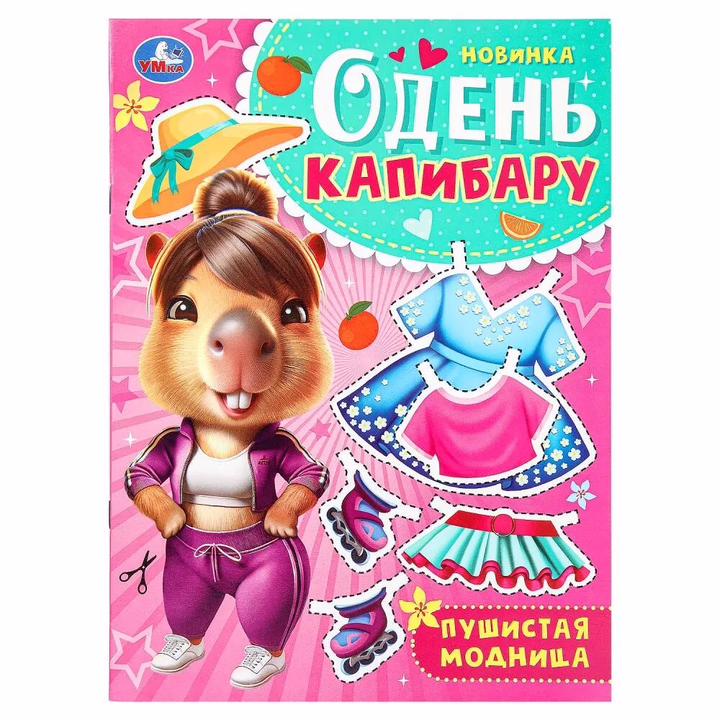 Юный дизайнер с удовольствием будет вырезать одежду для милой капибары-модницы и подбирать для нее разнообразные наряды, а потом играть с ней, устраивая настоящие показы мод. Девочка может не только воспользоваться подобранными в данном альбоме комплектами одежды, но и придумать и нарисовать свои варианты, проявив фантазию и творчество.