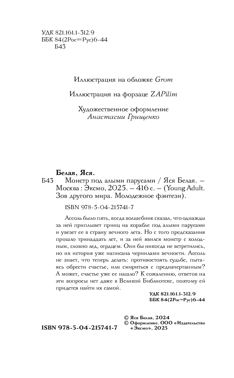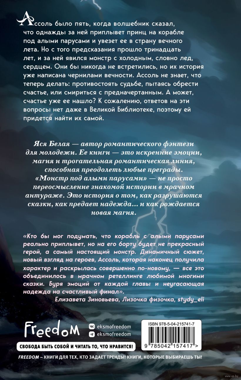 Ассоль было пять, когда волшебник сказал, что однажды за ней приплывет принц на корабле под алыми парусами и увезет ее в страну вечного лета. Но с того предсказания прошло тринадцать лет, и за ней явился монстр с холодным, словно лед, сердцем. Они бы никогда не встретились, но их история уже написана чернилами вечности. Ассоль не знает, что теперь делать: противостоять судьбе, пытаясь обрести счастье или смириться с предначертанным. А может, счастье уже ее нашло? К сожалению, ответов на эти вопросы нет даже в Великой Библиотеке, поэтому ей придётся найти их самой.