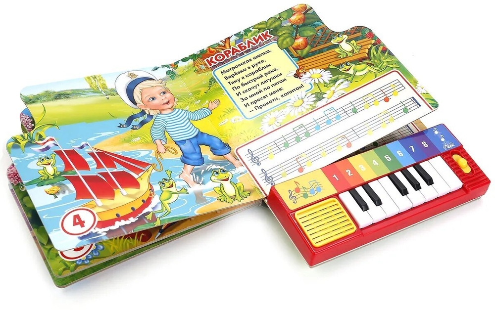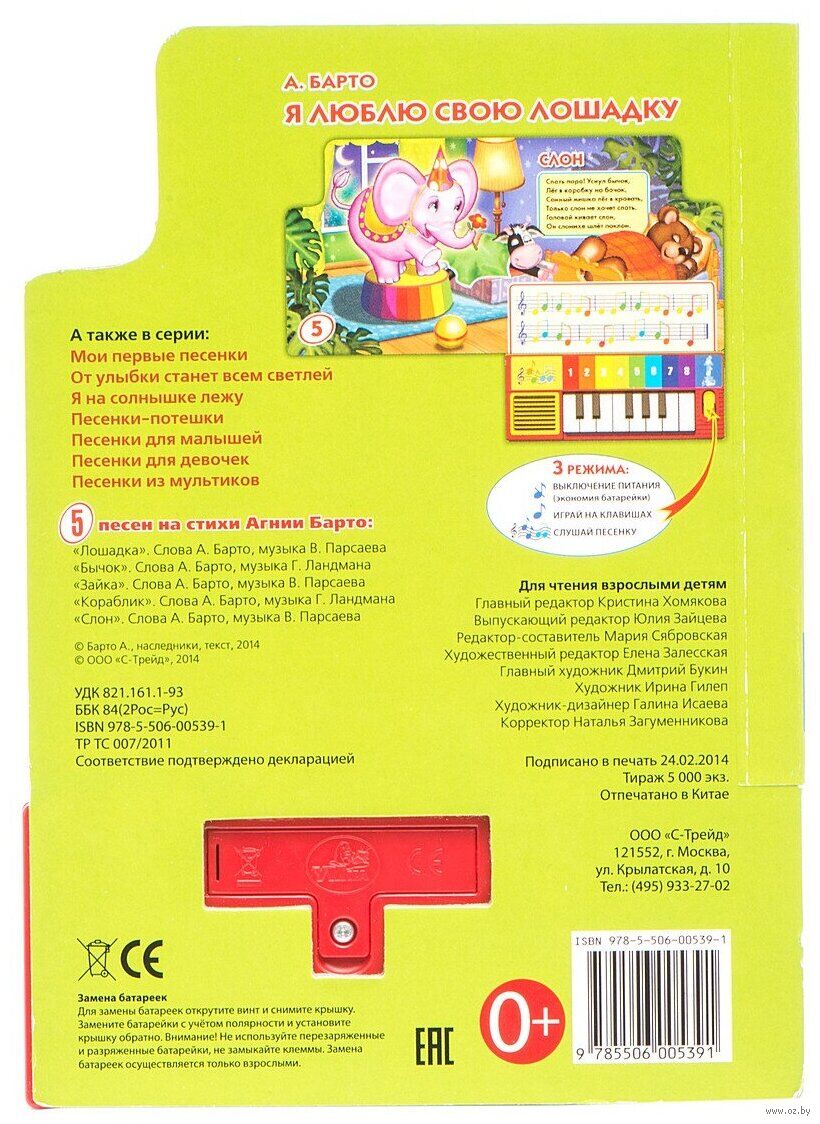 Ваш малыш ещё неуверенно говорит, но уже пробует петь? Тогда эти замечательные книги-пианино сделаны специально для него. Пять любимых песенок не оставят равнодушным маленького непоседу. Книга-пианино "Я люблю свою лошадку" сборник стихов А. Барто, приведет в восторг Вашего малыша. Ведь в книги не только тексты песен из мультфильма, но и клавиши. С помощь их можно сыграть мелодию самому или прослушать песенки: "Лошадка" (слова А. Барто, музыка В. Парсаева), "Бычок" (слова А. Барто, музыка Г. Ландмана), "Зайка" (слова А. Барто, музыка В. Парсаева), "Кораблик" (слова А. Барто, музыка Г. Ландмана), "Слон" (слова А. Барто, музыка В. Парсаева). Книга имеет 3 режима: выключение питания, игра на клавишах (с помощью подсказак на страницах книги), слушай песенку. Так же малышу будет интересно рассматривать яркие, красочные иллюстрации на страницах. Здесь он встретит всех герое мультфильма, сыграет с ними, а может даже спеть. Развивает слух, моторику, чувство ритма, память, фантазию.