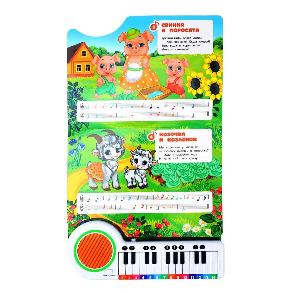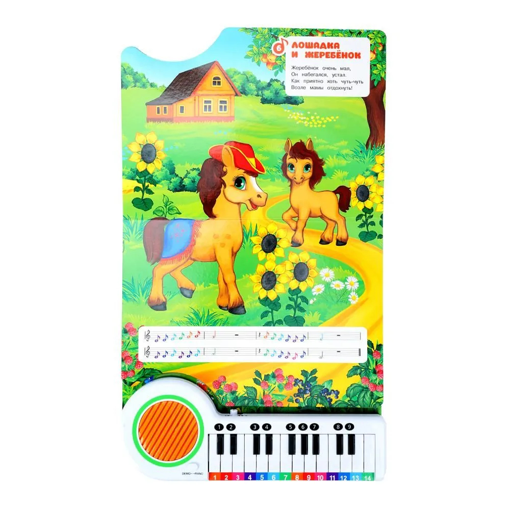 На каждой страничке это занимательной книги ребёнка ждут яркие иллюстрации, стихи известного детского автора Марины Дружининой и ноты к песенкам. При нажатии на кнопку слева от клавиш происходит переключение на режим проигрывания песен, при втором нажатии – переключение на пианино. В режиме пианино маленький музыкант, нажимая на клавиши, сможет наиграть по нотам-подсказкам песенки из книги или придумать свои собственные мелодии. Книга сделана из плотного картона, поэтому мамы могут не опасаться, что ребёнок порвёт странички.
