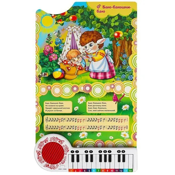 На каждой страничке это занимательной книги ребёнка ждут красивые иллюстрации, тексты потешек и ноты к песенкам. При нажатии на кнопку слева от клавиш происходит переключение на режим проигрывания песен, при втором нажатии – переключение на пианино. В режиме пианино маленький музыкант, нажимая на клавиши, сможет наиграть по нотам-подсказкам песенки из книги или придумать свои собственные мелодии. Книга сделана из плотного картона, поэтому мамы могут не опасаться, что ребёнок порвёт странички.