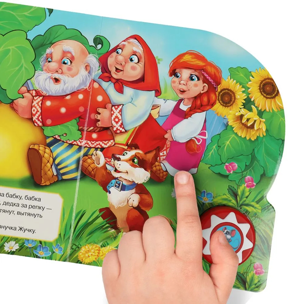 Музыкальная книжка "Репка" содержит 10 песен и текст любимой сказки. На каждой страничке крупные красивые иллюстрации. Малыш с удовольствием будет рассматривать красочные, яркие странички с героями, слушать песни, подпевать и даже танцевать. Ребёнок легко освоит включение звука: по нажатию на кнопку начинает проигрываться песенка, при втором нажатии звук выключится. Нажав на кнопку ещё раз, ребёнок услышит следующую песню. Композиции исполняются профессиональными артистами. Книжка сделана из плотного картона, поэтому мамы могут не опасаться, что ребёнок порвёт странички или поранит пальчики. Запоминая песенки, ребёнок потренируют память. Книжка развивает фантазию, образное мышление, музыкальный слух, внимание и логику.