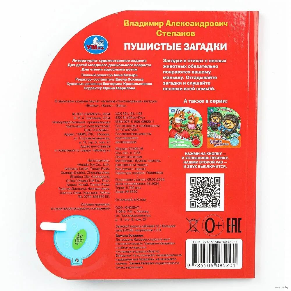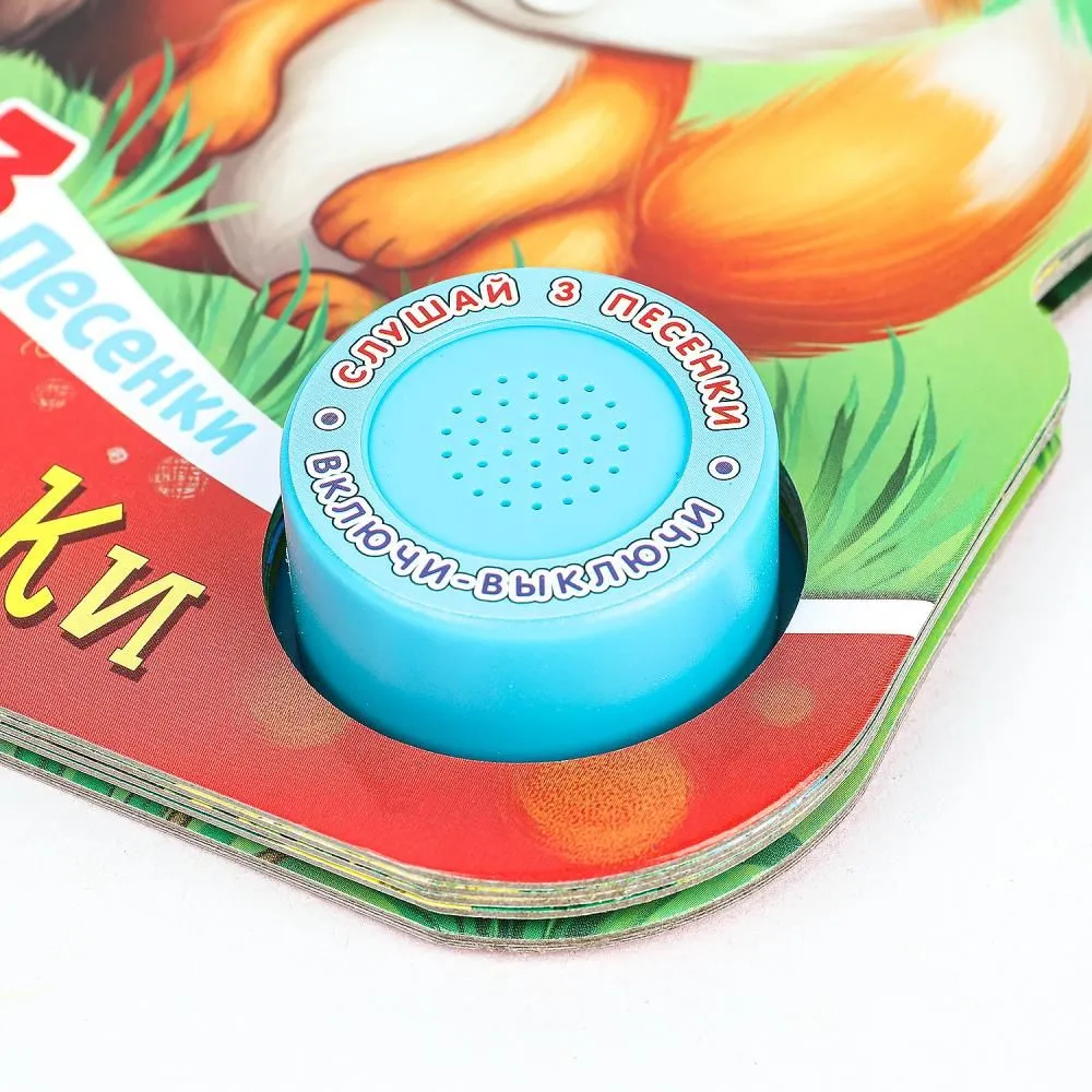 Малыш с удовольствием будет листать плотные страницы, рассматривать красочные картинки и отгадывать занимательные загадки про животных. Ребёнок легко освоит включение звука: по нажатию на кнопку песенка включится, при втором нажатии выключится, при третьем – заиграет следующая композиция и т.д. Благодаря компактному размеру книгу удобно взять с собой в дорогу.