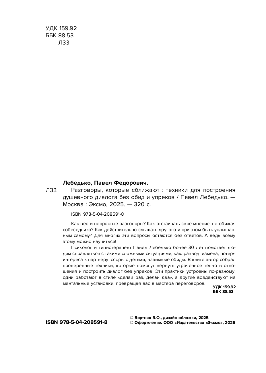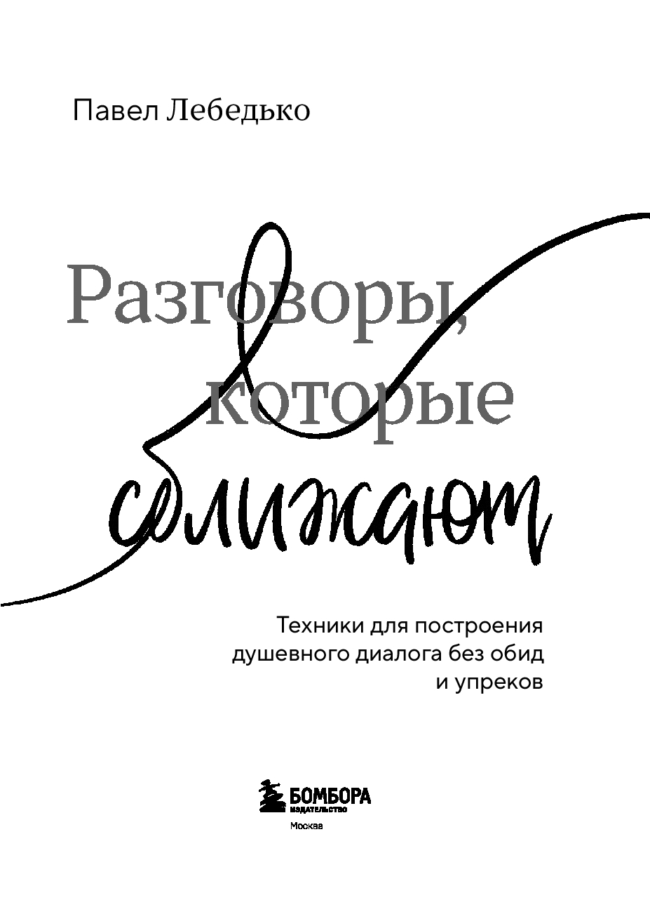 Психолог и гипнотерапевт Павел Лебедько более 30 лет помогает людям справляться с такими сложными ситуациями, как: развод, измена, потеря интереса к партнеру, ссоры с детьми, взаимные обиды. В книге автор собрал проверенные техники, которые помогут вернуть утраченное тепло в отношения и построить диалог без упреков. Эти практики устроены по-разному: одни работают в стиле "делай раз, делай два", а другие воздействуют на ментальные установки, превращая вас в мастера переговоров.