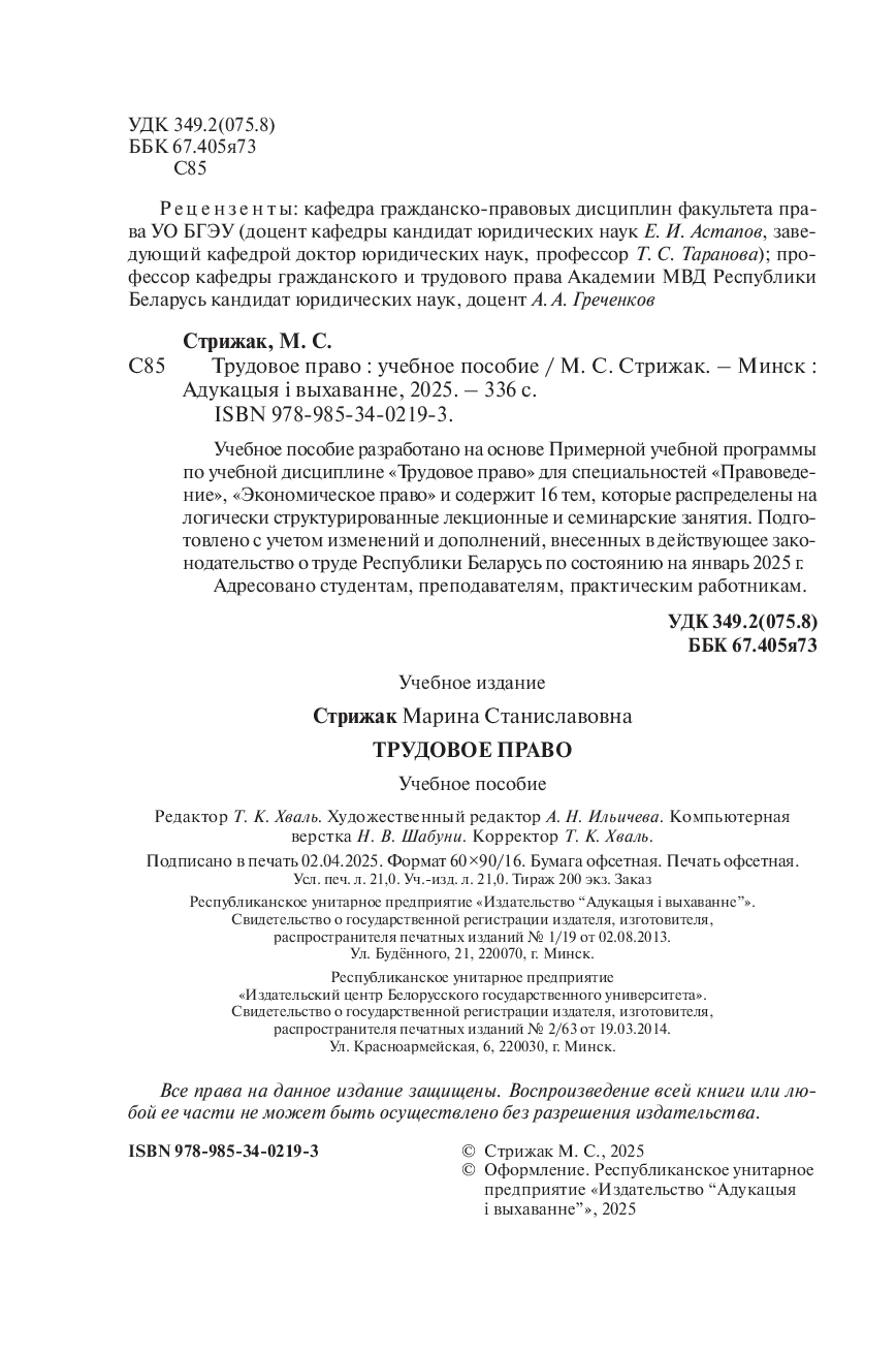 Учебное пособие разработано на основе Примерной учебной программы по учебной дисциплине "Трудовое право" для специальностей "Правоведение", "Экономическое право" и содержит 16 тем, которые распределены на логически структурированные лекционные и семинарские занятия. Подготовлено с учетом изменений и дополнений, внесенных в действующее законодательство о труде Республики Беларусь по состоянию на январь 2025 г.