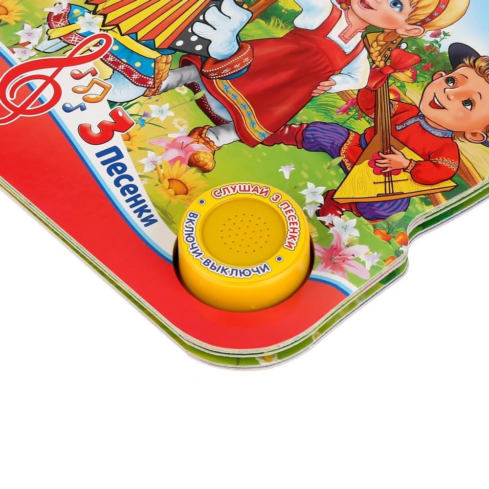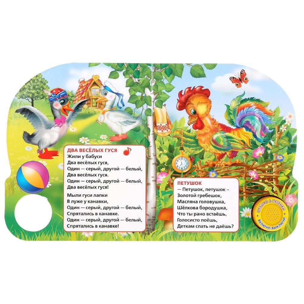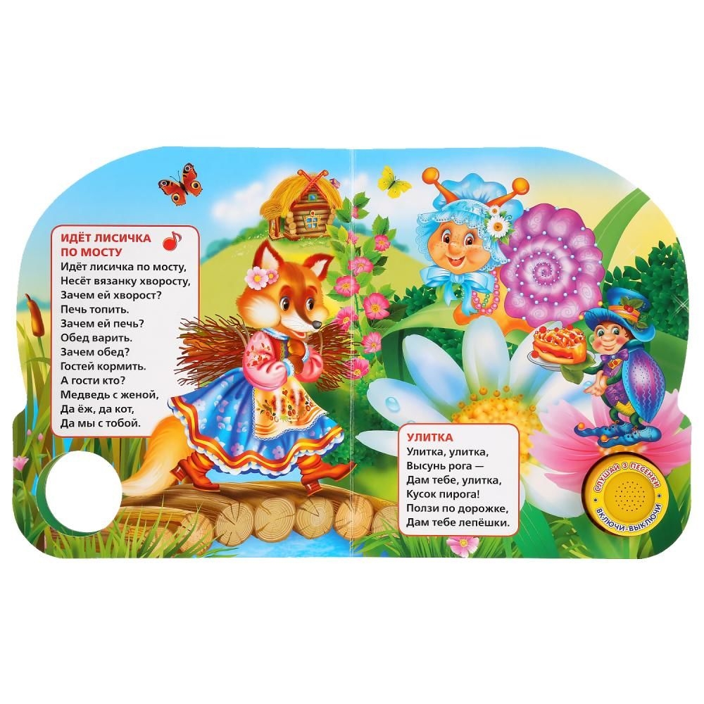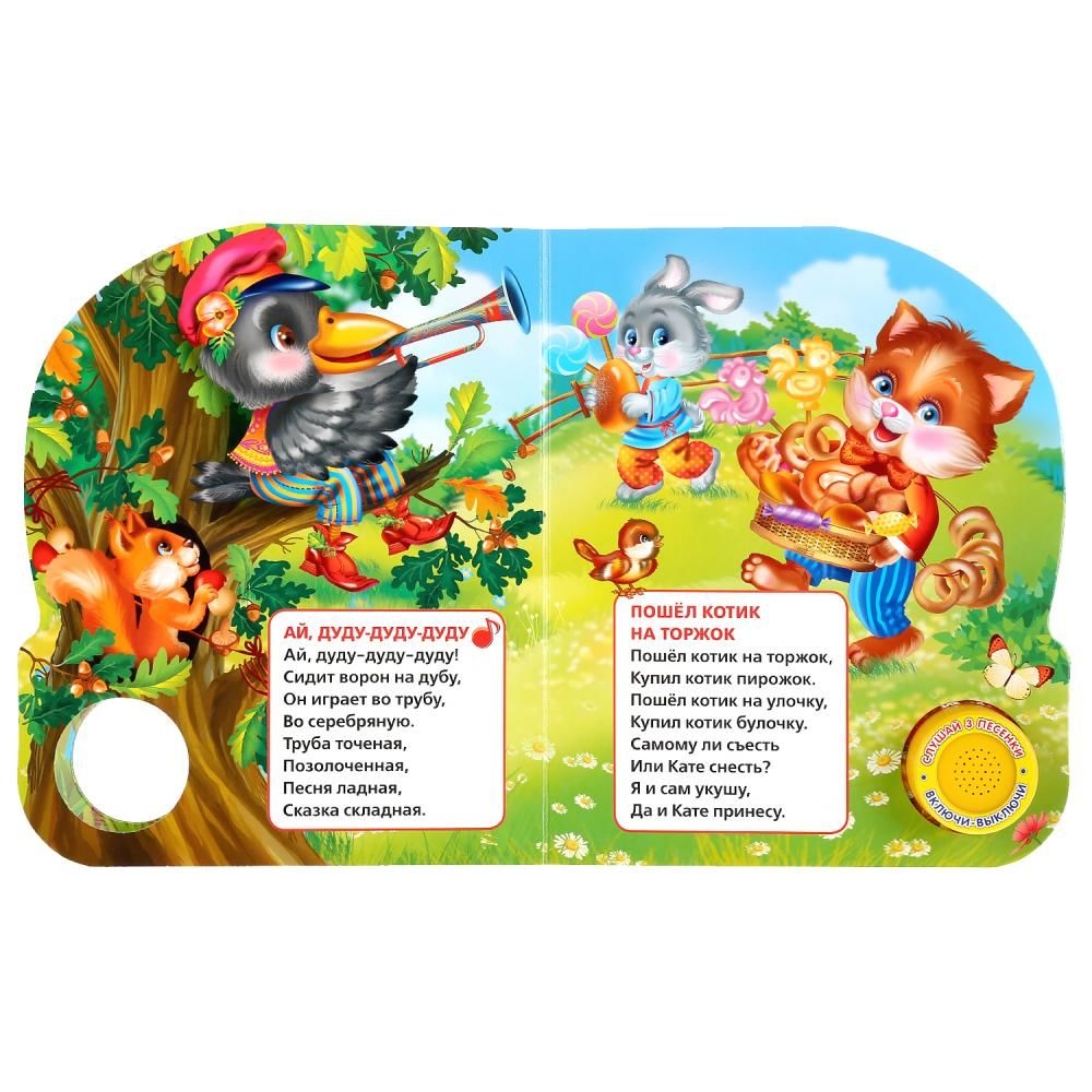 Нажми на кнопку – и услышишь песенку. Нажми второй раз – и звук выключится. Потешки, яркие иллюстрации и песенки сделают обучение чтению увлекательным занятием. Ребёнок легко освоит включение звука: по нажатию на кнопку звук включится, при втором нажатии выключится.