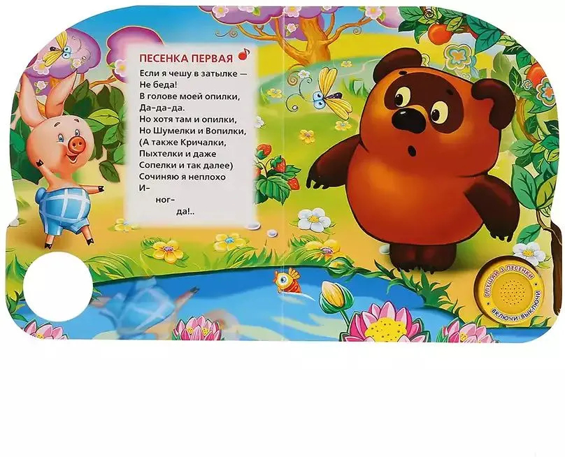 Ребёнок с удовольствием будет листать плотные страницы, рассматривать красочные картинки с изображением героев любимого м/ф и, конечно, нажимать на кнопку и слушать весёлые песенки. Малыш легко освоит включение звука: по нажатию на кнопку песенка включится, при втором нажатии выключится, при третьем – заиграет следующая композиция. Благодаря компактному размеру книгу удобно взять с собой в дорогу.