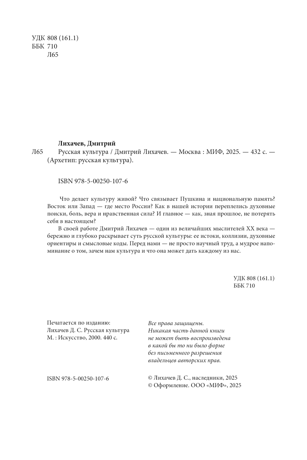 "Русская культура" – последняя, изданная посмертно книга выдающегося русского ученого-филолога, академика Дмитрия Лихачева. Это его "завещание", итог многолетних размышлений о русской и мировой культуре – и о самой России: удивительной, двойственной и во всем ищущей крайности...