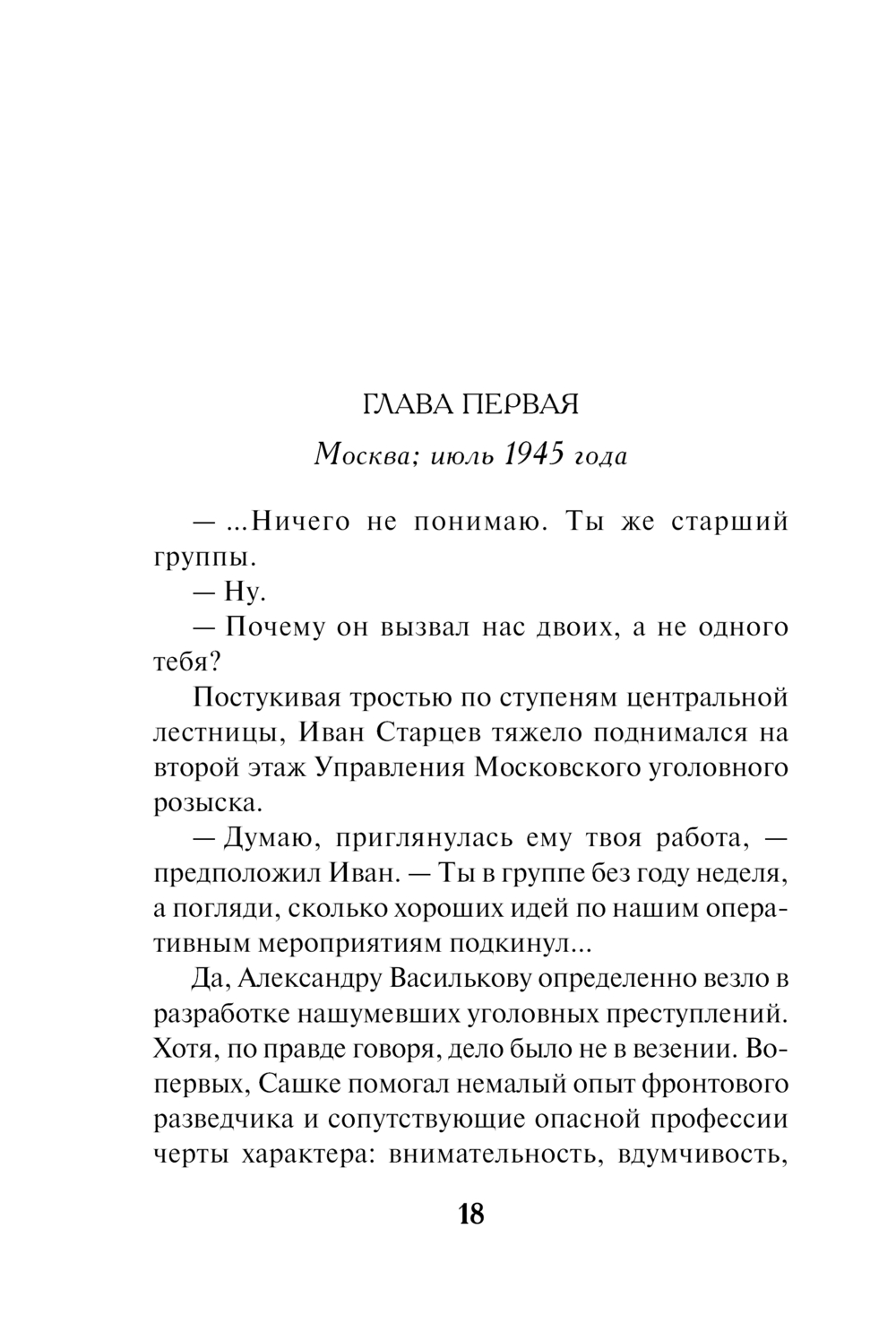 Лето 1945 года. За короткий срок в Москве совершено четыре похожих убийства. Все жертвы, мужчины примерно одного возраста, убиты точным ударом ножа в шею и ограблены. Сыщики МУРа Иван Старцев и Александр Васильков уверены, что искать нужно матерого преступника, имеющего специальную подготовку. Не исключено, что это фашистский диверсант, затаившийся в нашем тылу... Выйти на след убийцы оперативникам помогает небольшая семейная реликвия, ставшая настоящим проклятьем старинного дворянского рода...