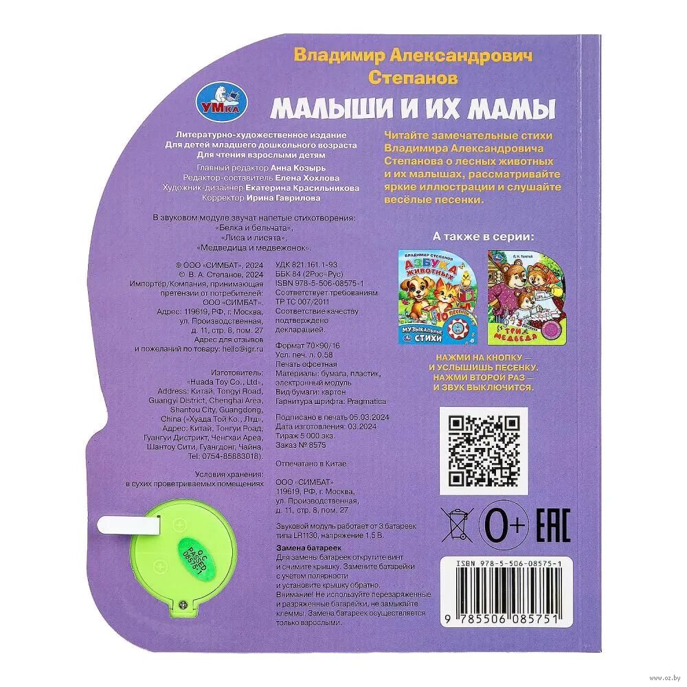 Малыш с удовольствием будет листать плотные страницы, рассматривать красочные картинки, вместе с родителями читать и слушать добрые стихи про животных. Ребёнок легко освоит включение звука: по нажатию на кнопку песенка включится, при втором нажатии выключится, при третьем – заиграет следующая композиция и т.д. Благодаря компактному размеру книгу удобно взять с собой в дорогу.