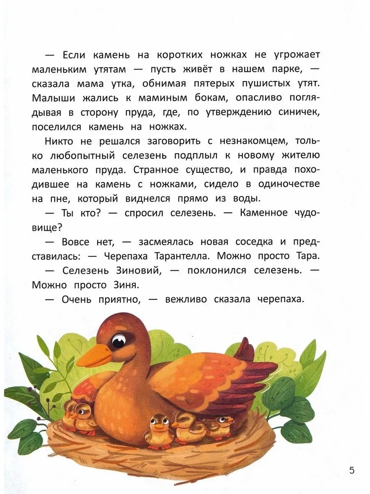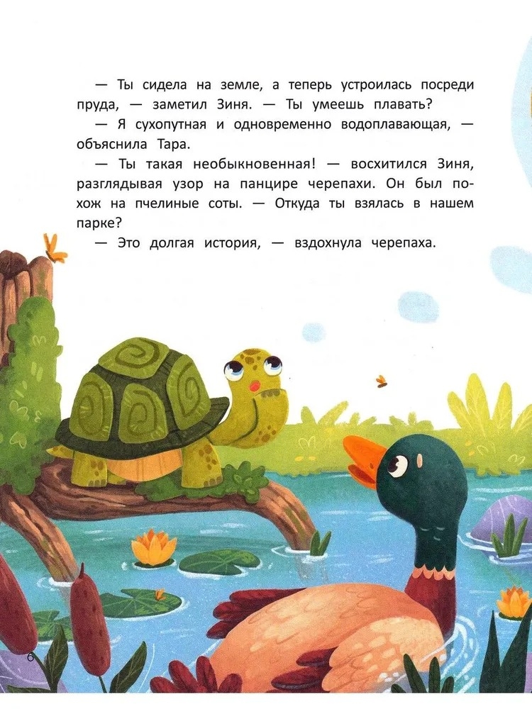 Однажды в самом обыкновенном городском парке появился необычный житель. Синички думают, что это монстр. Но храбрый селезень Зиня решает выяснить, кто это загадочное существо. Вместе с другими жителями парка он узнает многое о новой соседке – черепашке Таре: о местах, где она жила, и её удивительном путешествии. Получится ли у обитателей парка принять Тару в свою дружную компанию?
