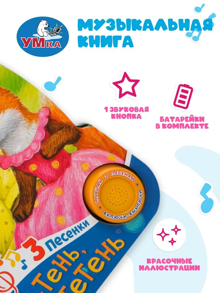 Ребёнок с удовольствием будет листать плотные страницы, рассматривать красочные картинки и, конечно, нажимать на кнопку и слушать задорные песенки-потешки. Малыш легко освоит включение звука: по нажатию на кнопку песенка включится, при втором нажатии выключится, при третьем – заиграет следующая композиция. Благодаря компактному размеру книгу удобно взять с собой в дорогу.