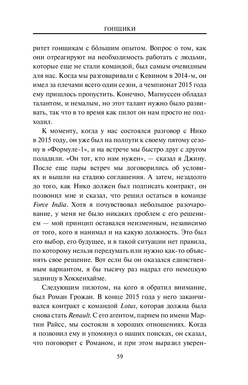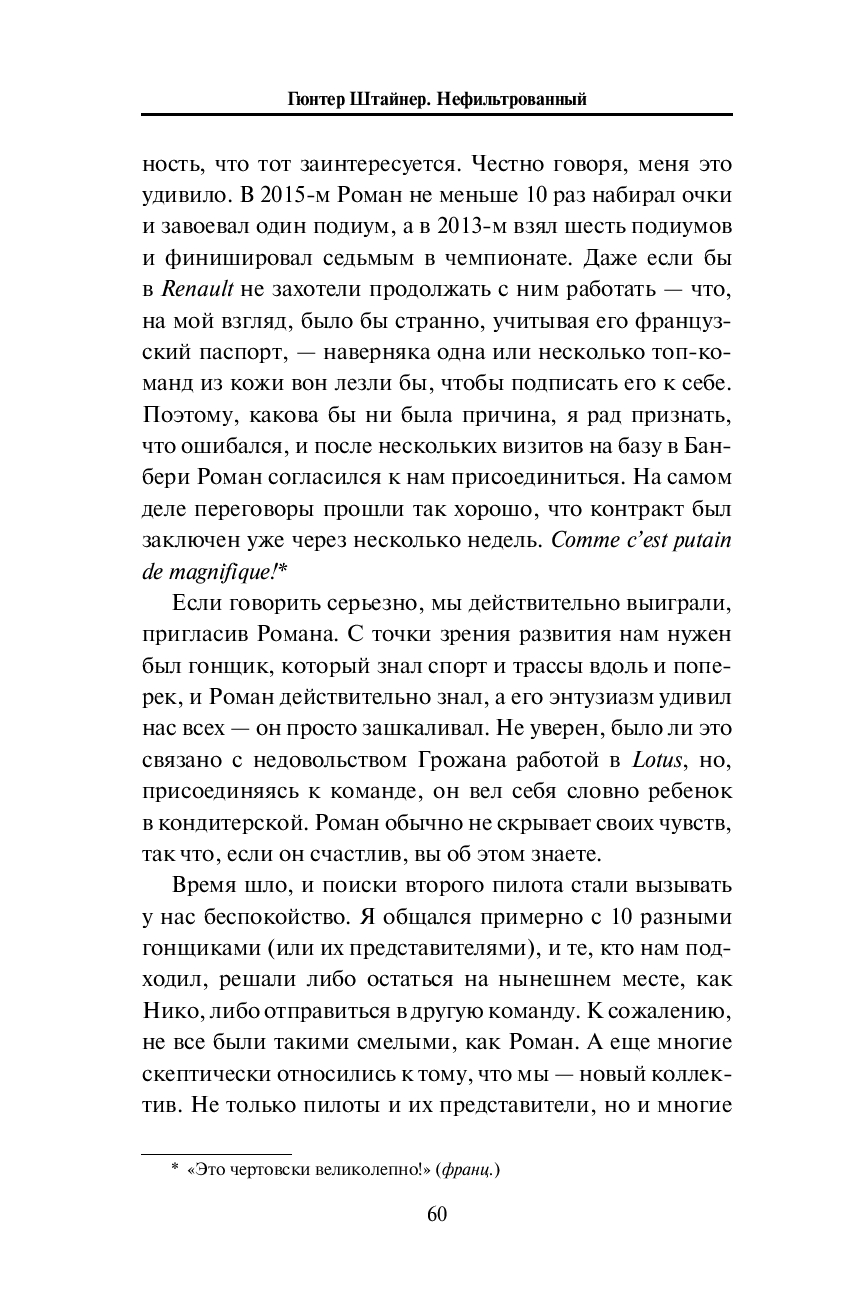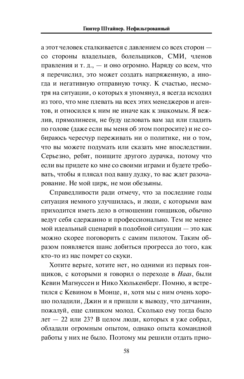 Гюнтер Штайнер погружает в детали работы с командой-аутсайдером и сложности развития болида, откровенно рассказывает о взаимодействии с FIA, об отношениях с руководителями команд, собственными гонщиками (в частности, с Романом Грожаном), русским бизнесом – и, конечно же, не упускает возможности сказать пару ласковых Джину Хаасу.