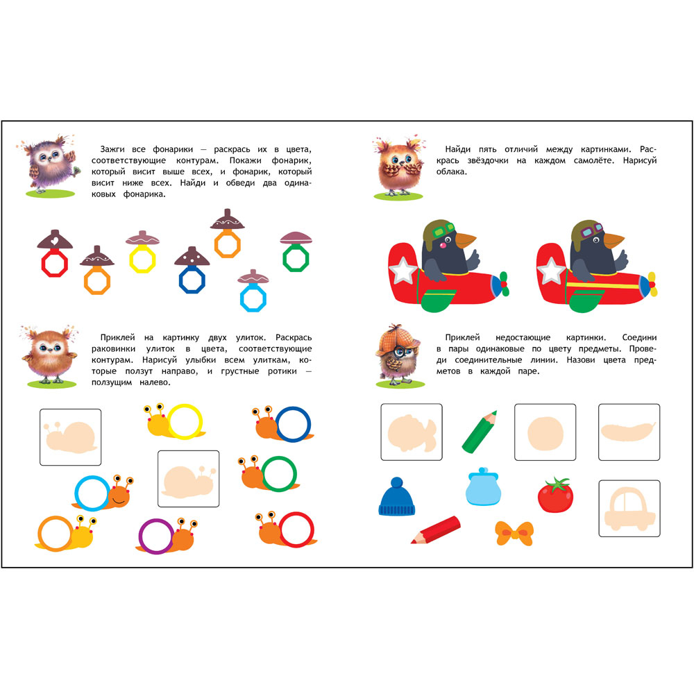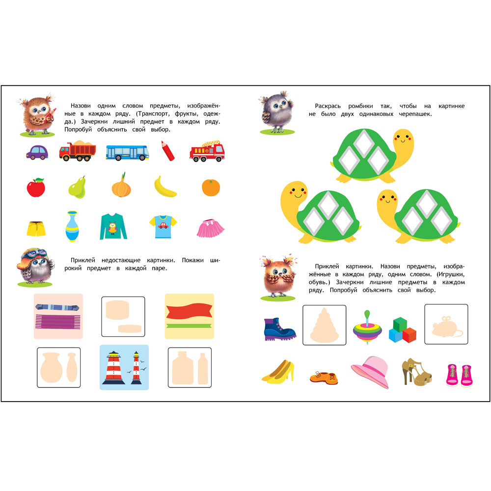 Упражнения на формирование и развитие этих умений собраны в данном пособии. Лист с наклейками, необходимыми для выполнения заданий, находится в середине книги.