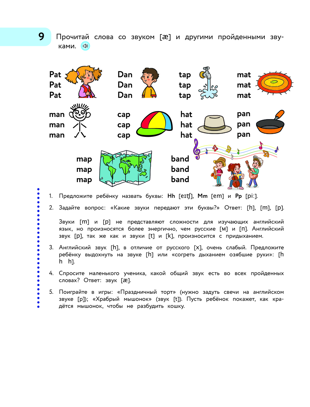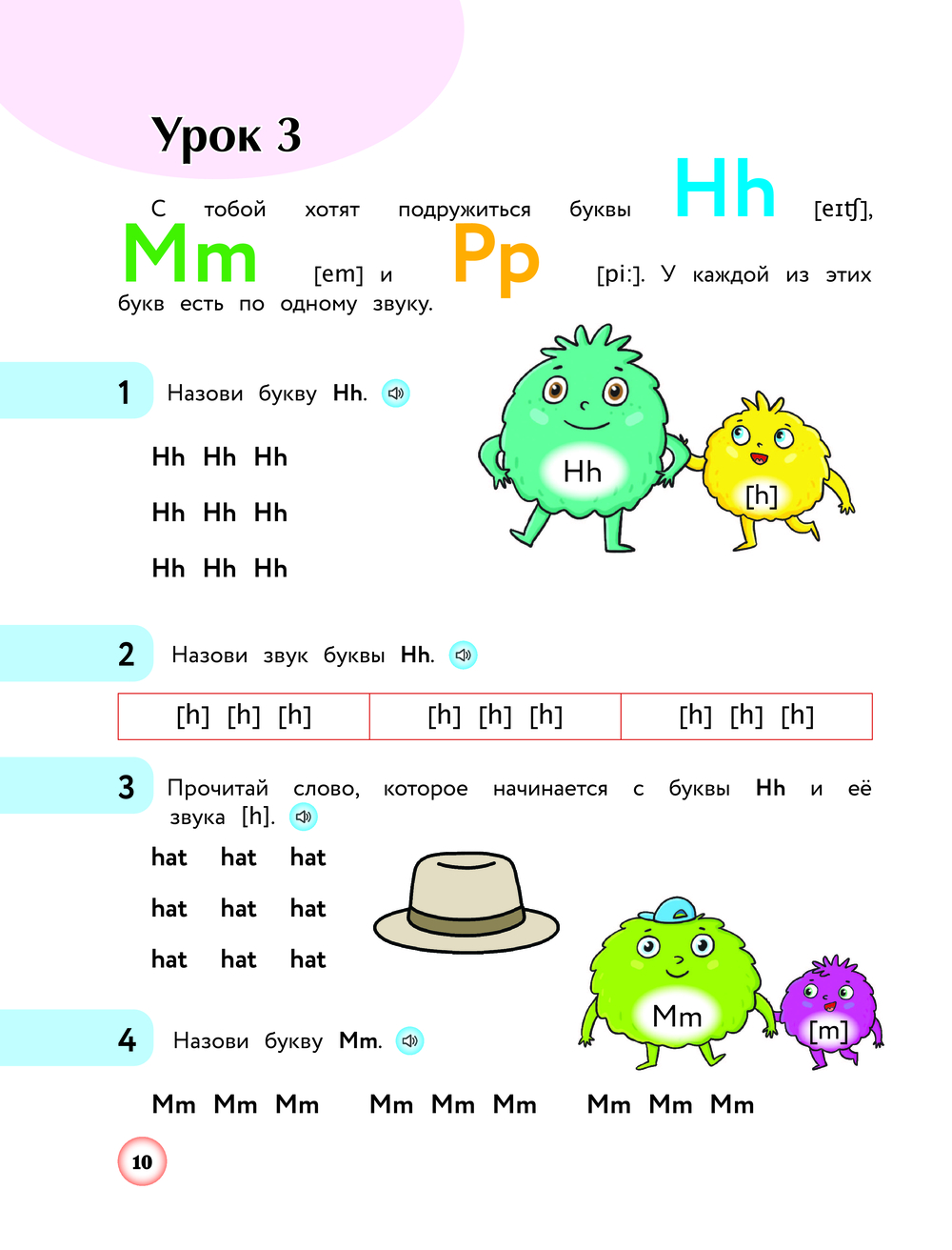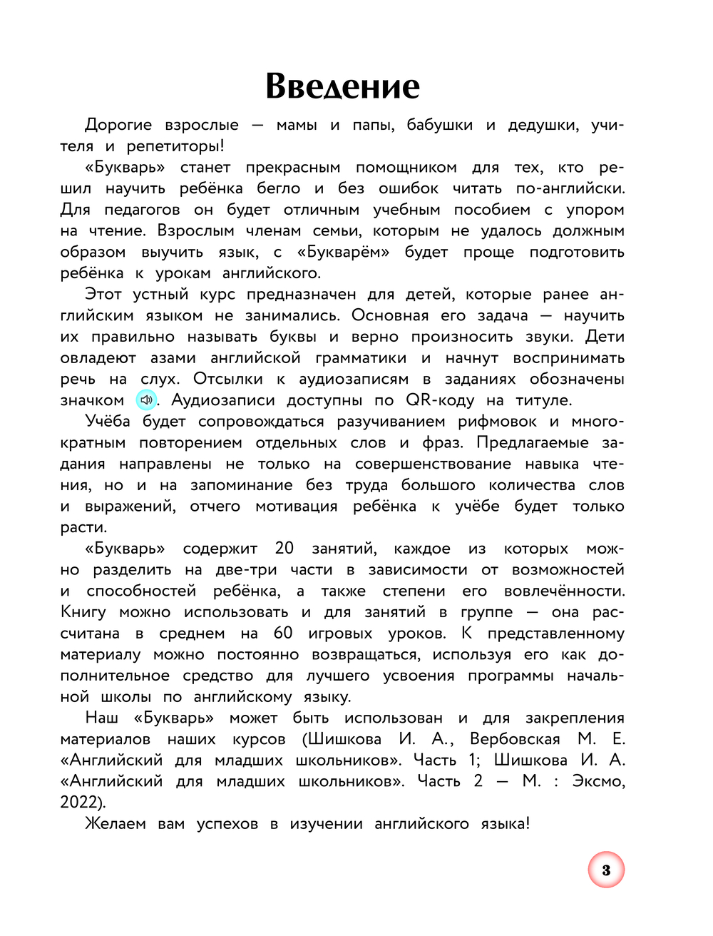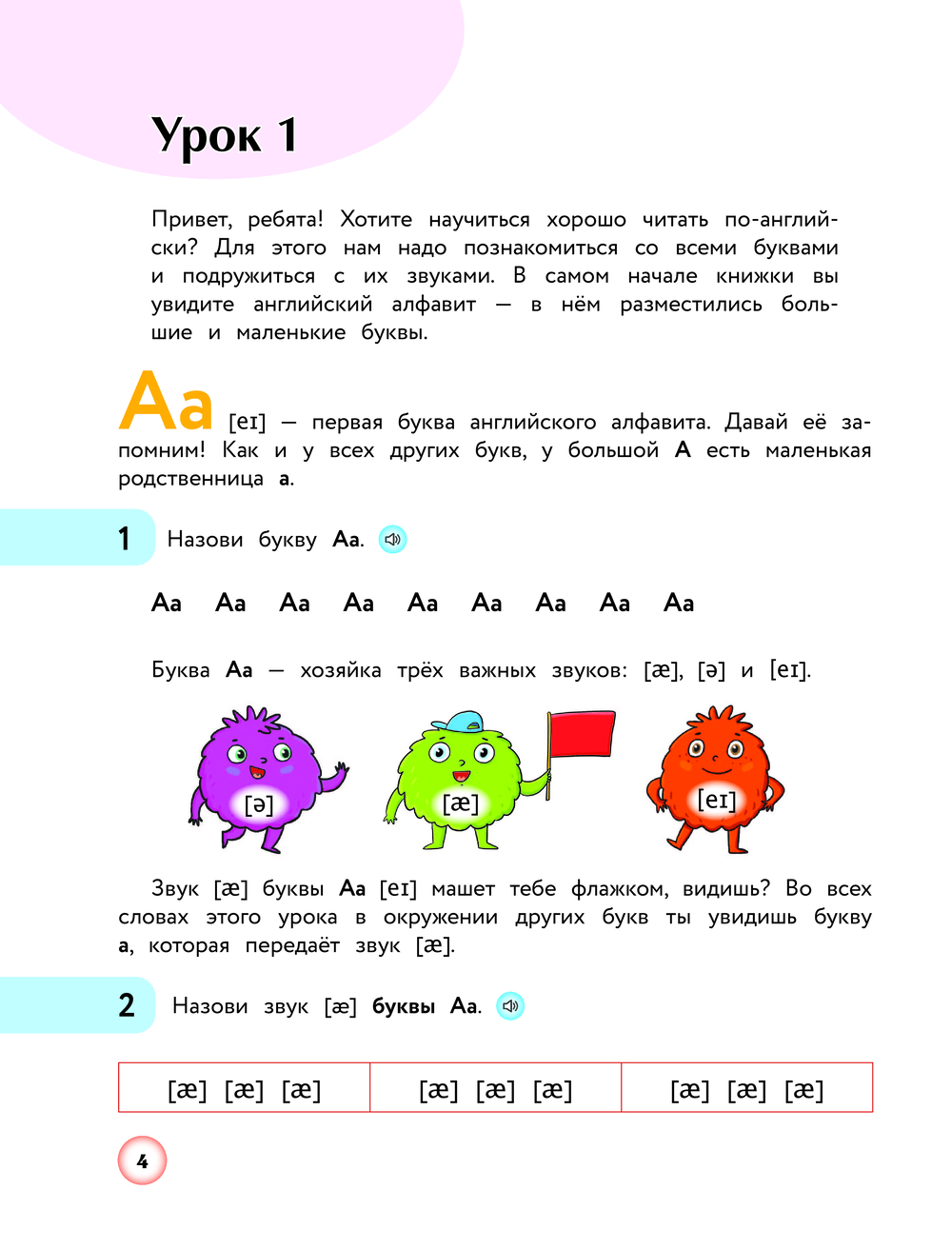 Задания сопровождаются аудиозаписями, чтобы с первых шагов у ребёнка вырабатывалось правильное произношение. Аудиофайлы доступны по QR-коду на титульном листе.