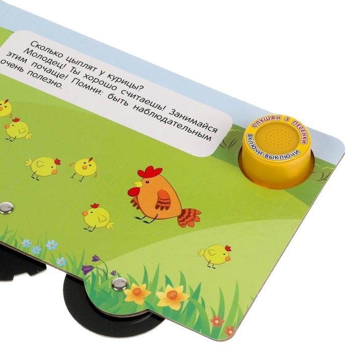 Ребёнок с удовольствием будет листать плотные страницы, рассматривать яркие картинки и вместе с родителями читать интересные стихи. А если нажать на кнопку-лапку, она будет воспроизводить весёлые песенки и красиво светиться при этом. Малыш легко освоит включение звука: по нажатию на кнопку песенка включится, при втором нажатии выключится. Благодаря компактному размеру книгу удобно брать с собой в дорогу.