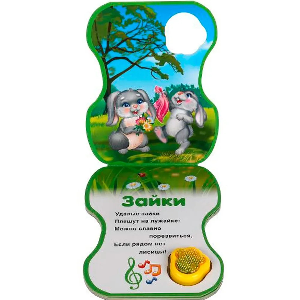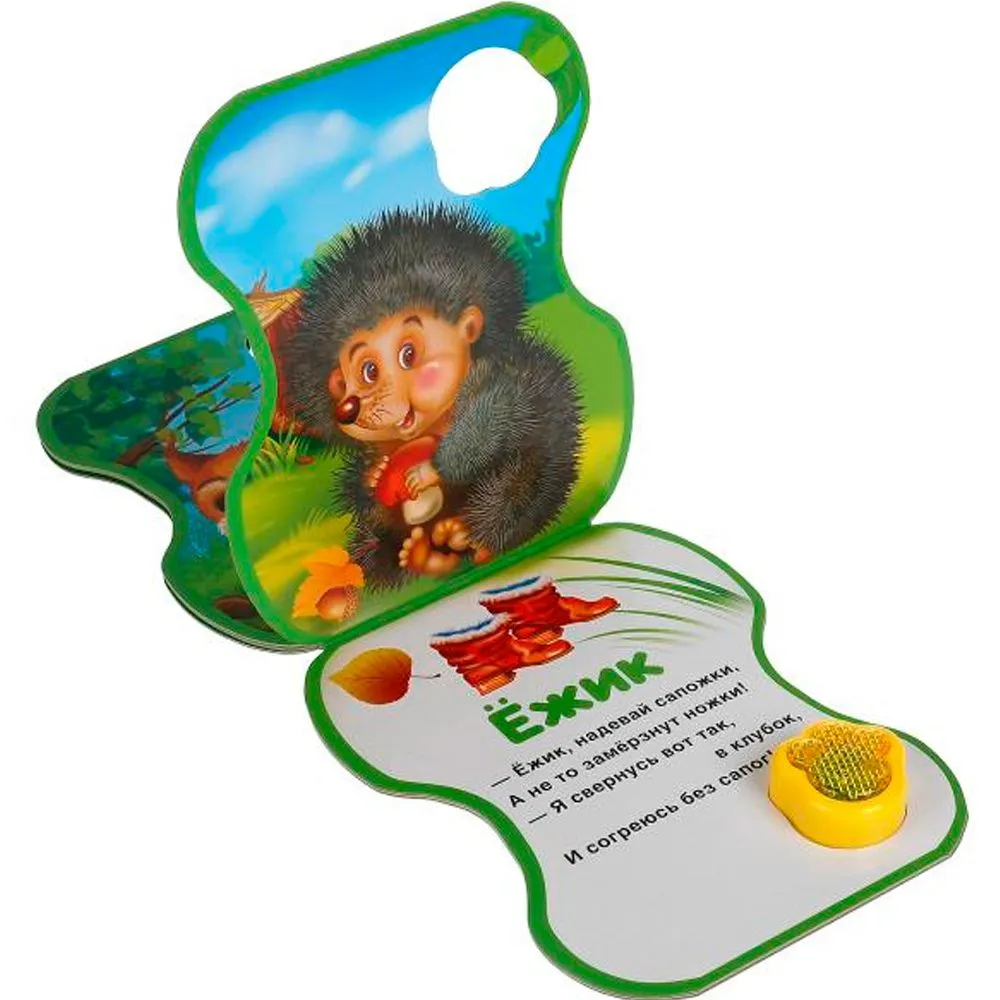 Ребёнок с удовольствием будет листать плотные страницы, рассматривать яркие картинки и вместе с родителями читать интересные стихи. А если нажать на кнопку-лапку, она будет воспроизводить весёлые песенки и красиво светится при этом. Малыш легко освоит включение звука: по нажатию на кнопку песенка включится, при втором нажатии выключится. Благодаря компактному размеру книгу удобно брать с собой в дорогу.