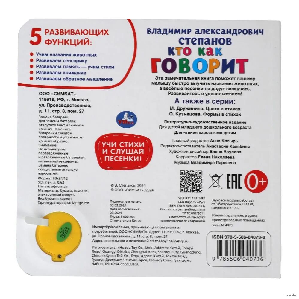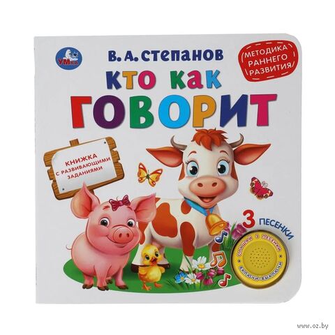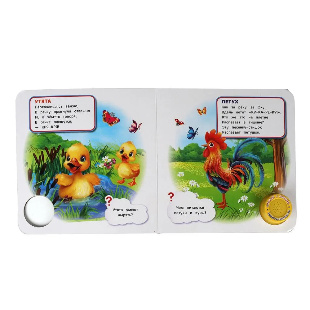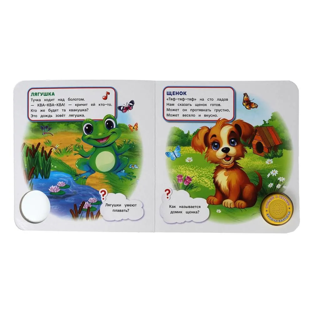 Эта занимательная книга в игровой форме познакомит ребёнка с разными животными и их голосами. Он с радостью будет рассматривать яркие картинки, учить интересные стихи, нажимать на кнопку и слушать весёлые песенки. Запомнить новую информацию помогут также специальные вопросы в конце каждой страницы. Малыш легко освоит включение звука: по нажатию на кнопку включится первая песенка, при втором нажатии выключится, в 3-ий раз – заиграет следующая и т.д. Благодаря компактному формату книгу удобно взять с собой в дорогу.