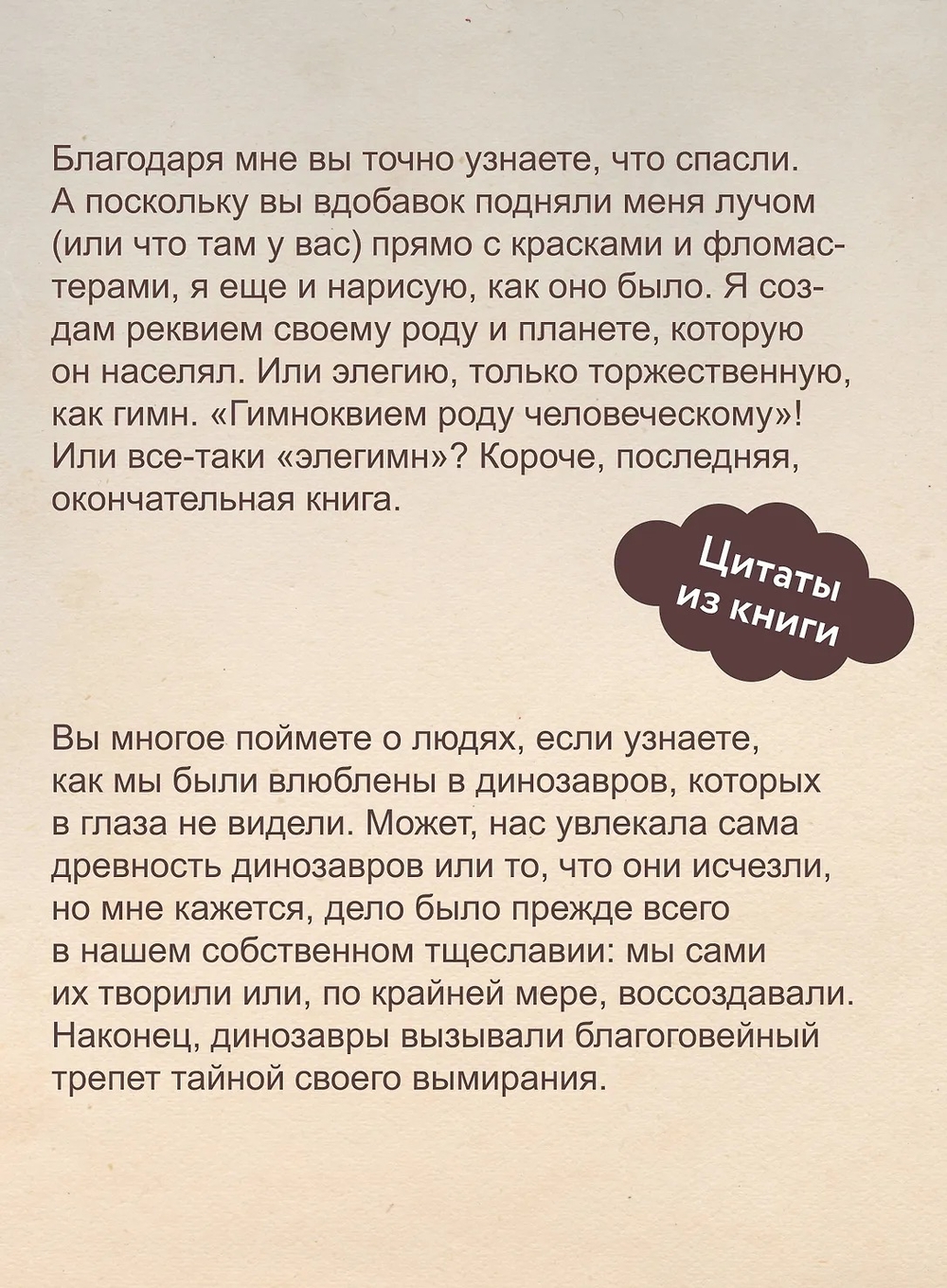 Сотни детализированных, ярких иллюстраций, лабиринт историй, загадок и культурных отсылок – как в тексте, так и в визуале. Комментарии Ноя – остроумные, интеллектуальные, полные гордости за достижения цивилизации – и в то же время горечи утраты. Сочетая в себе дневник, энциклопедию и книгу по истории и искусству, The Last Book становится гимном человеческому духу.