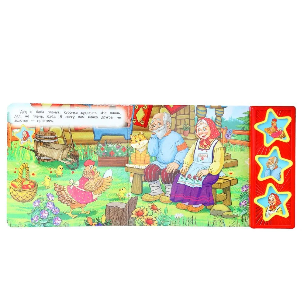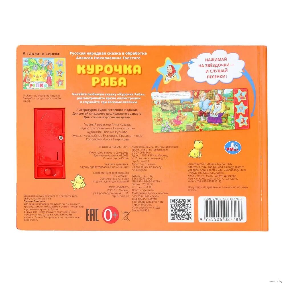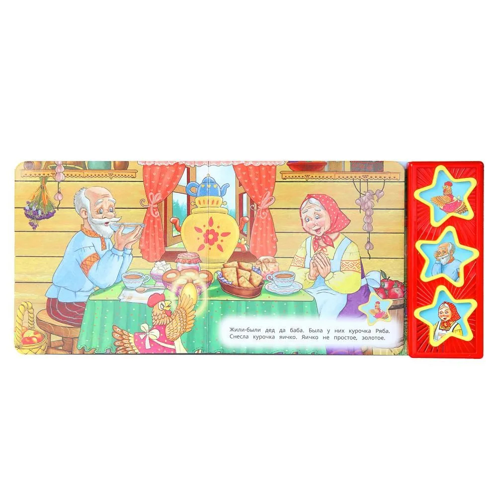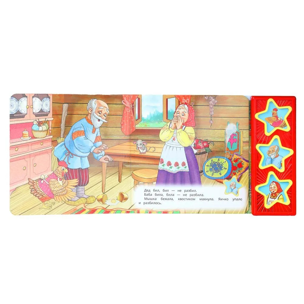 Малыш будет с удовольствием рассматривать яркие картинки, читать вместе с родителями известную русскую народную сказку и слушать песенки по её мотиву. Ребёнок легко освоит включение звука: по нажатию на кнопку звук включится, при втором нажатии выключится. Книжка сделана из плотного картона, поэтому родители могут не опасаться за её сохранность. Благодаря компактному формату её удобно брать с собой в путешествия.