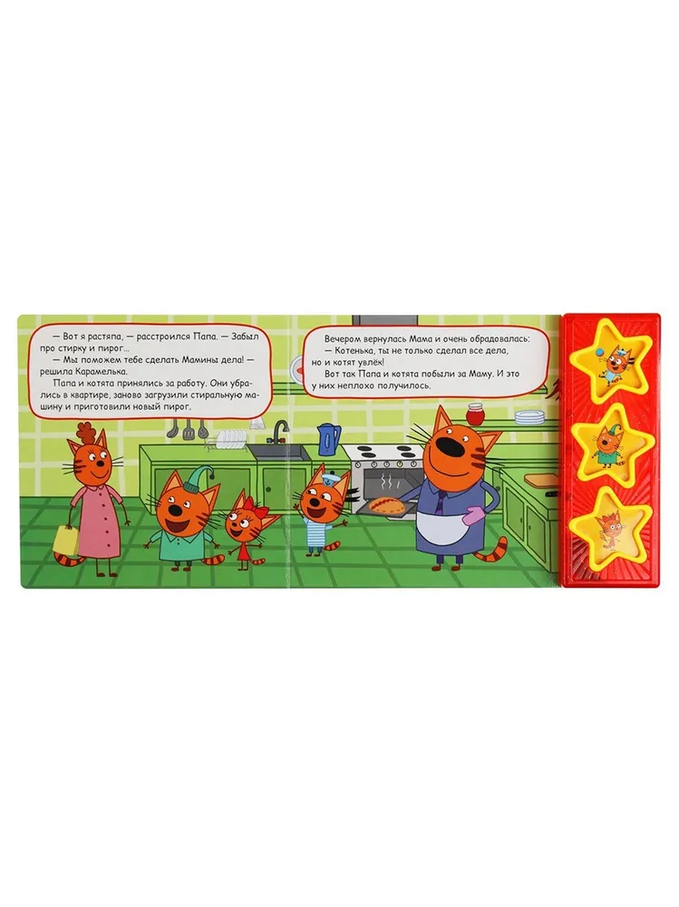 Ребёнок с удовольствием будет листать плотные страницы, рассматривать яркие картинки, вместе с родителями читать про приключения любимых персонажей и, конечно, нажимать на кнопки и слушать весёлые песенки.