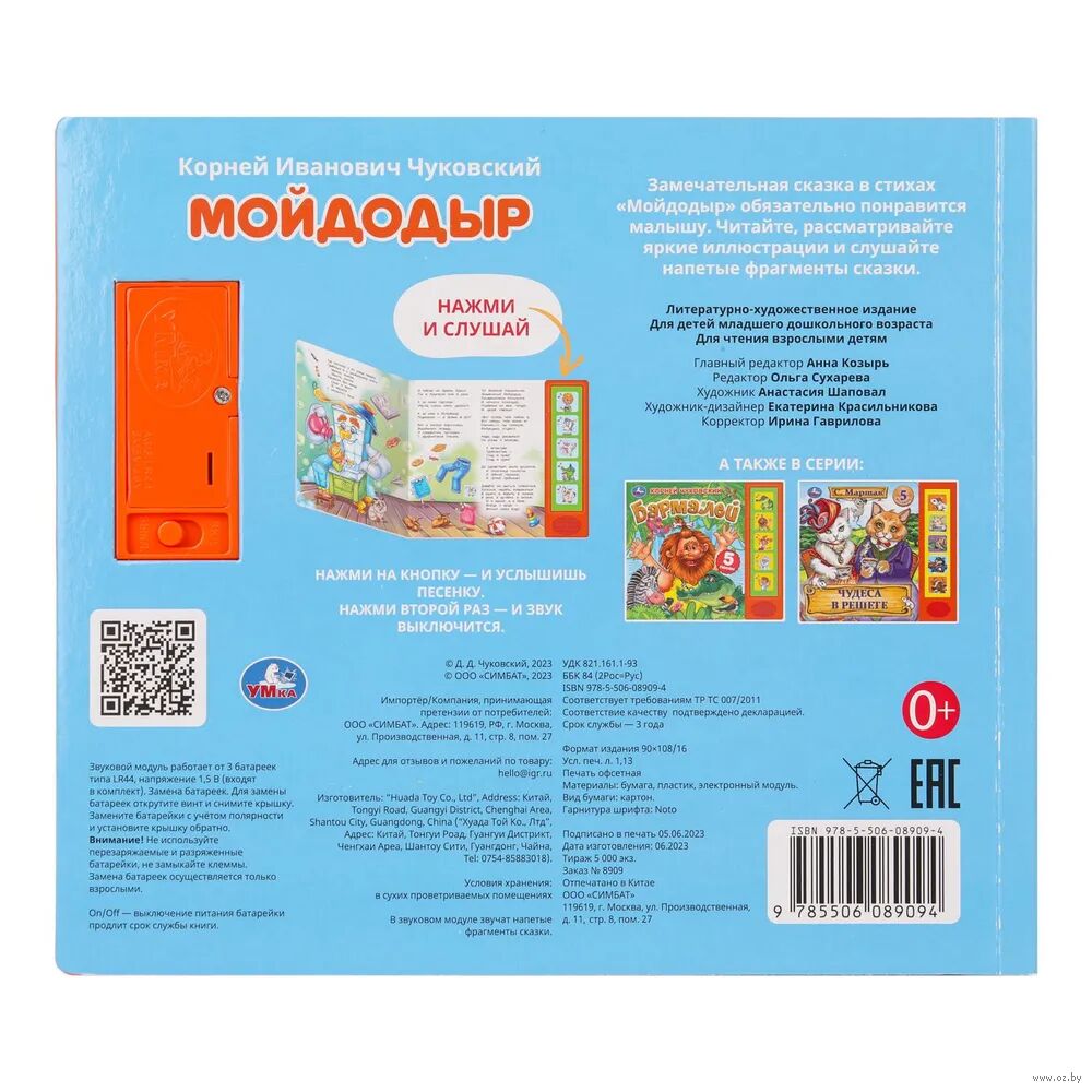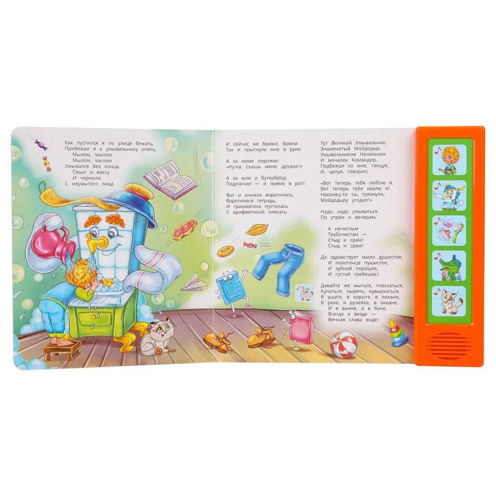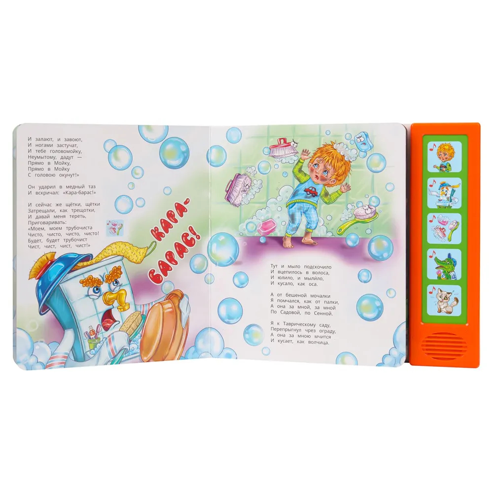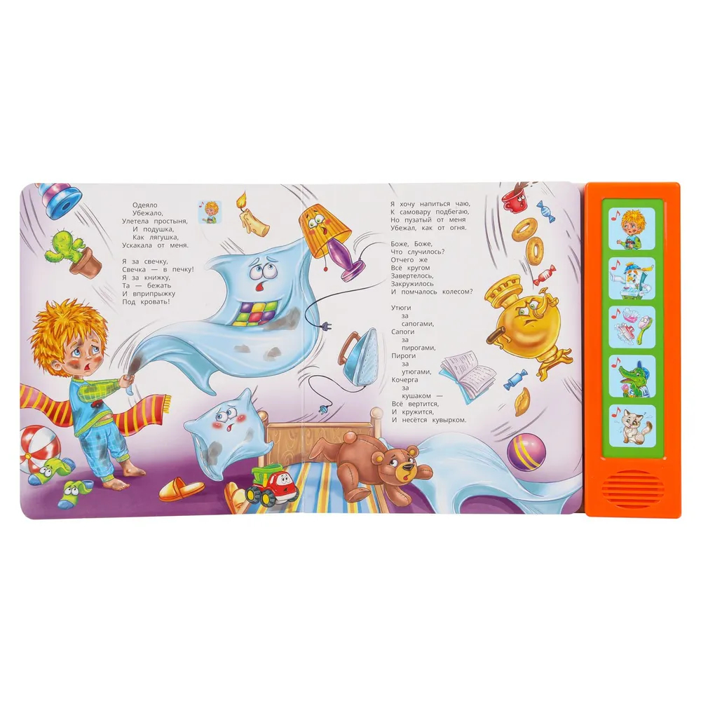 Ребёнок с удовольствием будет листать плотные страницы, рассматривать яркие картинки, нажимать на кнопки и слушать напетые фрагменты известной стихотворной сказки Корнея Чуковского. Малыш легко освоит включение звука: по нажатию на кнопку звук включится, при втором нажатии выключится. Благодаря компактному размеру книгу удобно брать с собой в дорогу.