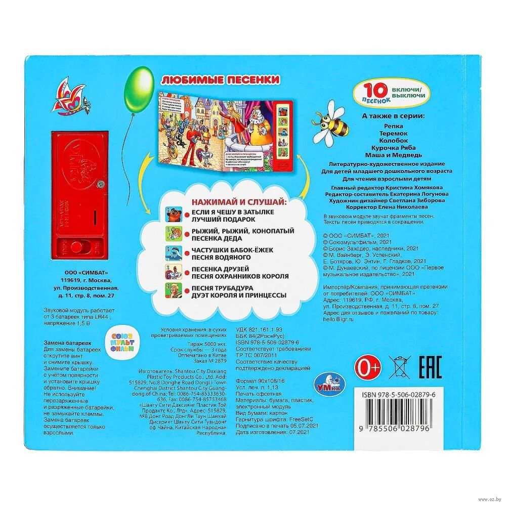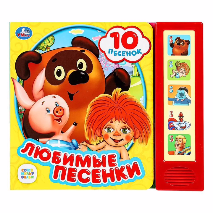 Ребёнок с удовольствием будет листать плотные страницы, рассматривать яркие картинки с изображением любимых мультгероев и, конечно, нажимать на кнопки и слушать весёлые песенки. Малыш легко освоит включение звука: по нажатию на кнопку песенка включится, при втором нажатии выключится, при третьем – заиграет следующая композиция. На каждой кнопке по 2 музыкальных фрагмента. Благодаря компактному размеру книгу удобно взять с собой в дорогу.