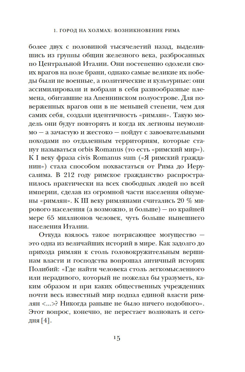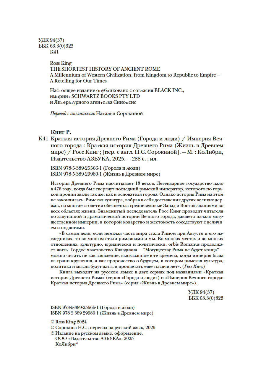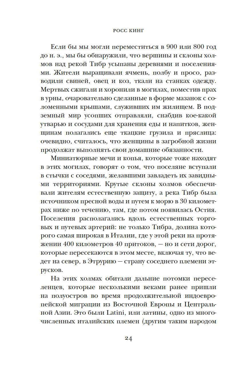 История Древнего Рима насчитывает 13 веков. Легендарное государство пало в 476 году, когда был свергнут последний римский император, которого по горькой иронии звали так же, как и основателя города. Однако история Рима на этом не закончилась. Римская культура, вобрав в себя достижения других великих держав, на многие столетия обеспечила средневековые Запад и Восток знаниями во всех областях жизни. Знаменитый исследователь Росс Кинг проводит читателя по запутанной и драматической истории вечного города, давшего начало могущественной империи, в которой коварство и жестокость соседствуют с величием и подвигами.
