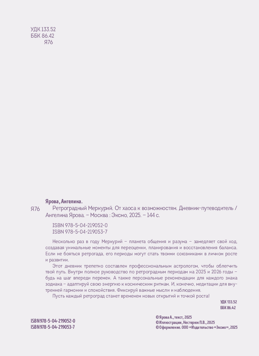 Этот дневник трепетно составлен профессиональным астрологом, чтобы облегчить твой путь. Внутри полное руководство по ретроградным периодам на 2025 и 2026 годы – будь на шаг впереди перемен. А также персональные рекомендации для каждого знака зодиака – адаптируй свою энергию к космическим ритмам. И, конечно медитации для внутренней гармонии и спокойствия. Фиксируй важные мысли и наблюдения